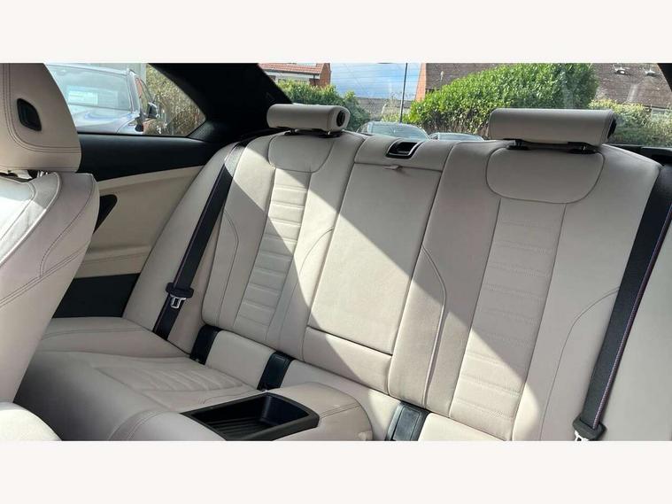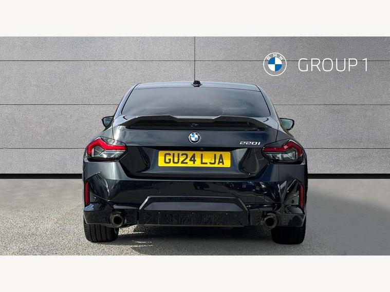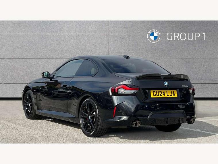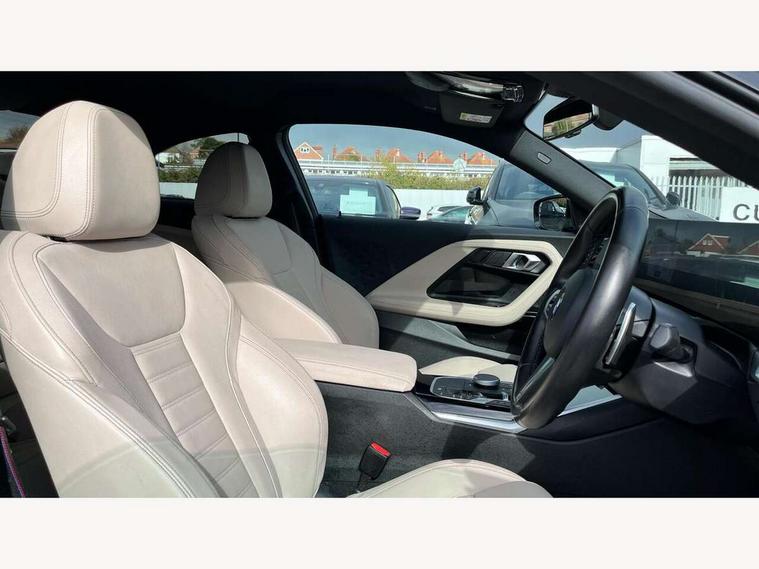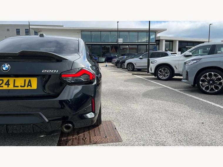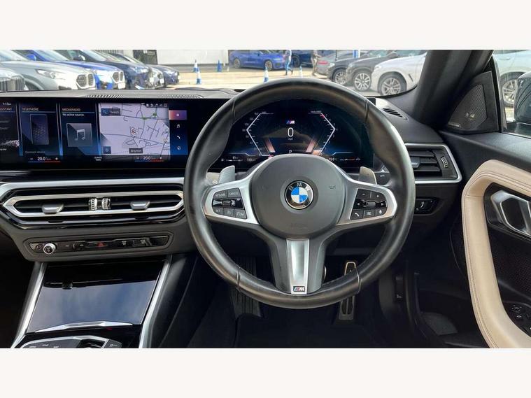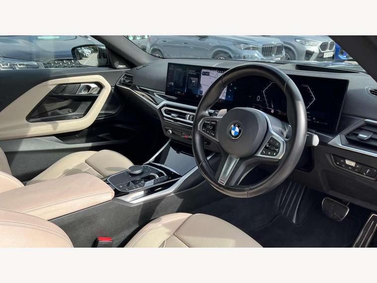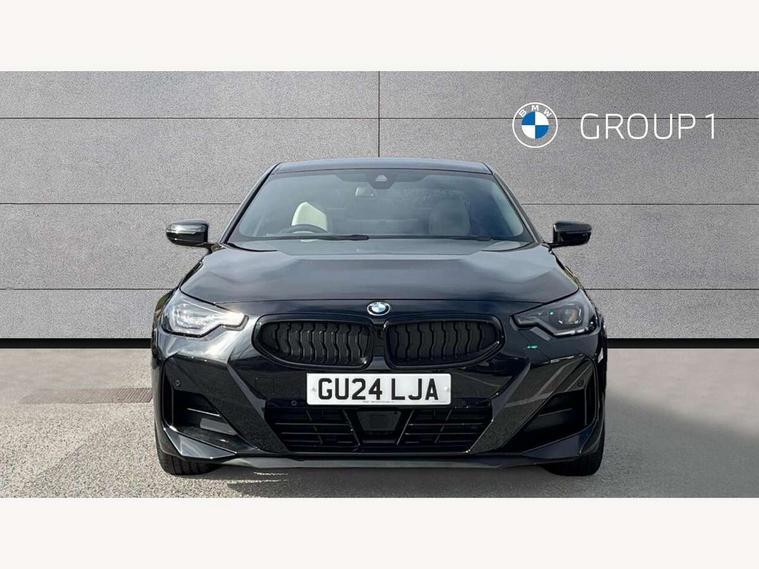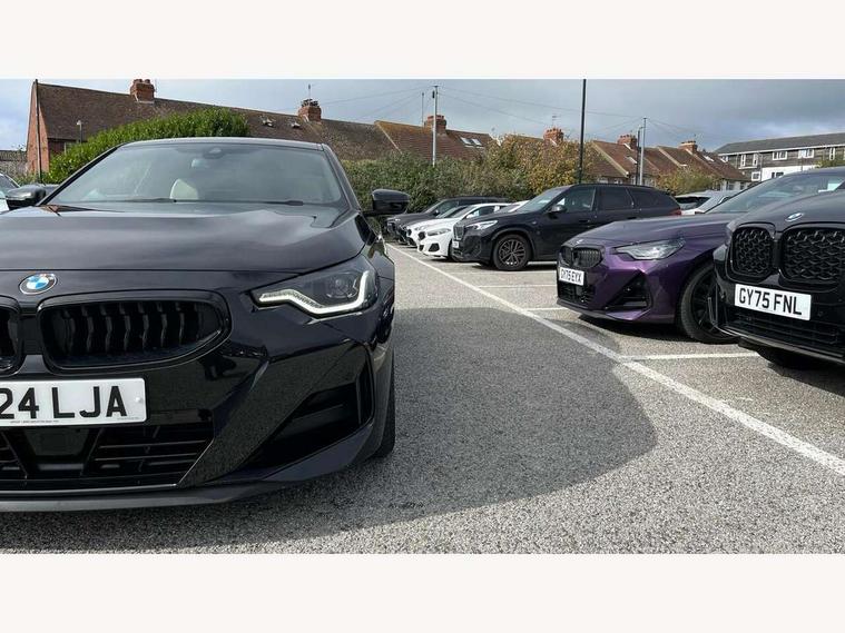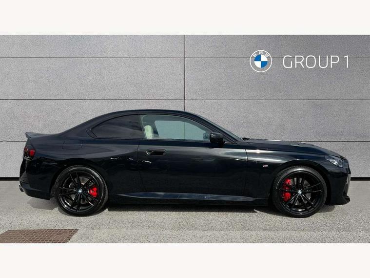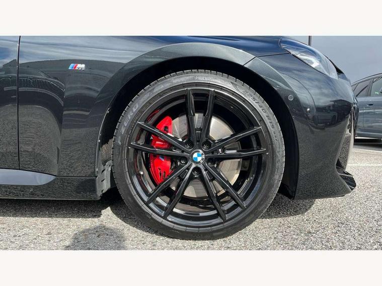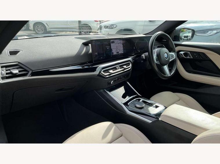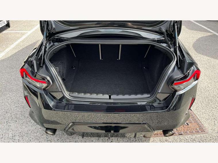 2 USB connections for charging and transferring data, 4G LTE connectivity with hard wired 4G network sim card, Attentiveness assist, Bluetooth with USB, BMW ConnectedDrive online services, BMW Intelligent Personal Assistant, BMW operating system 8 with variable, configurable widgets display information in real time, BMW Teleservices, Check Control warning system for monitoring of lights and door/luggage compartment open warning, Direct selection buttons, Drive off assistant, Eco pro mode, Electric power steering, Front and rear parking sensors, Front/rear Parking distance control, iDrive controller with turn and press function, Integrated owners handbook, Intelligent functions, Live cockpit plus with nav function 12.3" instrument cluster and 14.9" centre display, Oil sensor for level and grade, Optimum shift indicator, Personal Profile, Touch operation on control display, Variable sport steering, Widescreen multi-media display, WiFi interface for wireless connection of mobile terminal devices, Aluminium lightweight construction, Balancer shaft, BMW TwinPower Turbo four-cylinder petrol engine, Double VANOS, Drive performance control with ECO PRO comfort + sport mode, Electronic differential lock, High precision injection, M sport suspension, Petrol Particulate Filter, Sport automatic steptronic transmission with gearshift paddles, manual gearshift time display, launch control, coasting idle ECO PRO/COMFORT modes, Twin scroll turbocharger with Valvetronic, DAB tuner, Acoustic windscreen wipers for reduced driving noise, Adaptive LED Headlights, Automatic windscreen wipers and automatic headlight, Automatically dimming rear view mirror, Body colour door handles flush with door surface, Body colour door mirrors, Body colour front and rear bumpers, Daytime running lights, Electric windows - front and rear, with open/close fingertip control and trap release, Exhaust tailpipes x2 - 90mm in left and right, Fading support, Front and rear bumper system with replaceable deformation elements, Front door sill finishers in black plastic with BMW designation, Front windscreen wipers with integrated washer jets, Green tinted heat protection glazing, High beam assistant, High gloss black sill, bumper trim sides and diffuser insert, High gloss shadowline exterior trim in mirror triangle cover, mirror cover panel, mirror bezel and window border, High level third brake light, Indicators integrated int mirror housing, LED registration plate light, LED technology rear tail lights, brake lights and turn indicators, Lightweight engineering, Model designation on right side of tailgate, One piece kidney grille with hight gloss chrome surround, Rear boot, Rear fog lights, Reversing light in rear light cluster, Shark fin antenna, Single part LED rear lights with smoked glass components, Trailer stabilisation logic, Visible VIN plate, 12V power socket in front centre console with blanking plug, 2 cupholders in front centre console, 2 zone automatic air conditioning, Ambient lighting, Compartment in front of cupholder, Conditioned based service, Driver seat backrest width adjustment, Front and rear side armrests integrated into door trim, Front armrest, Front door pockets, Front head restraints, Front sport seats, Heated front seats, Illuminated glove compartment with separate small compartment, M headliner Anthracite, M sport leather steering wheel, Manually adjustment steering wheel column, Rear seat backrest with manual 40:20:40 split folding, Rear seat centre foldable armrest with integrated cup holder, Single front passenger seat, Storage compartment between rear seats, Storage tray and compartment with cover in centre console, Sun visors with vanity mirrors and insert tab, Through loading system with 40/20/40 split folding 2 rear seat in 2nd row, Two folding rear seat headrests, Velour floor mats, Additional storage compartment pack without USB - 2 Series Coupe, Connected pack professional - 2 Series Coupe, Interior and exterior mirror pack - 2 Series Coupe, M Sport exterior styling aerodynamics pack - 2 Series Coupe, 2 tone horn, Anti lock braking system (ABS) with cornering brake control, Automatic Stability Control (ASC), BMW emergency call, Brake drying, Child seat ISOFIX attachment for the two outer rear seats, Crash sensor activating of airbags, Unlocking doors, hazard warning lights, fuel cut off, interior lighting+activation of safety battery terminal clamp, Deactivation of fuel pump in the event of a crash, Driver and front passenger airbags, Driver and front passenger side airbags, integrated in the door side seat backrest bolsters for all seat variants, Dynamic brake control, Dynamic stability control + (DSC+), Dynamic Traction Control - DTC, Electrically operated hand brake including automatic hold function and automatic release when driving off, Front and rear disc brakes, Head airbags for all 4 outer seats, Manual deactivation of front passenger airbag, Seat belt security check for driver and front passenger, Seatbelt warning, Side impact protection, Three point seat belts on 4 seats including front belt stopper, pyrotechnic belt tensioners and belt force limiters, Tyre pressure sensor, Warning triangle and first aid kit, Alarm system (Thatcham 1) with remote control and electronic engine immobiliser, Central locking switch for all doors, fuel filler cap and luggage compartment, Deadlocking function system to all doors, Drive away locking system on all doors and luggage compartment, Locking wheel bolts, Start/Stop button (illuminated) in centre console with keyless engine start and Auto Start-Stop deactivation button, Two remote control key with integrated key - one button for open and close doors/fuel flap/tailgate and separate button for unlock luggage compartment, BMW mobility tyre sealing system, Electrically powered 12V compressor, Reduced rolling resistance tyres,