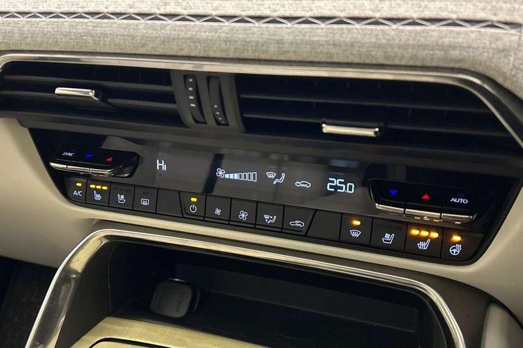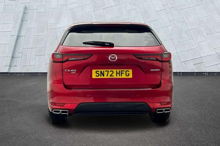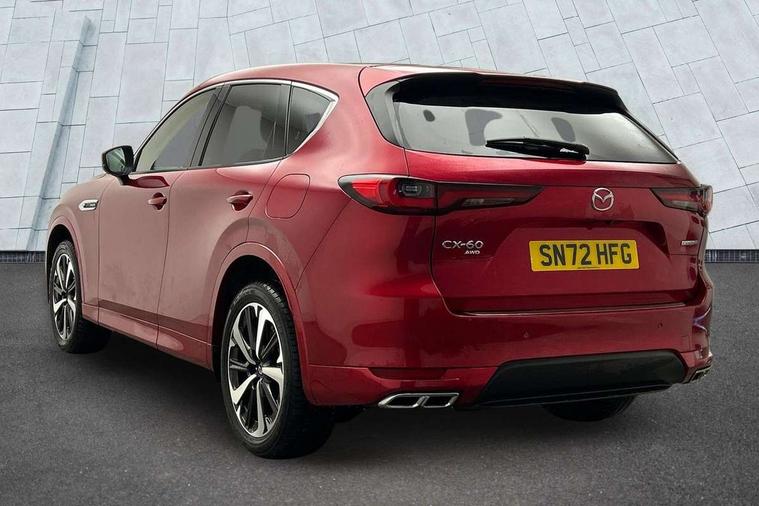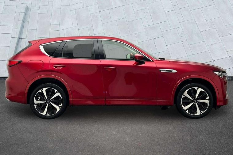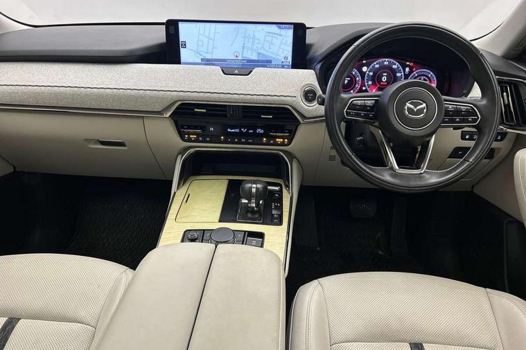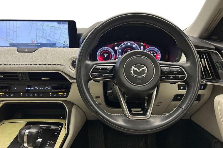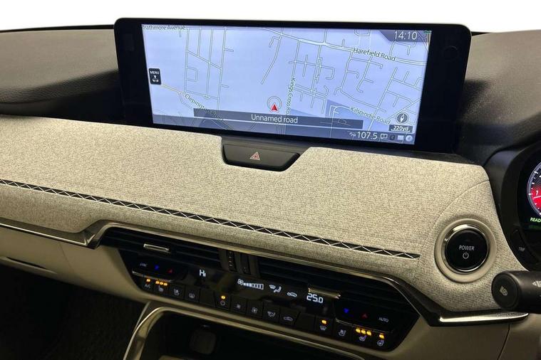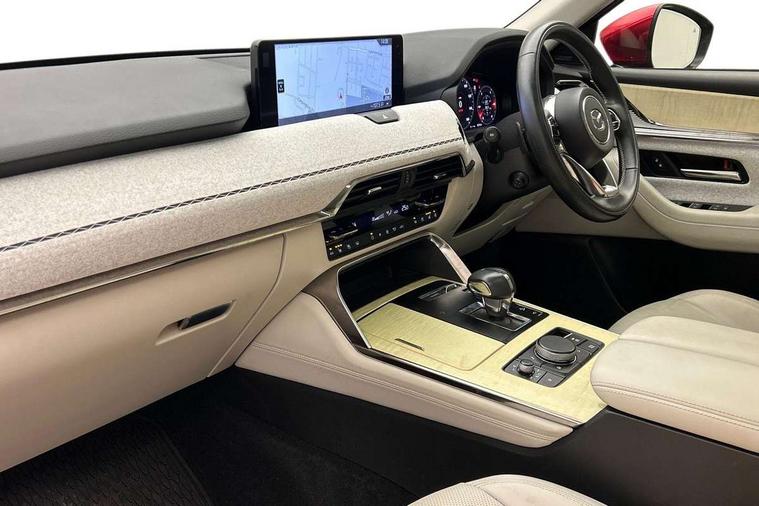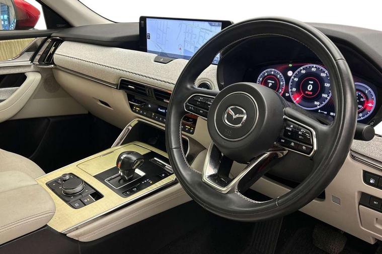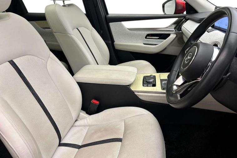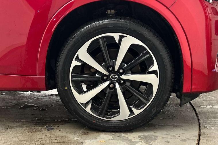 Emergency lane keeping with blind spot assist, Low washer fluid warning light, 12.3" Colour entertainment centre display with mazda connect infotainment, 12.3" TFT Colour display, Adjustable speed limiter, Blind spot assist, Blind spot monitoring with rear cross traffic alert, Dashboard leather with feature stitching, Distance alert system, Driver attention alert system, Driver Monitoring with personal identification, E-call with GPS, Emergency stop signalling system, Exit warning function, Front and rear parking sensors, Ingress / Egress support and automatic driver position guide, Integrated bluetooth, Intelligent speed assist, Kinematic posture control, Lane keep assist system (LAS) with Lane departure warning system (LDWS), Mazda Driver Personalisation System, Mazda Navigation System with european mapping, Multimedia Commander, PAS, Power lift gate with handsfree function, Power start/stop button, Reversing camera with static guide lines, Speed alert, Traffic sign recognition, Trip computer, Windscreen projected colour active driving display, Wireless apple car play/android Auto, Type 2 Mode 2 cable for AC charging via UK 3-pin plug, 7.2 kw On board Charger, Mi-Drive (Normal, Sport, Off-road, Towing and EV mode), Type 2 Mode 3 cable for AC charging via home or public charge points, AM/FM and DAB radio, Bose surround sound system with 12 Speaker, Bose center point, Bass match and audio pilot technology, Steering wheel mounted audio/bluetooth controls, USB-C inputs (x2 front and x2 rear), Auto dimming driver's door mirror, Automatic headlight levelling, B-pillar and C-pillar garnishes in gloss black finish, Body colour roof spoiler, Body coloured bumpers, Body coloured door mirrors, Body coloured wheel arch and side mouldings, Bright decoration panel, Chrome finish signature wing in front grille, Chrome front side garish, Chrome headlight lense, Chrome side window surrounds, Coming/leaving home lighting function, Dusk sensing headlights, Electric front/rear windows with one touch auto up/down, Electrically adjustable, heated auto power folding door mirrors with memory, Frameless auto dimming interior rear view mirror, Front kodo turn signal, Front wiper de-icer, Gloss black bar type front grille, Headlight washers, High beam control, LED 3rd brake light, LED rear signature combination lamps, Rain sensing front wipers with adjustable sensitivity and speed, Rear side wing doors, Rear wiper, Signature LED daytime running lights, 12v power outlet - front, 12V socket in boot, 3 height adjustable rear headrests, 3 seat bench in 2nd row, 40/20/40 split folding rear seats with quick levers in the boot, Ambient lighting, Cargo net, Chrome interior trim accents with steering wheel centre bezel, surround of engine start / stop button and glove box handle, Door panel trim vinyl leather with armrest, Driver and front passenger two rear grab handles with rear coat hooks, Driver and front passenger visors with covered vanity mirror and driver ticket holder, Driver seat electric tilt, slide, recline, height and lumbar adjustment, Driver, front passenger and two rear door pockets, Driver/passenger front seatback pockets, Dual zone climate control air conditioning with rear air vents, Electric telescopic and tilt adjustment steering wheel, Folding rear centre armrest with two cup holders, Front centre storage with two cupholders, Front down lamp with front and rear foot lamps, Front headrests, Front passengers seat electric slide, recline, height and lumbar adjustment, Front seat ventilation with 3-stage setting, Glovebox illumination, Heated front seats with 3 stage setting, Heated leather wrapped steering wheel, Heated outer rear seats with 3-stage setting, ISOFIX child seat anchorage points attached on outer rear seats, Karakuri tonneau cover, Leather wrapped gear shift knob, LED illumination luggage compartment, Nappa leather upholstery, Paddle shift, Practical and spacious front centre armrest storage, Rear seat recline function for rear passenger comfort, Remote fold down rear seats, Roof mounted sunglasses holder, Single front passenger seat, 3 point ELR front seat belts x2 with pretensioners, 3 point ELR rear seat belts, Active bonnet, Anti-lock braking system (ABS), Drivers knee airbag, DSC - Dynamic Stability Control, Electronic parking brake with auto disengage function and auto hold function, Front and rear curtain airbags, Front dual stage driver and single stage front passenger airbags, Front passenger airbag cut-off switch, Front side airbags, Front smart city brake support, Hill decent control, Hill launch assist, Manual rear child locks, Seatbelt reminder for driver/front passenger and rear seats, Traction control, Tyre pressure monitoring system (TPMS), Remote central locking with deadlocking and automatic door lock when driving, Smart keyless entry, Thatcham accredited alarm and immobiliser, Cloth with "X" stitch dashboard panel, White maple wood centre console panel, 20" Black metallic mechined alloy wheels, Emergency tyre repair kit,