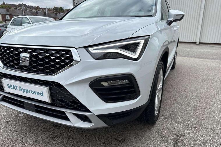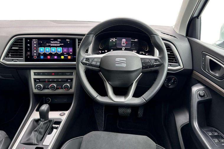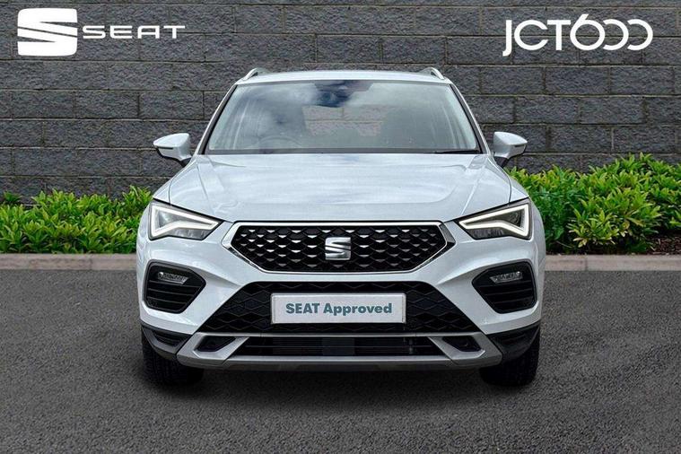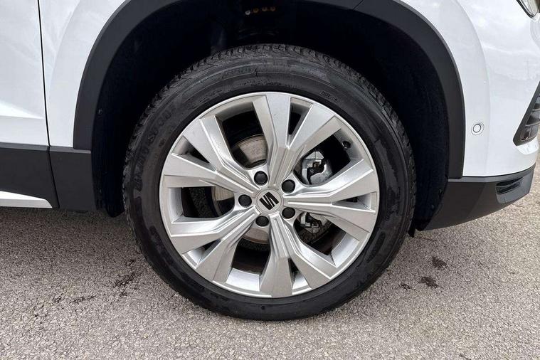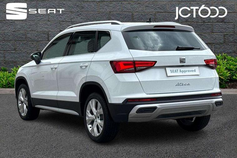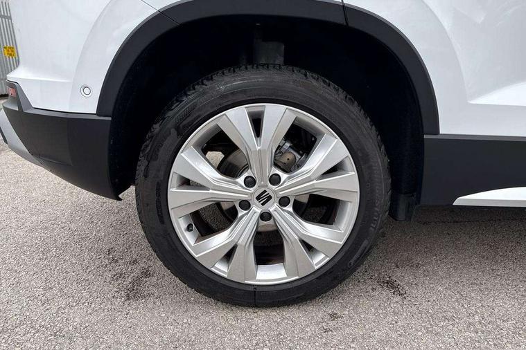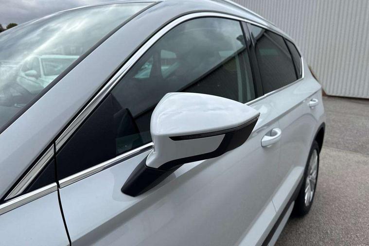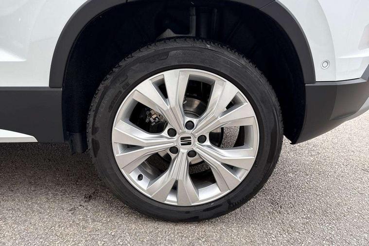 8" Digital cockpit, Colour multi-function on board computer display, E-call, Electric tailgate, Outside temperature gauge, Progressive power assisted steering, Rear view camera, SEAT drive profile with driving experience button - Normal, Sport, Eco and Individual mode, gearshift, steering and throttle response, Self parking functionality (includes front and rear parking sensors), Start/stop system, Trip computer, wired and wireless full link smartphone integration, Wireless phone charger, Steering wheel mounted audio/phone controls, Black wheel arch surrounds, Body colour bumpers, Chrome front grille frame, Chrome roof rails, Chrome side window trim, Dark tinted rear windows, Daytime running lights, Door mirrors with welcome light silhouette, Dynamic headlight range control with self adjusting whilst driving, Electric adjustable/heated/folding door mirrors, Front and rear electric windows, Front grille hot stamping, Full LED headlamps with lens and LED front fog lamps with cornering function, Heat reflecting windscreen, Illuminated aluminium front door sill, LED 3rd brake light, LED rear tail lights with dynamic indicators, Rear exhaust tailpipe, Rear fog lights, Rear side wing doors, Rear wash/wipe, Reflex silver side mouldings, Variable front intermittent wipers, 12v socket in front, 3 seat bench in 2nd row, 60/40 split folding rear seat, Dinamica upholstery with front comfort seats, Drawer under right front seat, Dual zone climate control, Front and rear head restraints, Front centre armrest, Front seat back storage pockets, Height adjustable driver and passenger seat with lumbar adjustment, ISOFIX points in outer rear seats with top tether anchorage points, Leather sports steering wheel and gear knob, Rear armrest and easy back seat release mechanism from boot, Single front passenger seat, Steering wheel mounted gearshift paddles, Convenience pack - Ateca, Interior lighting pack - Ateca, Navigation system pack with DAB - Ateca, Safety and driving pack (M) - Ateca, Safety and driving pack with attention and drowsiness assist - Ateca, 3x3 point rear seatbelts, ABS, Traction control system (TCS), Electronic stability control (ESC) and Electronic differential lock system (XDS), Airbags - Driver and front passenger airbag with deactivation, front side, two curtain and driver's knee airbags, Electric parking brake with auto hold function, Front and rear seatbelt reminder, Hill hold control, Manual rear child locks, Single tone horn, Tiredness recognition system, Tyre pressure monitoring system, Alarm, Keyless entry, Locking wheel bolts, Remote central locking, Chrome interior detailing, 18" Brillaint silver alloy wheels,