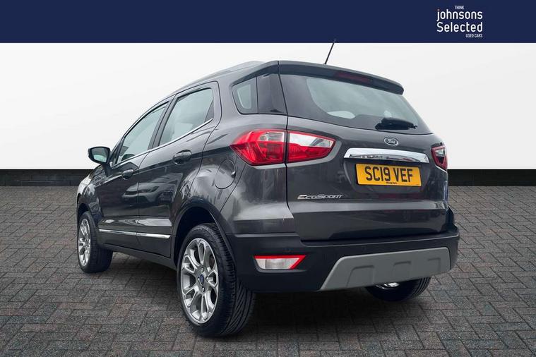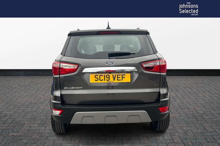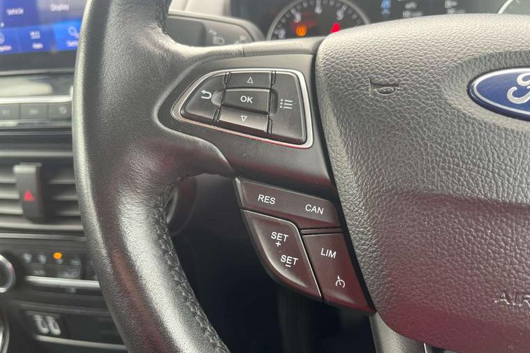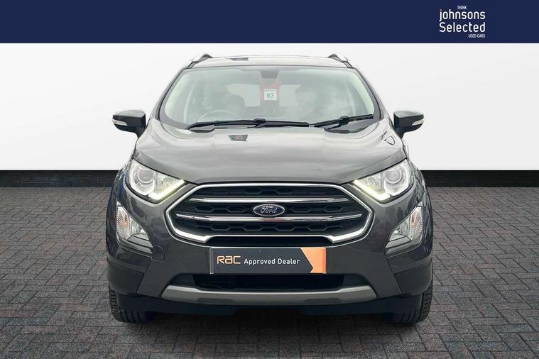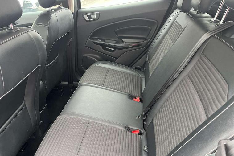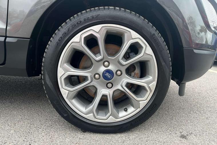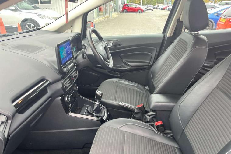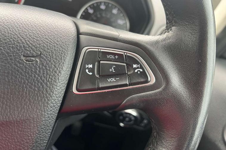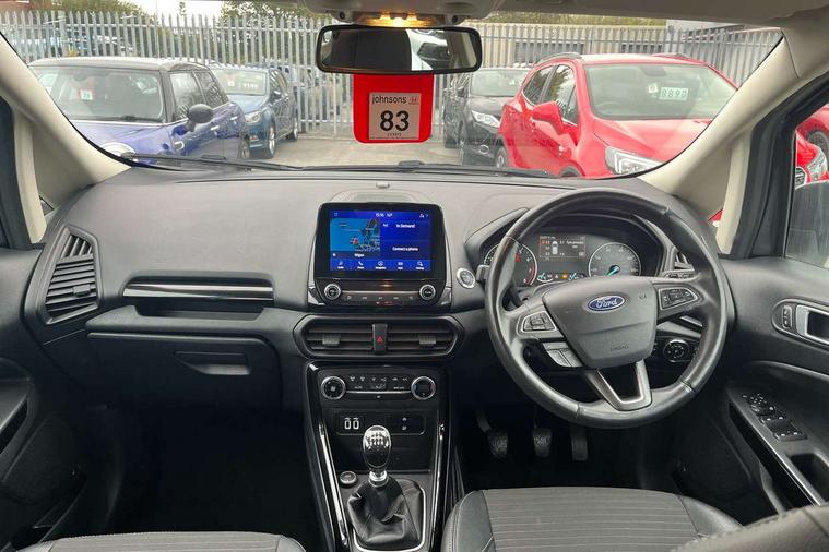 Cruise control, Easy fuel capless refuelling system, PAS, SYNC 3 nav system with DAB radio, 8" screen, voice control, emergency assistance, Apple car play/Android auto, 2x USB, Ford pass connect, Trip computer, 'Quickclear' heated windscreen/heated washer jets, Auto dimming rear view mirror, Automatic headlights, Body colour door handles, Body coloured bumpers, Electrically adjustable and heated door mirrors, Front door threshold plates, Front fog lights, Front grille with chrome trim surround, Headlamps with LED day running lights, Headlight levelling control, Power foldable door mirrors with puddle lights, Power front and rear windows with global opening/closing, Rain sensing front wipers, Rear wiper, 12V socket in front and rear, 60/40 split rear seats, 7 shade adjustable ambient lighting, Centre console with sliding front armrest, Cooled glovebox, Courtesy lights with map reading light, Driver seat height/lumbar adjust, Driver's side glovebox, Driver/passenger sunvisors and lidded vanity mirrors, EATC - Electronic Auto Temperature control, Folding grab handles, Footwell ambient lighting, Front head restraints, Front seat back map pockets, Front/rear floor mats, Groove cloth/leather upholstery, Illuminated glovebox, Illuminated luggage compartment, Isofix system on outer rear seats, Leather gear knob and handbrake grip, Leather steering wheel with audio controls, Luggage compartment carpet, Overhead console with sunglasses holder, Rake adjustable rear seats, Reach + rake adjustable steering column, Rear headrests, Steering wheel with chrome inserts, Storage drawers under front seats, Tie down hooks, Variable boot floor, Rear view camera pack - Ecosport, 3x3 point rear seatbelts, ABS, Child locks on rear doors, Curtain airbags, Driver airbag, Drivers knee airbag, Electronic Stability Programme with hill launch assist, Emergency brake assist, Front passenger airbag deactivation, Front side airbags, Passenger airbag, Seatbelt reminder for driver and front passenger, Traction control, Tyre pressure monitoring system, Immobiliser, MyKey system, Remote central locking, Thatcham 1 volume sensing alarm, Tyre inflation kit,