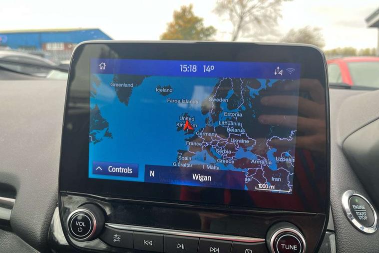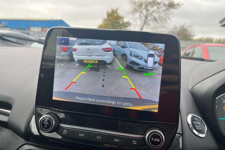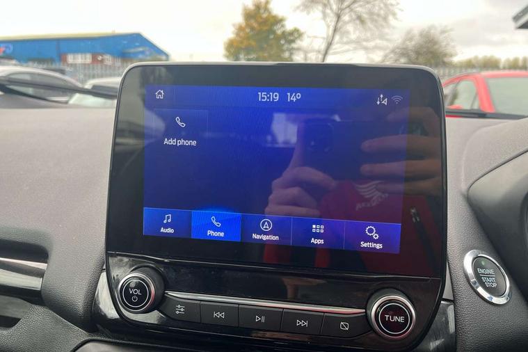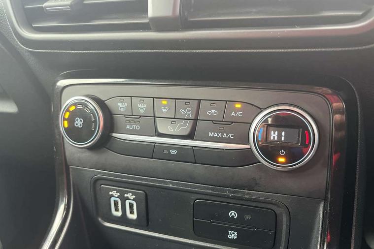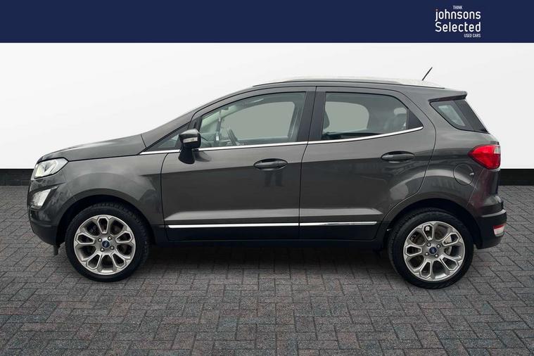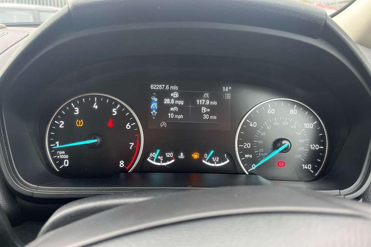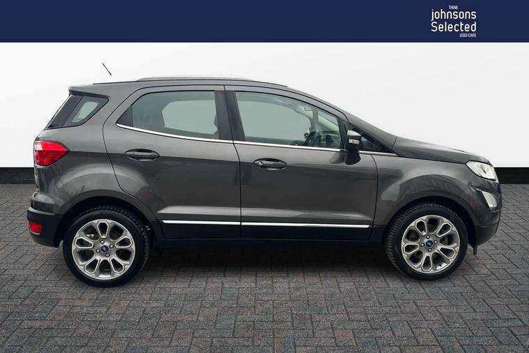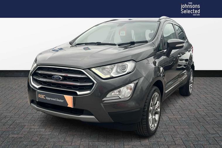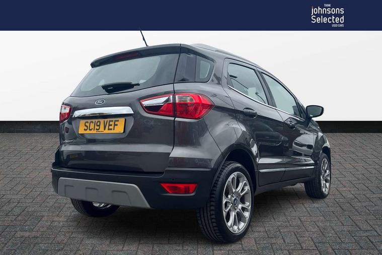Cruise control, Easy fuel capless refuelling system, PAS, SYNC 3 nav system with DAB radio, 8" screen, voice control, emergency assistance, Apple car play/Android auto, 2x USB, Ford pass connect, Trip computer, 'Quickclear' heated windscreen/heated washer jets, Auto dimming rear view mirror, Automatic headlights, Body colour door handles, Body coloured bumpers, Electrically adjustable and heated door mirrors, Front door threshold plates, Front fog lights, Front grille with chrome trim surround, Headlamps with LED day running lights, Headlight levelling control, Power foldable door mirrors with puddle lights, Power front and rear windows with global opening/closing, Rain sensing front wipers, Rear wiper, 12V socket in front and rear, 60/40 split rear seats, 7 shade adjustable ambient lighting, Centre console with sliding front armrest, Cooled glovebox, Courtesy lights with map reading light, Driver seat height/lumbar adjust, Driver's side glovebox, Driver/passenger sunvisors and lidded vanity mirrors, EATC - Electronic Auto Temperature control, Folding grab handles, Footwell ambient lighting, Front head restraints, Front seat back map pockets, Front/rear floor mats, Groove cloth/leather upholstery, Illuminated glovebox, Illuminated luggage compartment, Isofix system on outer rear seats, Leather gear knob and handbrake grip, Leather steering wheel with audio controls, Luggage compartment carpet, Overhead console with sunglasses holder, Rake adjustable rear seats, Reach + rake adjustable steering column, Rear headrests, Steering wheel with chrome inserts, Storage drawers under front seats, Tie down hooks, Variable boot floor, Rear view camera pack - Ecosport, 3x3 point rear seatbelts, ABS, Child locks on rear doors, Curtain airbags, Driver airbag, Drivers knee airbag, Electronic Stability Programme with hill launch assist, Emergency brake assist, Front passenger airbag deactivation, Front side airbags, Passenger airbag, Seatbelt reminder for driver and front passenger, Traction control, Tyre pressure monitoring system, Immobiliser, MyKey system, Remote central locking, Thatcham 1 volume sensing alarm, Tyre inflation kit,