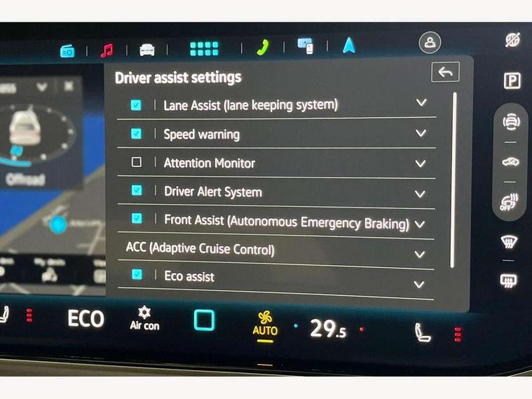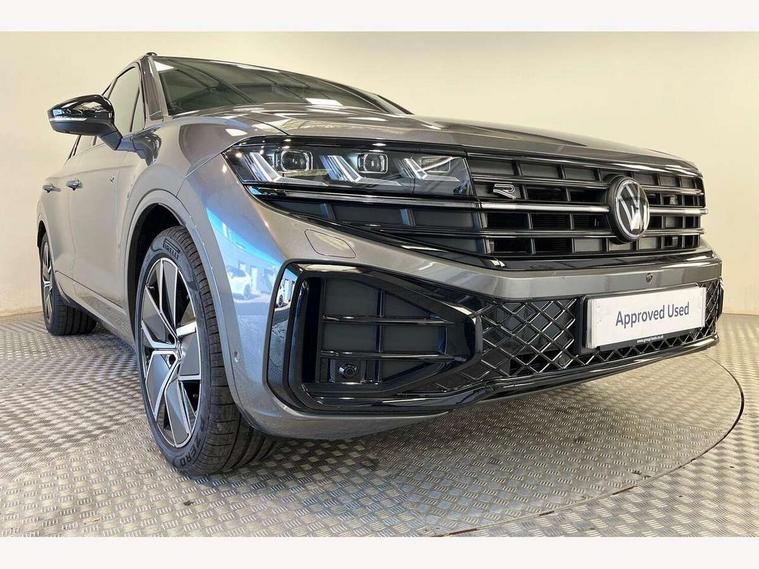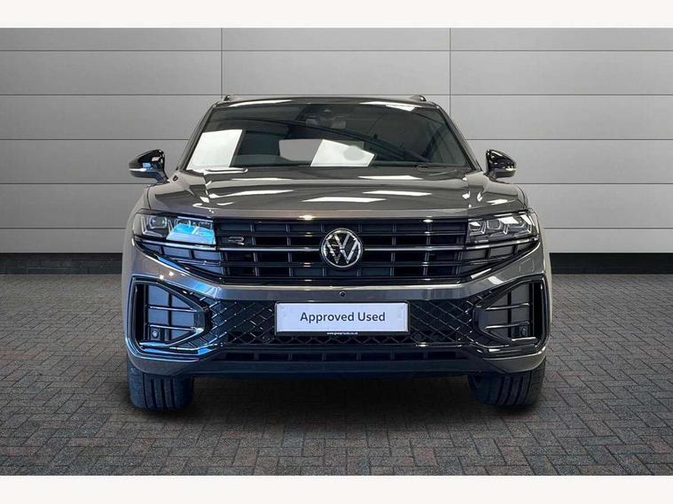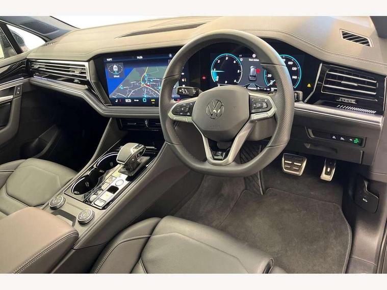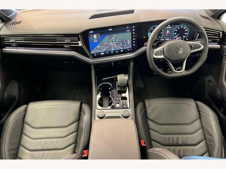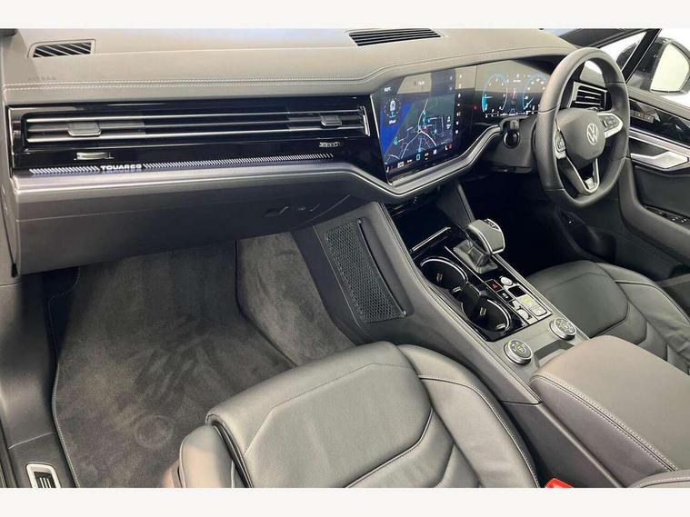 15" Screen Top infotainment system Premium (MIB3), Adaptive cruise control, Advanced driver attention and drowsiness monitor, Driver profile selection, Dynamic road sign display, E-Sim card for online connectivity, eCall emergency system, Innovision cockpit, Intelligent park assist, Mobile phone interface with inductive charging, Multi-colour Active Info display, Park Assist - Sensor controlled steering aid to assist parallel or bay parking, PAS, Warning signal and warning light for front and rear seatbelts not fastened, Wireless app connect, Adaptive chassis control, DAB Digital radio, Diversity antenna for AM/ FM reception, We Connect and We Connect Plus functionality, Automatic coming/leaving home lighting function, Automatic headlights, Black door mirrors, Black style comfort bumpers, Dynamic headlight range control with dynamic cornering light, Electric front tilt/slide panoramic sunroof and fixed rear sunroof, Electrically power adjustable, heated, folding, auto dimming, front passenger exterior door mirror lowering function, External USB type C socket and charging sockets, Gloss black roof rails, HD LED Matrix beam plus digital headlight projection with variable light distribution, Headlight washers, Highway light, LED 3rd brake light, LED daytime running lights, LED rear combination lamp with variable lighting functions and special styling, Poor weather light, Rain sensor, Rear exhaust tailpipe, Rear fog light with back up light on both sides, Rear light bar and illuminated logo, Rear side wing doors, Rear wiper, Stainless steel door sill protection, 12V socket in centre console, 3 rear headrests, 3 seat bench in 2nd row, 4 zone climate control, Airbag label on sun visor and B-pillar, Brushed stainless steel pedals, Double sun visors with illuminated vanity mirrors, Front + rear carpet mats, Front centre armrest, Leather wrapped multifunction sports steering wheel, heated, with touch control and shift paddles, Mechanical rear seat release, Power adjustable lumbar support in front, Power seats in front, right side with memory features and seat cushion depth adjustment, Rear seat backrest and split folding with center armrest, Single front passenger seat, Memory pack plus - Touareg, 3 point seatbelts, outer rear with ECE lable, ABS, Child locks on rear doors, Curtain airbags, Driver and front passenger safety-optimised head restraints, Driver/Front Passenger airbags, Extended pedestrian protection measures, Front assist, Front seat side impact airbags, Generative braking with start and stop system, Height adjustable 3 point front seatbelts with pre tensioners, Passenger airbag deactivate switch, Three 3 point rear seatbelts, Two tone horn, Tyre pressure loss indicator, Warning triangle and first aid kit, Alarm system with interior protection, Easy open and close sensor controlled luggage compartment opening and closing with remote unlocking, Keyless Access Keyless locking and starting system with SAFELOCK, Aluminium decorative inserts, Black decorative trims, Gloss black decorative inserts in centre console, Tool kit,