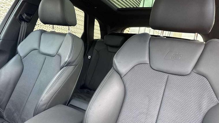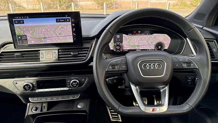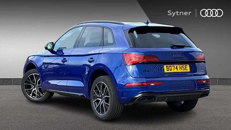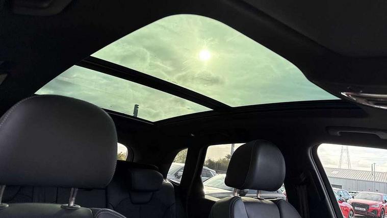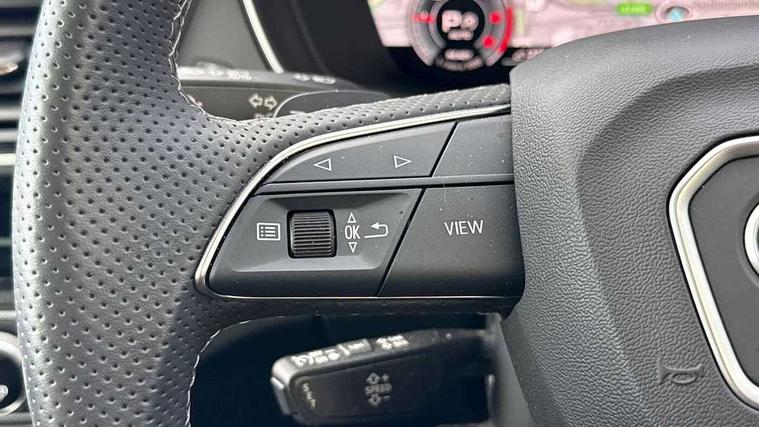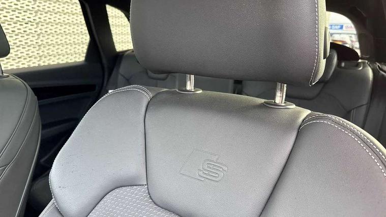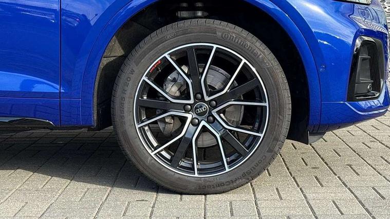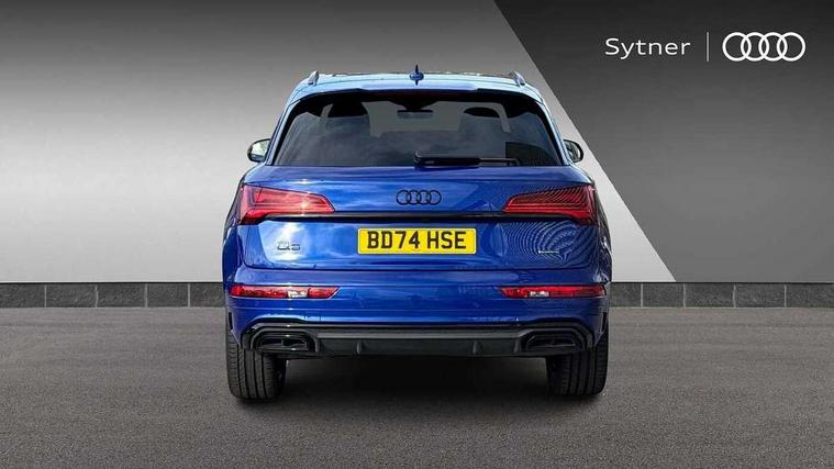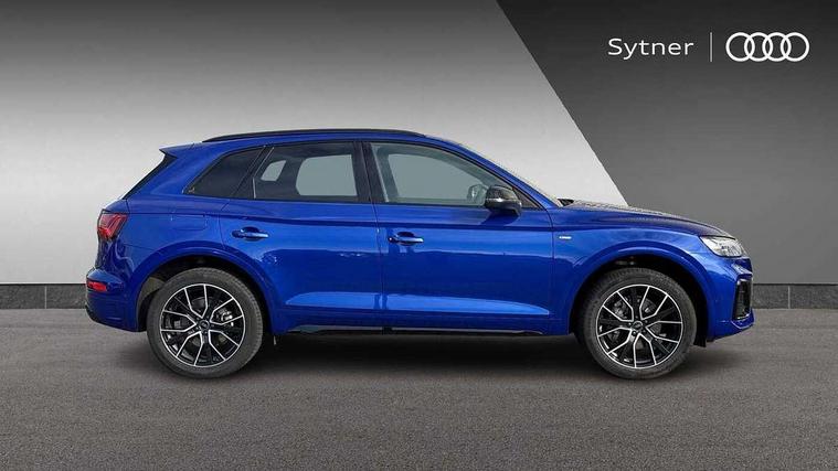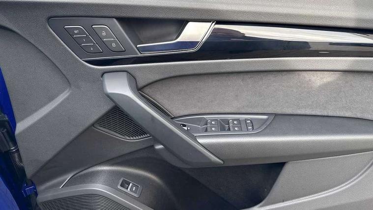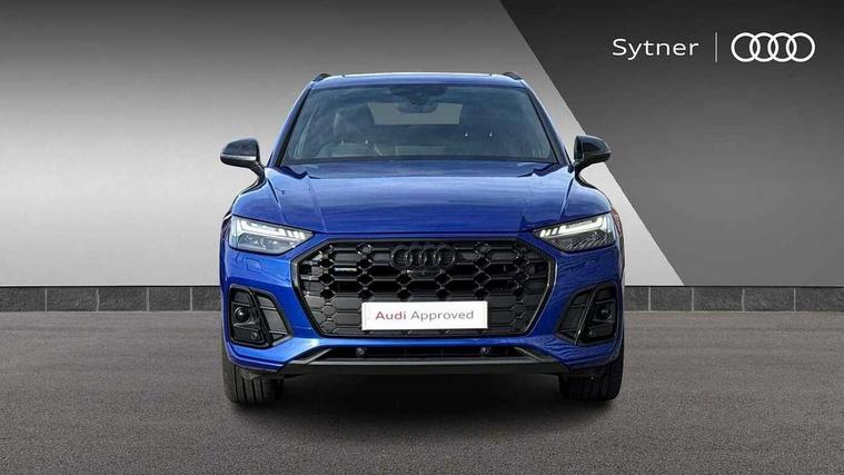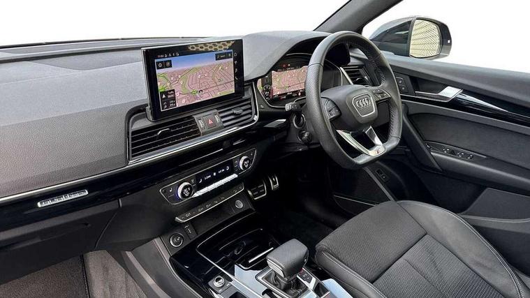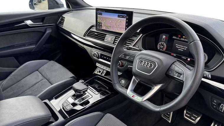 Acoustic front and rear parking sensor, Audi connect safety and service (e-call), Audi drive select, Audi virtual cockpit plus with 12.3" screen and three different layout designs, Audi wireless smartphone interface, Automatic start-stop system with coasting functionality and efficiency programme, Bluetooth interface, Camera based traffic sign recognition, Electro - mechanical power assisted steering, Lane departure warning, MMI navigation plus with 10.1" touch screen, Power tailgate, Reversing camera, Service interval indicator, Voice control system with Audi hotword activation "Hey Audi", Diesel particulate filter, Quattro on demand, S line sports suspension, 2 x USB charging port with aux input socket, 8 loudspeakers, DAB Digital radio, Acoustic windscreen, Auto dimming door mirrors, Auto dimming frameless rear view mirror, Automatic headlight adjustment, Automatic headlights and windscreen wipers, Black roof rails, Black styling with black rings, Body colour bumpers, Body colour rear diffuser with matt aluminium silver surrounds, Body colour underbody protection, Chrome plated exhaust trims, Daytime running lights, Door sills in Selenite silver, Electric adjustable/heated/folding door mirrors, Front air inlet surrounds in aluminium, Front and rear electric windows, Front radiator grille in honeycomb design, LED 3rd brake light, LED headlights and LED tail lights, Loading edge protection in stainless steel, Lower bumpers painted in contrast Manhattan grey, Rear chrome trim strip below lights, Rear privacy glass and rear side windows, Rear side wing doors, Rear wiper, Roof bars, S Line badges on the front wing panels, S Line front and rear bumpers, S Line rear spoiler, S Line side skirts, 3 rear headrests, Black cloth headlining, Comfort front centre armrest, Contrast stitching on seats, steering wheel and gear lever gaiter, Deluxe 3 zone electronic climate control, Front head restraints, Front sport seats with S embossed logo, Front/rear floor mats, Gear lever in black leather, Heated front seats, Height/reach adjustable steering column, Illuminated door sill trims with S logo, Luggage compartment cover, Manual seat adjustment with 4-way electric lumbar support, Single front passenger seat, Stainless steel pedals, Sunvisors with vanity mirrors, Top surface of the rear centre armrest in artificial leather, High gloss pack - Q5, LED interior light pack - Q5, 3 point seatbelts on all seats, 6 airbags - Driver, front passenger, curtain and side airbags, Attention and drowsiness assist, Electrically operated child locks on rear doors, Electromechanical parking brake, Electronic stabilisation control including ABS, ASR and EDL, First aid kit with warning triangle and vests, Front passenger airbag deactivation, Hill descent control, Hill hold assist, ISOFIX child seat mounting for front passenger seat and ISOFIX child seat mounting with Top Tether for outer rear seats, Multi collision brake assist, Pop-up bonnet for pedestrian protection, Pre sense city, Seatbelt monitoring, Tyre pressure warning, Anti theft alarm, Anti-theft wheel bolts, Remote central locking, Remote control key with SAFELOCK and keyless go, Air vents inserts and centre console in gloss black, Tool kit, Tyre repair kit,