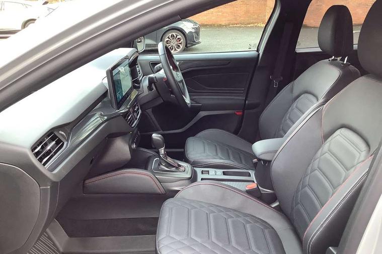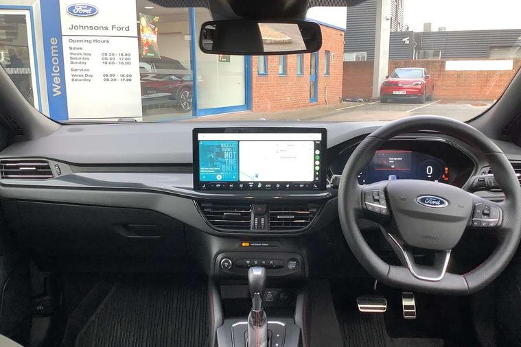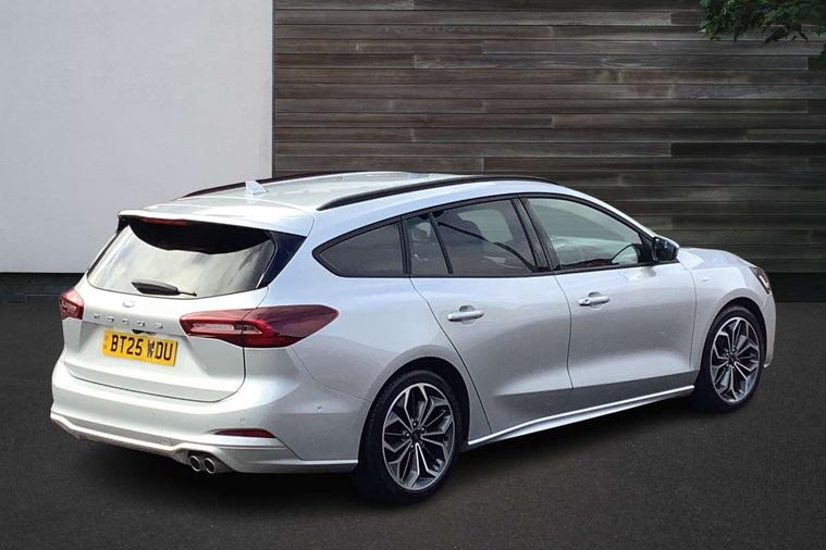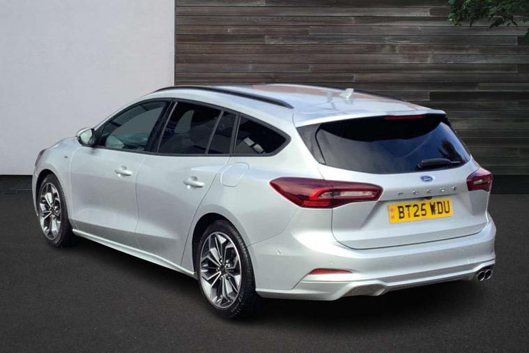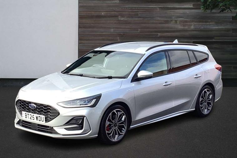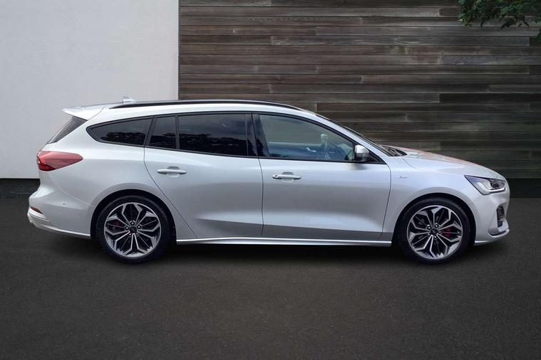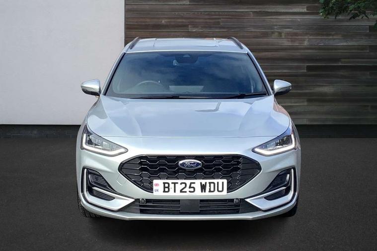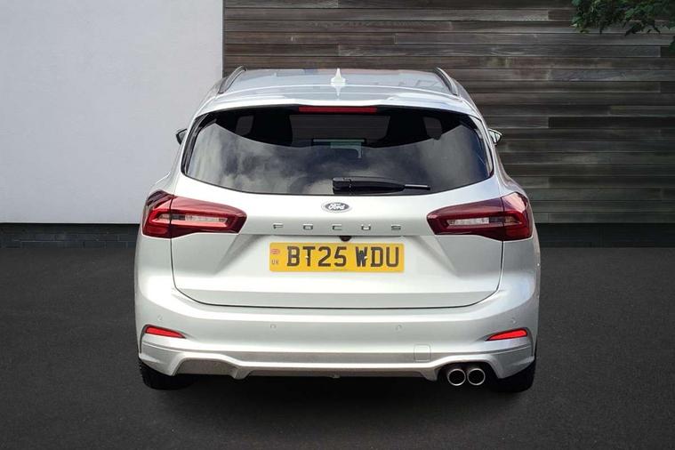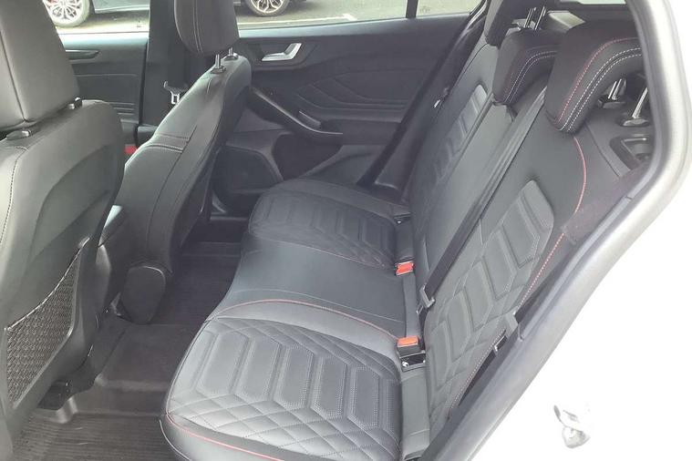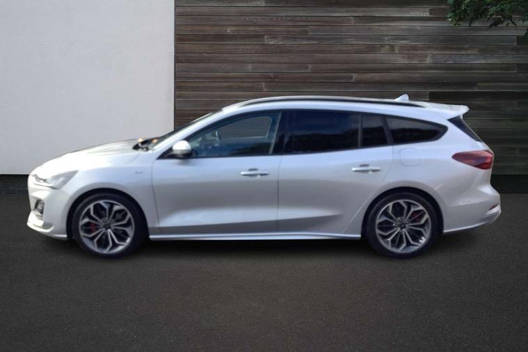 12.3" Digital instrument cluster, Bluetooth system, Digital clock, Easy fuel capless refuelling system, Eco mode, Ford SYNC4 Nav with 13.2'' touchscreen, DAB, Emergency Assistance, Apple Carplay & Android Auto, B&O Premium Audio with 10 speakers, FordPass Connect, Lane keeping system - lane keeping alert and lane keeping aid, PAS, Rev counter, Selectable drive mode, Service interval indicator, Trip computer, Wireless charging pad, Sports tuned suspension, 2 USB ports, Auto headlamps (on/off), Body coloured door handles, Electrically operated front and rear windows with one touch opening and closing, Electrically operated heated power fold door mirrors with puddle lamp with side indicators, Front variable intermittent wipers with electric wash, Heated rear window, LED daytime running lamp, LED rear lamps, LED third brake light, Polished twin tailpipe, Privacy glass, Quickclear heated windscreen, Rain sensor, Rear side wing doors, Tailgate wash/wipe, Unique ST-Line grille, full bodystyling kit, and large body coloured rear roof spoiler, 3 rear headrests, 3 seat bench in 2nd row, Dual zone electronic air temperature control, Full sensico premium upholstery, Height adjustable front headrests, Isofix child seat preparation, Load through ski hatch, Manual 2-way passenger seat adjust, Power 4-way driver seat adjust, with power lumbar adjust, Reach + rake adjustable steering column, Single front passenger seat, ST-Line Design pack - Focus, Winter pack - Focus, 3x3 point rear seatbelts, ABS+Electronic Brake force Distribution, Auto hold function, Driver airbag, EDL traction control, Electronic parking brake, Electronic stability control, Front and rear seatbelt reminder, Front inertia reel height adjustable seatbelts with pre-tensioners, Front passenger airbag, Front side airbags, Passenger airbag deactivate switch, Post collision braking, Pre collision assist with autonomous emergency braking and pedestrian/cyclist detection, Remote/power child rear door locks, Side curtain airbags, Three rear inertia reel lap/diagonal seatbelts, Tyre pressure monitoring system, Keyless entry and keyless start, MyKey system, Remote central locking & engine immobiliser, Thatcham alarm with power door dead locks, 18" 5x3 spoke pearl grey high gloss machined finish alloy wheels with mini spare wheel,