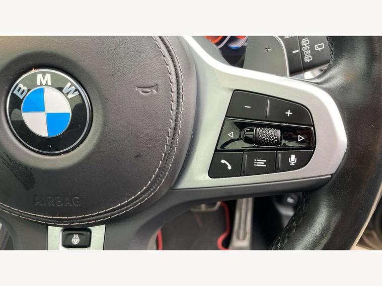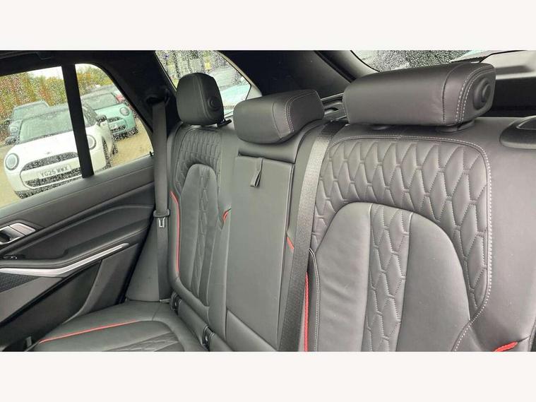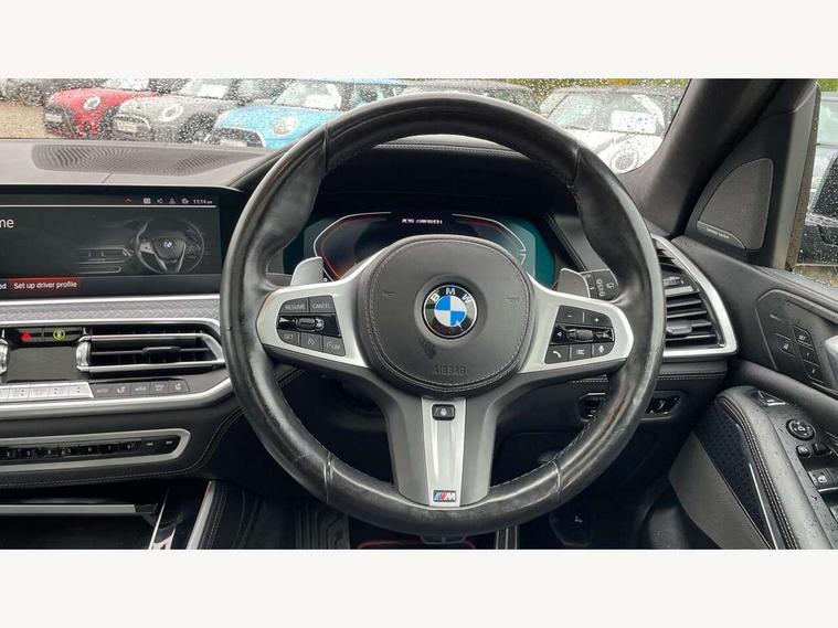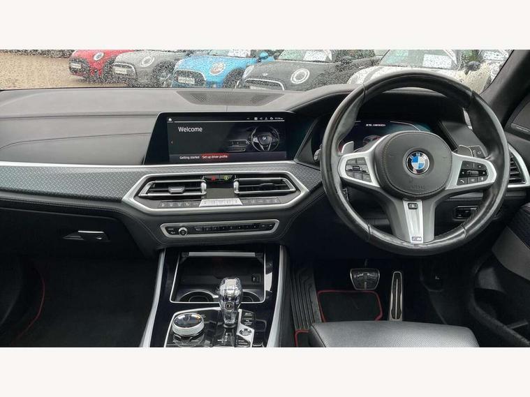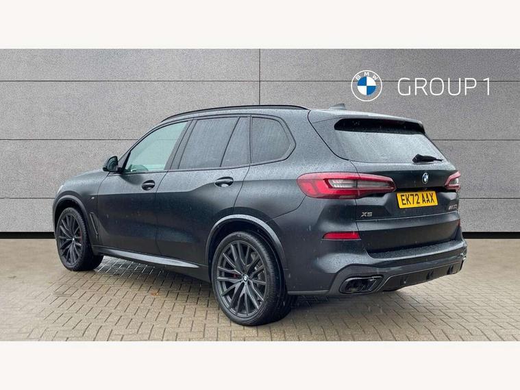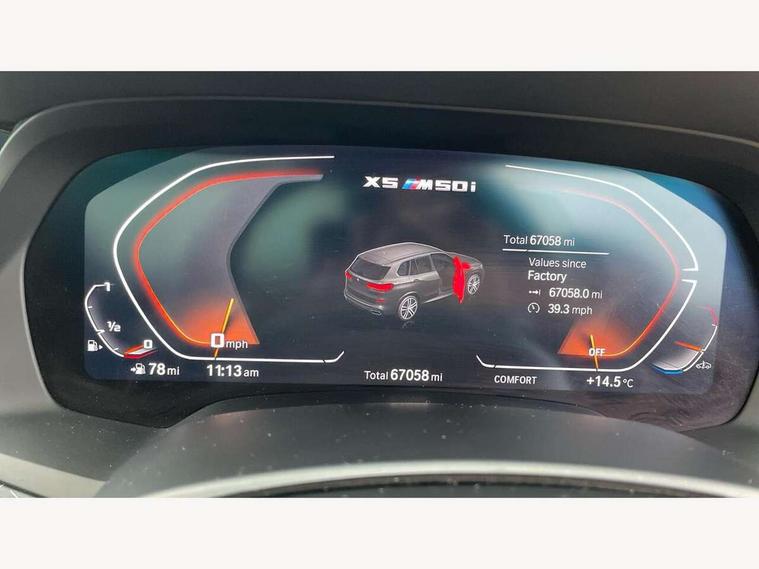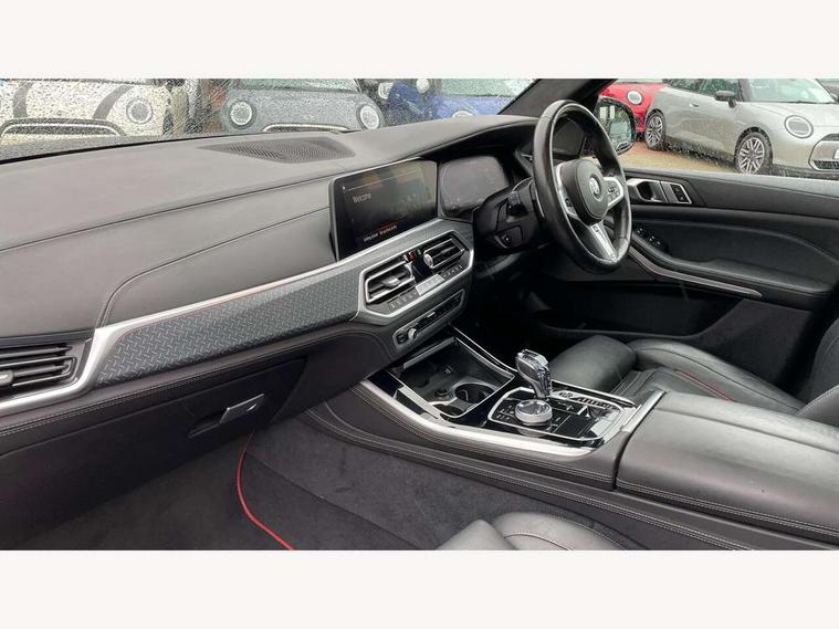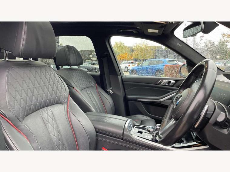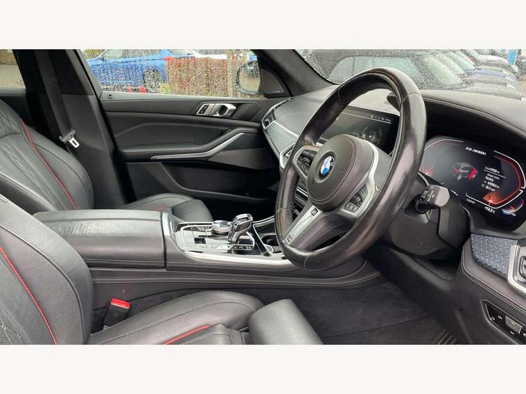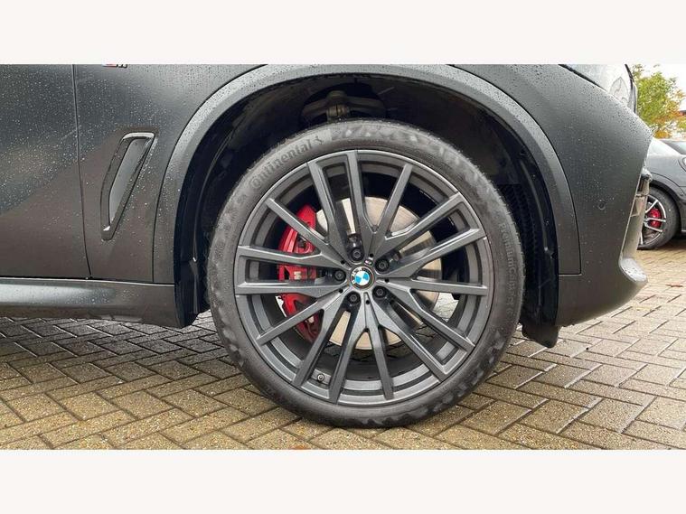 20GB hard disc drive (HDD) memory, Active guard plus, Attentiveness assist, Automatic tailgate with top hinged section open and manual bottom hinged section, BMW ConnectedDrive online services, BMW digital live cockpit professional - 12.3" digital instrument panel and 12.3" CID, with touch/voice command, BMW legal emergency call, BMW Teleservices, Brake force display, Brake pad wear indicator warning light, Front/rear park distance control, Galvanised plastic keyfob, iDrive controller with shortcut buttons, Infinity symbol with line graphic on reset of average consumption, Lights on warning, Oil sensor for level and grade, On board computer inc. average speed, fuel consumption, liquid crystal Info display, journey computer, outside temperature display, personal profile, Service interval indicator, Speed limit info display, Double VANOS, Double wishbone front axle, Drive performance control with ECO PRO comfort + sport mode, Eight speed steptronic sport automatic transmission and gearshift paddles on the steering wheel, High precision injection, M Sport differential, Petrol Particulate Filter, Safety battery terminal clamp, Twin scroll turbocharger with Valvetronic, DAB Tuner enables digital radio reception, Favourite buttons, USB connection, USB type A 1.5A in cupholder, USB Type C 3A in centre armrest, Adaptive LED Headlights, Automatically dimming rear view mirror, BMW Individual paint, Body colour bumpers, Body colour door handles, Dynamic brake lights with LED technology, Extended high gloss shadow line exterior trim, Folding side mirrors with auto dimming, Follow me home headlight function, Front and rear electric windows with open and close fingertip control, anti trap facility and comfort closing, Heated windscreen washer jets, High beam assistant, High gloss black Side elements, High gloss shadow line roof rails, Kidney grille with red accents, Laserlights with shadowline, LED daytime running lights, LED rear lights, M Sport exhaust system, Rain sensor with automatic headlight activation and windscreen wiper control, Rear side wing doors, Sun protection glazing, Third brake light in rear spoiler, Variable intermittent rear wash/wipe, Welcome light carpet, X5 on left tailgate, xDrive designation on right tailgate, 12V - Power sockets with 2x centre console and 1x luggage compartment, 40:20:40 split folding rear seats, Active front seat ventilation, Ambient interior lighting with 6 pre-designed selectable lights including dynamic function, BMW Individual merino leather upholstery, Centre and rear interior light, Child seat ISOFIX attachment with rear outer seats includes top tether, Compartment in front of cupholder, CraftedClarity glass application for interior elements, Driver and front passenger sports seats, Edition logo on cupholder cover, Edition specific floor mats, Electric front seat adjustment with driver and front passenger memory function, Electrical steering column with adjustable height and length with activation and control on the steering column, Electrically adjustable front comfort seats, Foldable rear centre armrest with 2 cupholders and storage compartment, Front and rear door pockets, Front and rear side armrest integrated into door trim, Front footwell lights, Front reading lights, Light inside glove compartment, Lockable glove compartment, Luggage compartment floor panel with integral storage tray, Luggage compartment lighting, M alcantara anthracite roof liner, M sport steering wheel, Make-up mirror lights, Multifunction controls for leather steering wheel, Multifunctional hooks, Rear centre interior light, Rear head restraints, Seat back with flap pocket, Securing rings in luggage compartment, Single front passenger seat, Storage bins on all doors, Storage tray and compartment with cover in centre console, Sunvisors with illuminated vanity mirrors, Toolkit located in luggage compartment, Connected Package Professional - X5, M aerodynamics pack - X5, Non-smokers pack - X5, Active protection, Airbags - driver/front passenger, rear and side, first and second row seats head airbags, front passenger seat airbag deactivation + knee airbag, Anti-lock braking system (ABS), Automatic Stability Control (ASC), Brake drying, Brake energy regeneration, Brake fade compensation, Braking pre-tensioning, Child proof locking system in rear door, Cornering brake control (CBC), Crash sensor activating central locking release, hazard warning lights, fuel cut off, interior lighting + activation of safety battery terminal clamp, Deformation zones - front and rear with door reinforcements and bumpers up to 2.5 mph, DSC - Dynamic Stability Control, Dynamic brake control, Dynamic Traction Control - DTC, Electromechanical parking brake with automatic drive away release and auto hold function, Electronic brake force distribution, Front and rear seatbelts with seatbelt stopper, seatbelt tensioner for front and outer rear seats and belt force limiter, Front head restraints with anti-whiplash, Height adjustable front seatbelts, Hill start assistant, Integrated brake system, M Sport brakes in red calipers, M sport seatbelt, Mechanical child proof lock on rear doors, Passive protection for pedestrians, Seat occupancy detection for driver and passenger side, Side impact protection, Three 3 point inertia reel seatbelts, Two tone horn, Tyre pressure monitoring system, Ventilated front and rear disc brakes, Warning triangle and first aid kit, Closing system with central locking, Driver and front passenger door centre lock switch, Locking wheel bolts, Thatcham 1 alarm system with remote control and engine immobiliser, BMW Individual piano black trim, Leather instrument panel, Start/stop toggle diamond shaped trim finisher in pearl chrome, 22" Orbit grey matt M light alloy wheels, Tyre repair kit,