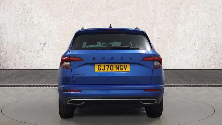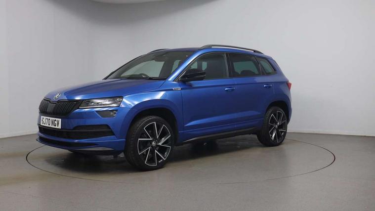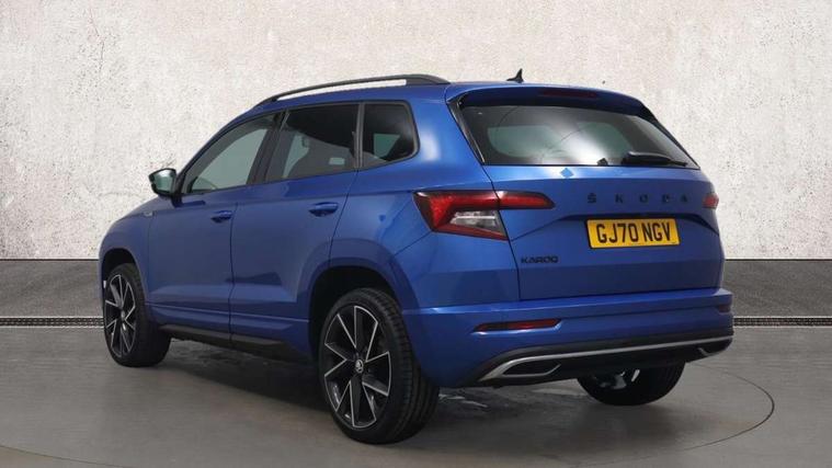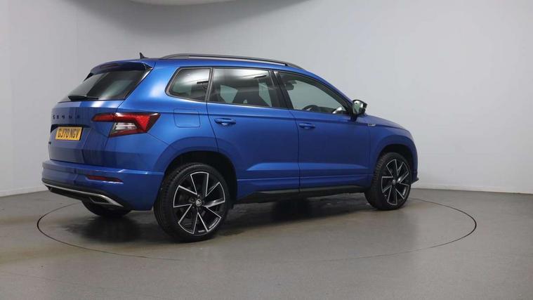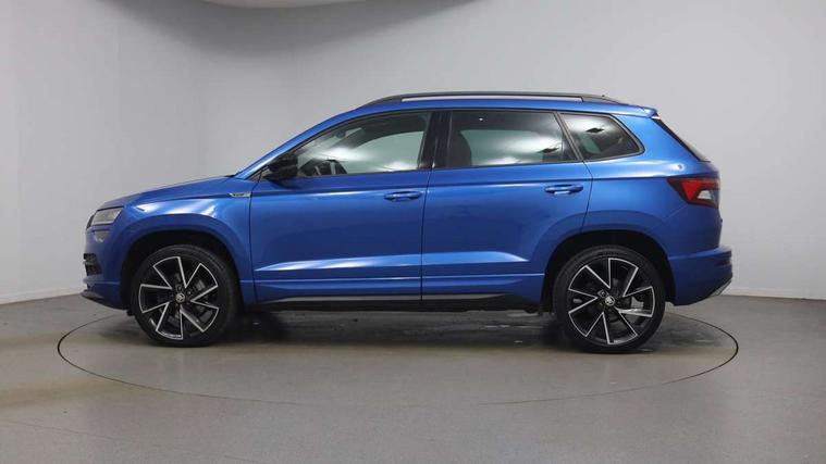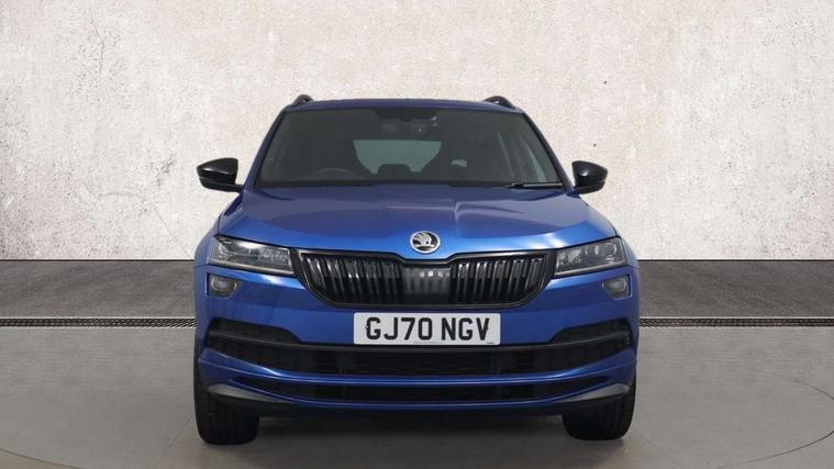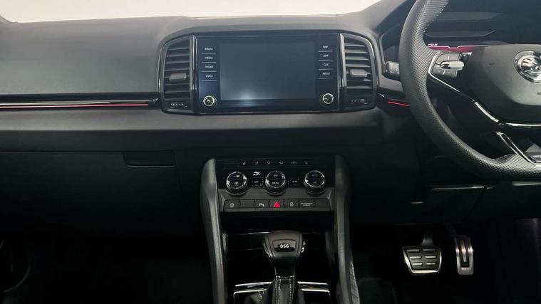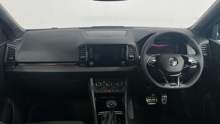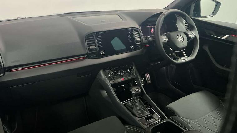 Care connect, Drive mode selector, Driver alert system, Driver fatigue sensor, Driver profile selection, Multifunction colour trip computer, Outside temperature gauge, Rear view camera, Service interval indicator, SmartLink + wireless for Apple and wired for Android, Start/stop system with regenerative braking, USB C Port x 2 in front centre console, DAB radio with Bluetooth, SD card slot, USB connection, Wireless charging without wireless aerial connection, Acoustic glass, Aero front windscreen wipers with intermittent function, Automatic headlight control system, Black electric window control buttons, Black roof rails and door mirrors with radiator grille, Body colour door handles, Electric front and rear windows with child proof lock, Front door steps with SportLine logo, Full LED headlights + adaptive front light system + LED daytime running lights and front cornering fog lights, Headlight washers, Heated rear windscreen, LED rear lights with high functionality, Light assistant (coming/leaving home/tunnel light), Panoramic sliding sunroof, Privacy glass, Protective door side sills in body colour, Rear diffuser, Safety reflectors on front doors, Skoda lettering on tailgate in black, Sportline badge on front fender, Sportline decorative inserts with badging, Sports front and rear bumpers, Third brake light, 1.5 litre bottle holders in driver and front passenger door panels, 12V socket in boot, 12v socket in front centre armrest with storage compartment and rear air vents, 2 Folding hooks and nets in boot, 2 Front readings lights for driver and passenger, 3 rear height adjustable headrests, 3 spoke leather sports heated multifunction steering wheel with hands off detection and silver stitching with gear shift paddles, 4 foldable roof handles with rear coat hooks, 4 lashing points on luggage floor, Aluminium pedals, Backrest release, Black roof headlining, Cargo elements in boot, Chrome inner door handles, Door sill scuff plates, Driver and passenger seats height adjust, Front head restraints, Front seat and rear pockets, Height adjustable front three point seats belts with tensioners, Height/reach adjust steering wheel, Ice scraper, Illuminated and cooled glovebox, Illuminated luggage compartment, Isofix child seat preparation outer rear, Manual lumbar support for front seats, Net programme in boot, Pen holder, Pollen filter, Rear boot cover, Rear reading lights, Rear seats fixed folding and divided 60:40, Retractable parcel shelf attachable to tailgate, Safety vest holder, Storage box in upper central dashboard closed, Storage compartment below the passenger seat, Sunvisors with illuminated vanity mirrors, Textile floor mats, Umbrella under passenger seat, LED Interior lighting pack with Skoda welcome logo - Karoq, Airbags - Front side, head, knee and curtain, Automatic door unlocking in case of crash, Automatic fuel cut off in case of crash, Driver airbag, Electronic parking brake with auto hold function, Emergency rear braking signal, ESC including ABS, MSR, ASR, EDS, HBA, DSR, RBS, MKB and traction control, Front assist radar scanning of the space in front of the car with automatic braking, Hill hold control, Passenger airbag with switch-off function, Pedestrian monitor, Seatbelt reminder signalisation and pretensioner for all seats, Three point seatbelts rear, Two tone horn, Tyre pressure display, Tyre pressure monitor, Alarm with interior monitoring, back up horn and tilt sensor with safe function, Electronic engine immobiliser, Keyless entry and keyless start with safe system, Remote central locking with 2 remote folding keys, Black air vent surround, 19" Vega anthracite alloy wheels, Anti-theft wheel bolts protection, Storage on wheel cover,
