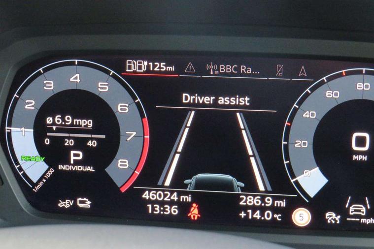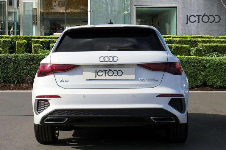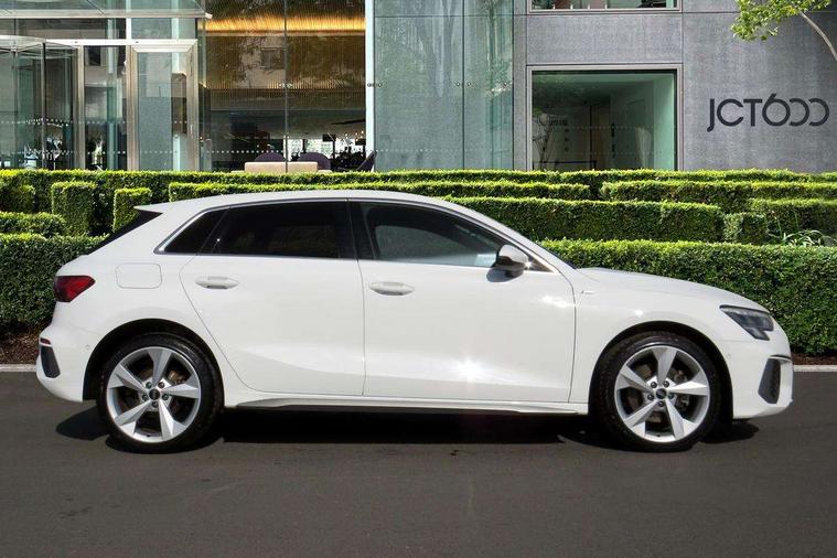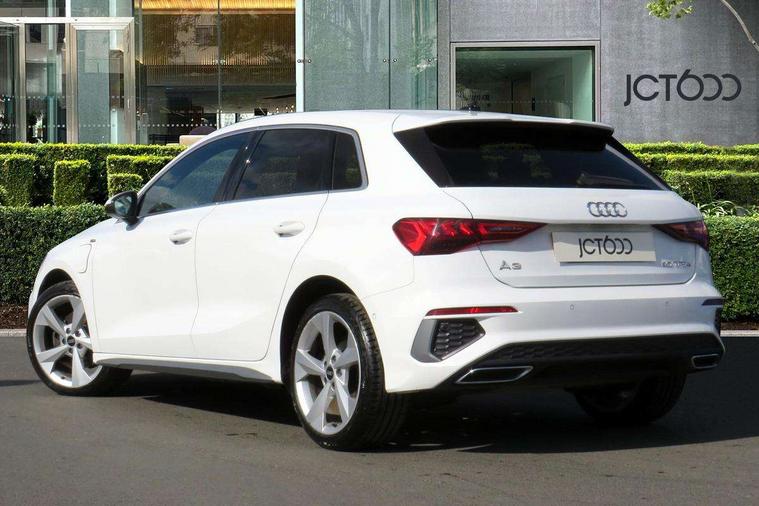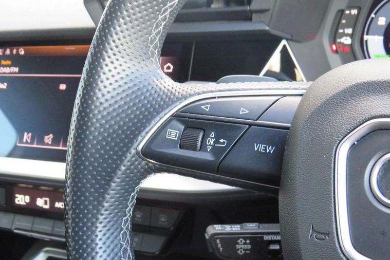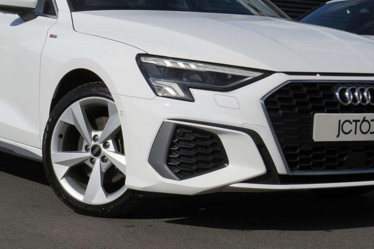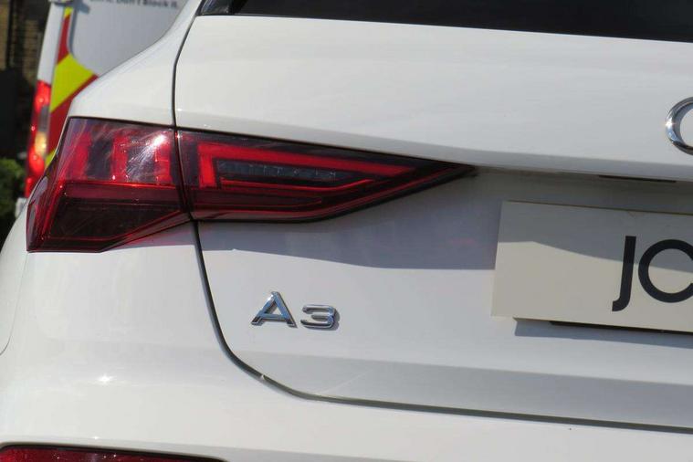 Audi connect emergency call and service, Audi drive select (Auto, Comfort, Dynamic, Efficiency and Individual), Audi smartphone interface, Audi Virtual Cockpit - 10.25" digital and colour instrument cluster, Automatic start/stop system with recuperation, Bluetooth interface, Collision avoidance assistant, Electromechanical power speed sensitive steering, Lane departure warning system, MMI Navigation Plus with high resolution 10.1" colour touch screen display, Service indicator, Trip computer, Voice control system with natural language interaction, 3 pin 10 amp domestic charging cable, Type 2 mode 3 32 amp charging cable, Type 2 socket for AC charging, 2xUSB-C connection with data and charging functions, 6 passive loudspeakers, DAB Digital radio, 3rd brake light, Acoustic glass windscreen, Aluminium window trim, Auto dimming frameless rear view mirror, Electrically adjustable/heated/folding/auto dimming door mirrors with integrated LED indications + kerb view function for passenger side, Front electric windows, Illuminated aluminium inserts front door sills with S logo, LED daytime running lights, LED headlights with LED rear lights and dynamic rear indicators, Light and rain sensors, Privacy glass - dark tinted rear window, rear door and side windows, Rear electric windows, Rear side air outlets in grained matt black, Rear wiper, S line bumpers, S roof spoiler, 12V socket and storage compartment in front centre console, 40/20/40 split folding rear seat bench with cupholder, Black cloth headlining, Dual zone electronic climate control, Front and rear centre armrest in leather, Front and rear headrests, Front/rear floor mats, Height and reach adjustable steering wheel, Interior lighting - glove compartment light and right hand side, Luggage compartment floor covering, Manual boot compartment lid, Manually adjustable front seats, Seat side bolsters, Stainless steel pedals and front footrest, Twin leather upholstery with front sports seats S embossed logo, Aluminium interior elements pack - A3 Sportback, S line styling pack - A3 Sportback, 3x3 point rear seat belts, Driver and front passenger airbag with passenger airbag deactivation, Electronic Stabilisation Control (ESC) including ABS, ASR and EDL, First aid kit with warning triangle and 2 safety vests, Front side airbags with head airbags and interaction airbag, Hill hold assist, Pre-sense front with pedestrian and cyclist detection, Seatbelt monitoring, Tyre pressure loss indicator, Anti theft alarm, Anti-theft wheel bolts, Electronically operated child lock, Immobiliser, Remote control central locking, Accent surfaces in the dashboard and centre console in platinum grey silk effect paint finish, Dark spectrum aluminium inlays, Tool kit, Tyre repair kit,