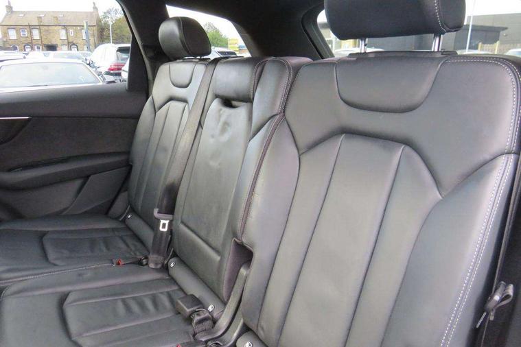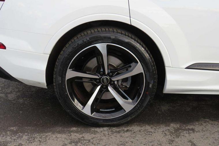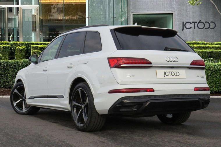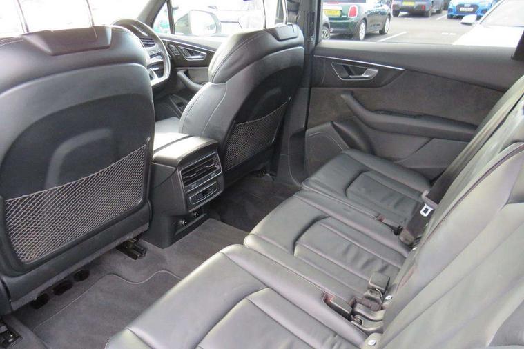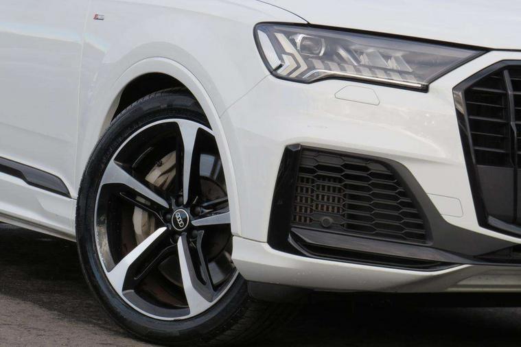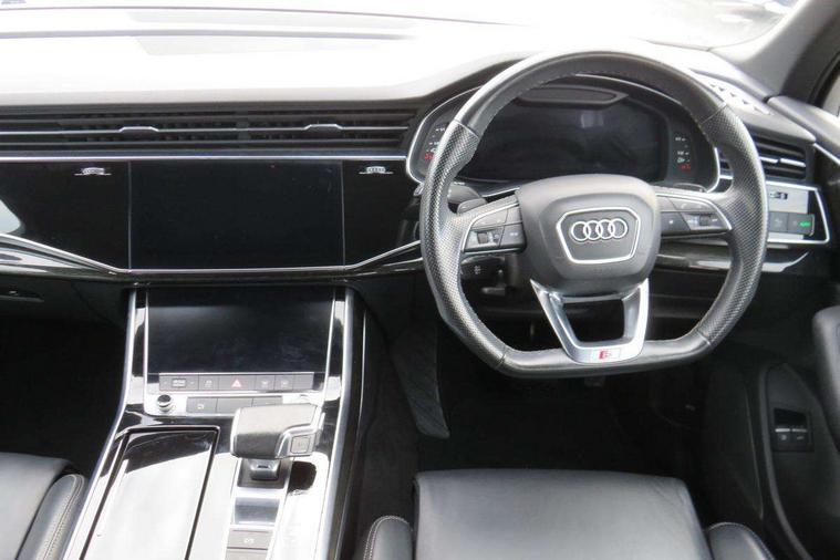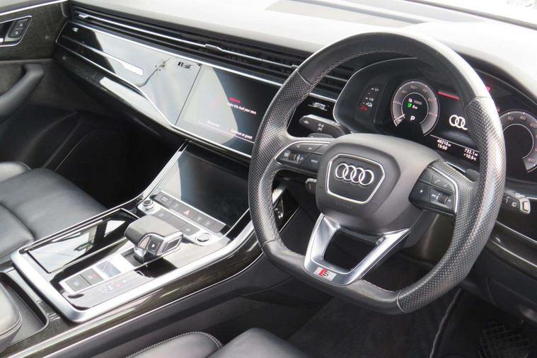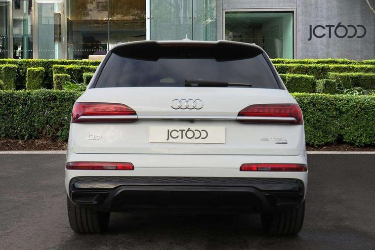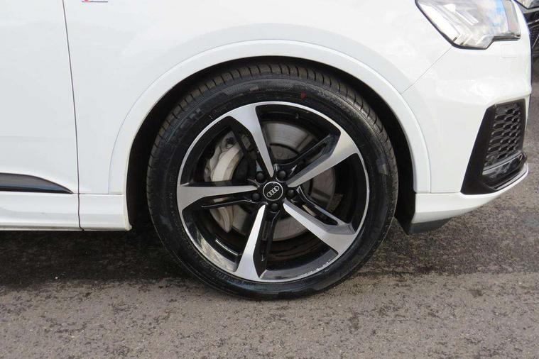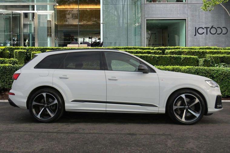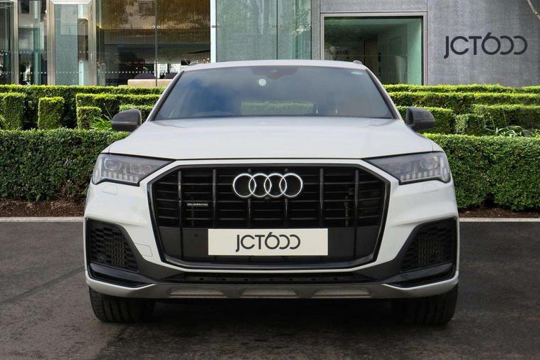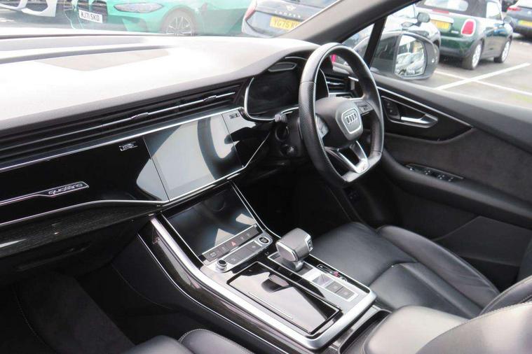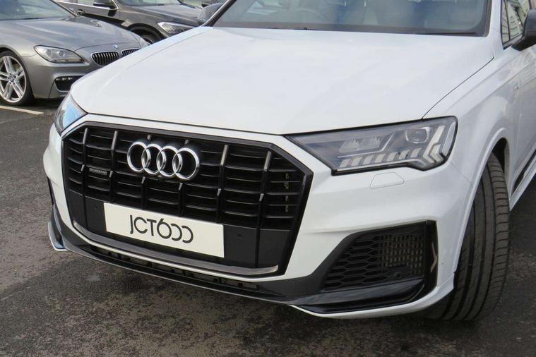 Audi connect safety and service (e-call), Audi drive select (Auto, Comfort, Dynamic, Efficiency, Individual, Off-road and All road), Audi phone box with wireless charging, Audi smartphone interface includes wireless Apple carplay/Android Auto, Audi virtual cockpit - 12.3" high-resolution LCD display with fully customisable instrument cluster, Camera based traffic sign recognition, Electromechanical steering, MMI navigation plus with MMI touch screens includes 10.1" and 8.6" screens with haptic feedback, Natural voice recognition, Power operated tailgate, Start/stop system, 3 pin 10 amp domestic charging cable, 75 litre fuel tank, Adaptive air sports suspension, Quattro all wheel drive with self locking centre differential, Type 2 mode 3 charging cable, Type 2 socket for AC charging, Audi music interface - front 2 USB-C ports with charger and data functions, DAB digital radio module, Audi matrix LED headlights with dynamic front and rear indicators, Auto dimming frameless rear view mirror, Black roof rails, Bumpers in contrast paint scandium grey finish includes door trim and wheel arch trim strips, inlays in door strip contain quattro embossing, Electrically adj heated/folding + automatically dimming exterior mirrors with memory + automatic kerb side function for passenger side exterior mirror, Heat insulating glass in windshield, Integrated LED indications in door mirrors, LED daytime running lights, LED rear tail lights, Privacy glass - dark tinted rear and rear side windows from B-pillar backwards, 3 zone automatic air conditioning including remote pre-conditioning, 5 seat layout with ISOFIX points for the front passenger seat and rear passenger seat, Black cloth headlining, Comfort front centre armrest, Folding rear seats, Front head restraints, Front/rear floor mats, Heated front seats, Illuminated door sill trims with S logo, Rear head restraints, Sunvisors with illuminated vanity mirrors, Tool kit, Comfort and sound pack with Bang + Olufsen premium sound system - Q7, Titanium black styling pack - Q7/SQ7, 3 point seatbelts on all rear seats, Acoustic vehicle alerting system, Audi pre sense front, Driver and front passenger, front side and curtain airbags, Electromechanical parking brake, Electronic Stabilisation Control (ESC) including ABS, ASR and EDL, Extended pedestrian protection measures, Hill hold assist, Seatbelt monitoring, Tyre pressure loss indicator, Warning triangle and first aid kit, Anti theft alarm, Anti-theft wheel bolts and wheel loosening detection, Remote central locking, Darkened matt brushed aluminium inlays, Tyre repair kit,