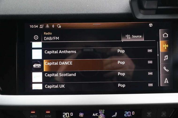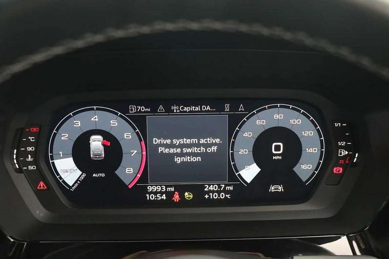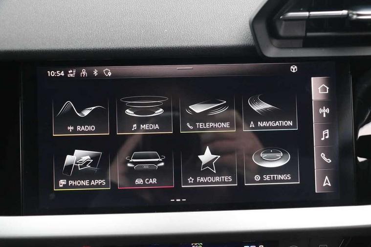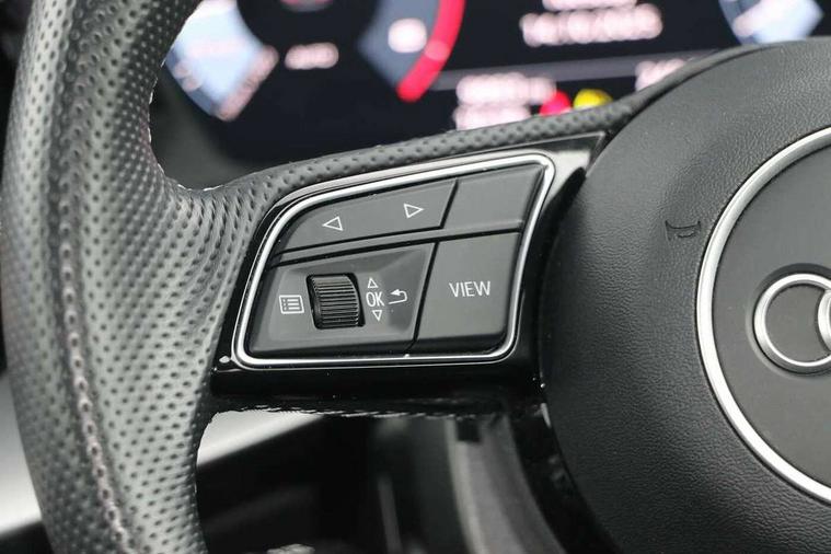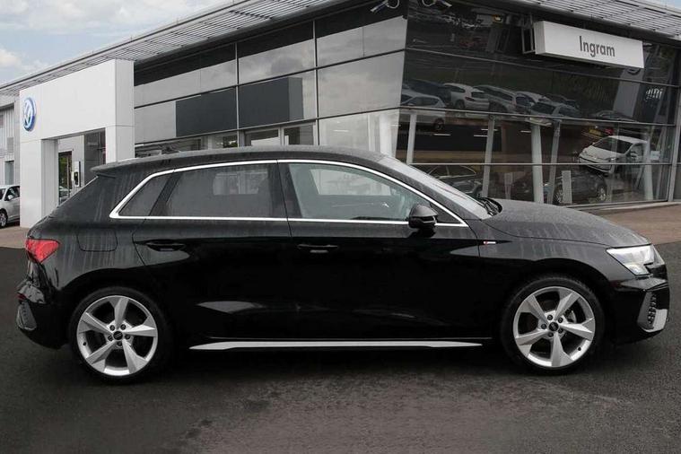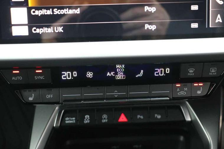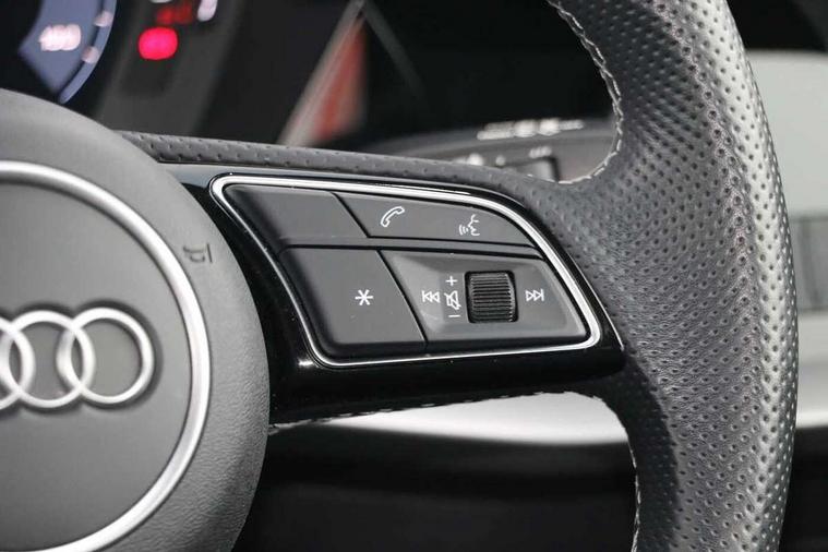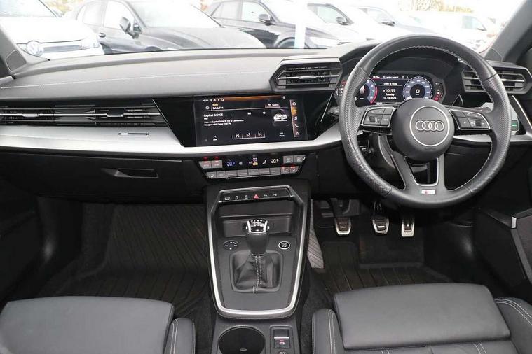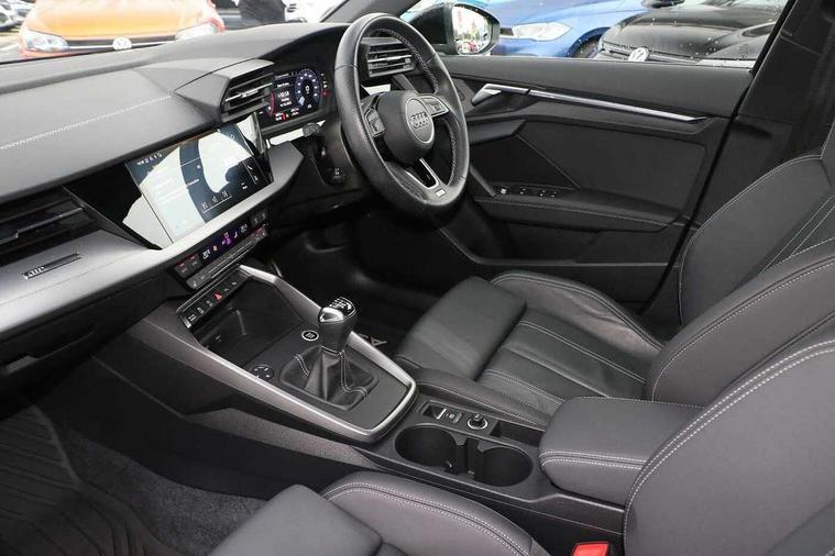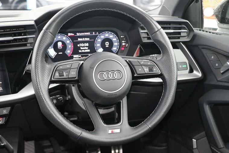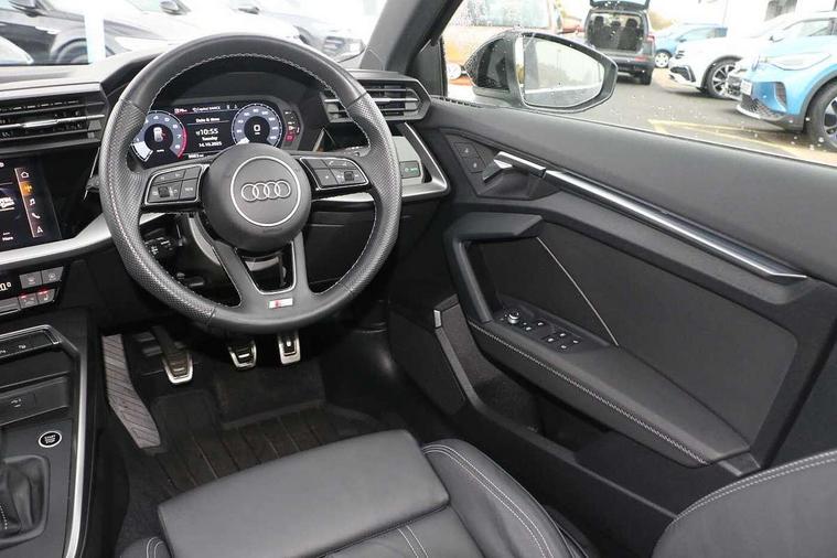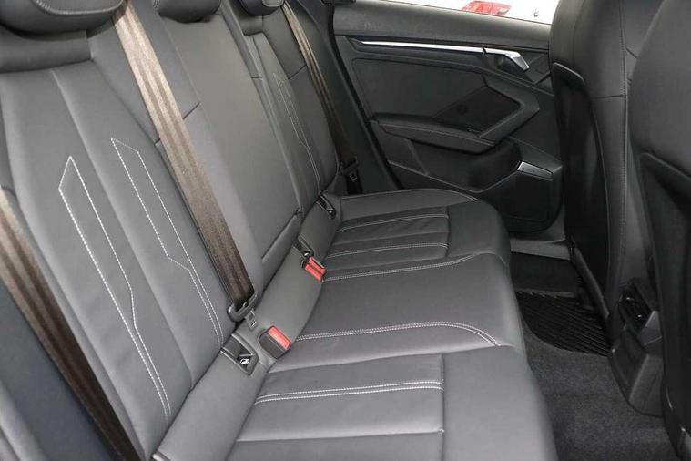 Audi drive select (Auto, Comfort, Dynamic, Efficiency and Individual), Audi smartphone interface, Audi Virtual Cockpit - 10.25" digital and colour instrument cluster, Automatic start/stop system with recuperation, Bluetooth interface, Collision avoidance assistant, Cruise control, e-Call (emergency call), Electromechanical power speed sensitive steering, Lane departure warning system, MMI Navigation Plus with high resolution 10.1" colour touch screen display, Rear parking sensors, Service indicator, Trip computer, Voice control system with natural language interaction, Sports suspension, 2xUSB-C connection with data and charging functions, 6 passive loudspeakers, DAB Digital radio, 3rd brake light, Acoustic glass windscreen, Aluminium window trim, Auto dimming frameless rear view mirror, Body colour exterior mirrors, Electrically adjustable/heated/folding/auto dimming door mirrors with integrated LED indications + kerb view function for passenger side, Front electric windows, Illuminated aluminium inserts front door sills with S logo, LED daytime running lights, LED headlights with LED rear lights and dynamic rear indicators, Light and rain sensors, Privacy glass - dark tinted rear window, rear door and side windows, Rear electric windows, Rear side air outlets in grained matt black, Rear side wing doors, Rear wiper, S line bumpers, S roof spoiler, 12V socket and storage compartment in front centre console, 3 seat bench in 2nd row, 3 spoke leather multifunction steering wheel, 40/20/40 split folding rear seat bench with cupholder, Black cloth headlining, Dual zone electronic climate control, Front and rear centre armrest in leather, Front and rear headrests, Front/rear floor mats, Height and reach adjustable steering wheel, Illuminated vanity mirror, Interior lighting - glove compartment light and right hand side, Luggage compartment floor covering, Manual boot compartment lid, Manually adjustable front seats, Seat side bolsters, Single front passenger seat, Stainless steel pedals and front footrest in black, Twin leather upholstery with front sports seats S embossed logo, Aluminium interior elements pack - A3 Sportback, LED interior lighting pack - A3 Sportback, S line styling pack - A3 Sportback, 3x3 point rear seat belts, Audi pre sense front, Driver and front passenger airbag with passenger airbag deactivation, Electronic Stabilisation Control (ESC) including ABS, ASR and EDL, First aid kit with warning triangle and 2 safety vests, Front side airbags with head airbags and interaction airbag, Pre-sense front with pedestrian and cyclist detection, Seatbelt monitoring, Tyre pressure loss indicator, Anti theft alarm, Anti-theft wheel bolts, Electronically operated child lock, Immobiliser, Remote control central locking, Accent surfaces in the dashboard and centre console in platinum grey silk effect paint finish, Dark spectrum aluminium inlays,
