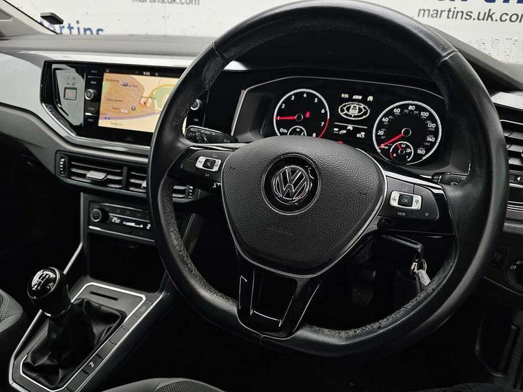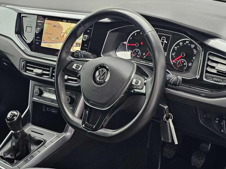 App-Connect, Digital clock, Driver alert system, Multifunction computer plus, Power assisted speed sensitive steering, Speedo and rev counter, electronic odometer, trip, service interval display and fuel gauge, Start/stop system, Volkswagen connect, Warning buzzer and light for front seatbelts unfastened, Battery regeneration during braking, Galvanished body, Black grille with chrome surround, Black radiator grille with chrome louvres, Body colour bumpers, Body colour door handles, Body colour rear spoiler, Body coloured side sills, Chrome trimmed front air intake surrounds, Chrome trimmed strip on lower bumper, Electric front windows, Front fog lights including static cornering, Front windscreen washers and wipers with 4 speed intermittent delay, Heat insulating tinted glass, Heated rear window with auto timer, High level 3rd brake light, LED daytime running lights, LED rear number plate lights, Rear electric windows, Rear windscreen washer and wiper with interval delay, reverse activated, 2 bag hooks in luggage compartment, 2 front cupholders and 12 V socket with cover, 3 rear head restraints, 60/40 split folding rear seat, Ambient lighting in front foorwell, front/rear door and dashboard light strips, Centre console storage with open storage compartment, Chrome-plated electric mirror adjustment switch surround, Chrome-plated electric window button surround, Climate control - 2 zone electronic air conditioning with automatic air recirculation and allergy filter, Driver and front passenger sunvisors with illuminated vanity mirrors, Dust/pollen filter, Folding rear seat backrest, Front seat backrest storage pockets, Gear lever gaiter in black trim surround, Glovebox, Handbrake grip button in chrome effect, Height/reach adjustable steering column, Instrument lighting, adjustable panel illumination, Interior light with delay, Isofix Preparation 2 Rear child seats, Jack and tool kit, Leather gear knob and handbrake grip, Leather multifunction steering wheel, LED interior lighting - 2 reading lights front and rear with interior delay and dimming function, Luggage compartment cover, removable, Luggage compartment lighting, Luggage compartment with variable load floor, Storage compartment in front doors, Storage compartment in rear doors, Storage compartment under front seats, Discover navigation infotainment pack - Polo, Light and sight pack - Polo, 3 point height adj front seatbelts + pretensioners, 3x3 point rear seatbelts, ABS, Automatic post collision braking, Driver/front passenger airbag, Drivers and front passengers safety optimised head restraints, ESP with EDL + ASR, Front and rear passenger curtain airbags, Front passenger airbag deactivation, Front seat side impact airbags, Front/rear disc brakes, Hill hold control, Hydraulic Brake Assist (HBA), Single tone horn, Tyre pressure monitoring system, Alarm with interior protection and deactivation via infotainment system, Electronic engine immobiliser, Remote central locking with 2 remote folding keys, Chrome plated air vent surround, Chrome plated instrument surrounds, Limestone grey decorative inserts,