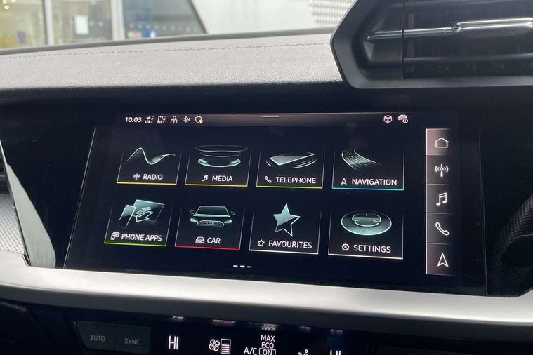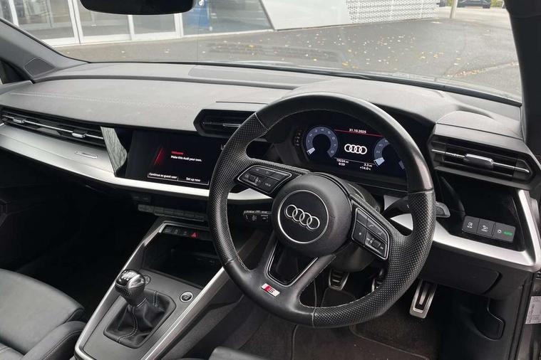 Audi drive select (Auto, Comfort, Dynamic and Individual), Audi smartphone interface, Audi Virtual Cockpit - 10.25" digital and colour instrument cluster, Automatic start/stop system with recuperation, Bluetooth interface, Camera based traffic sign recognition, Collision avoidance assistant, Cruise control, e-Call (emergency call), Electromechanical power speed sensitive steering, Lane departure warning system, MMI Navigation Plus with high resolution 10.1" colour touch screen display, Rear parking sensors, Service indicator, Trip computer, Voice control system with natural language interaction, Sports suspension, 2xUSB-C connection with data and charging functions, 6 passive loudspeakers, DAB Digital radio, 3rd brake light, Acoustic glass windscreen, Aluminium window trim, Auto dimming frameless rear view mirror, Body colour exterior mirrors, Electrically adjustable/heated/folding/auto dimming door mirrors with integrated LED indications + kerb view function for passenger side, Front electric windows, Illuminated door sills with aluminium inserts at the front with S logo, LED daytime running lights, LED headlights with LED rear lights and dynamic rear indicators, Light and rain sensors, Privacy glass - dark tinted rear window, rear door and side windows, Rear electric windows, Rear side air outlets in grained matt black, Rear side wing doors, Rear wiper, S line bumpers, S roof spoiler, 12V socket and storage compartment in front centre console, 3 seat bench in 2nd row, 3 spoke leather multifunction steering wheel, 4 way electrically adjustable lumbar support for driver and front passenger, 60/40 split folding rear seat bench, Black cloth headlining, Dual zone electronic climate control, Front and rear centre armrest in artificial leather, Front and rear headrests, Front/rear floor mats, Height and reach adjustable steering wheel, Interior lighting - glove compartment light and right hand side, Luggage compartment floor covering, Manual boot compartment lid, Manually adjustable front seats, Seat side bolsters, Single front passenger seat, Stainless steel pedals and front footrest in black, Twin leather upholstery with front sports seats S embossed logo, Aluminium interior elements pack - A3 Sportback, LED interior lighting pack - A3 Sportback, S line styling pack - A3 Sportback, 3x3 point rear seat belts, Driver and front passenger airbag with passenger airbag deactivation, Electronic Stabilisation Control (ESC) including ABS, ASR and EDL, First aid kit with warning triangle and 2 safety vests, Front side airbags with head airbags and interaction airbag, Pre-sense front with pedestrian and cyclist detection, Seatbelt monitoring, Tyre pressure loss indicator, Anti theft alarm, Anti-theft wheel bolts, Electronically operated child locks, Immobiliser, Remote control central locking, Dark spectrum aluminium inlays, accent surfaces in the dashboard and centre console in platinum grey silk effect paint finish,