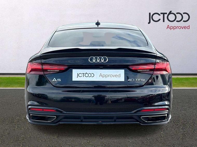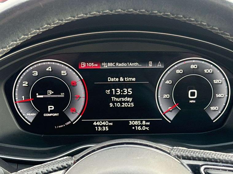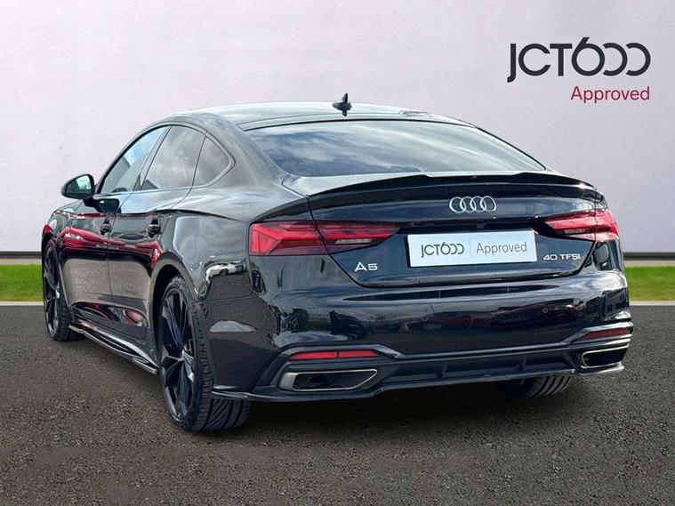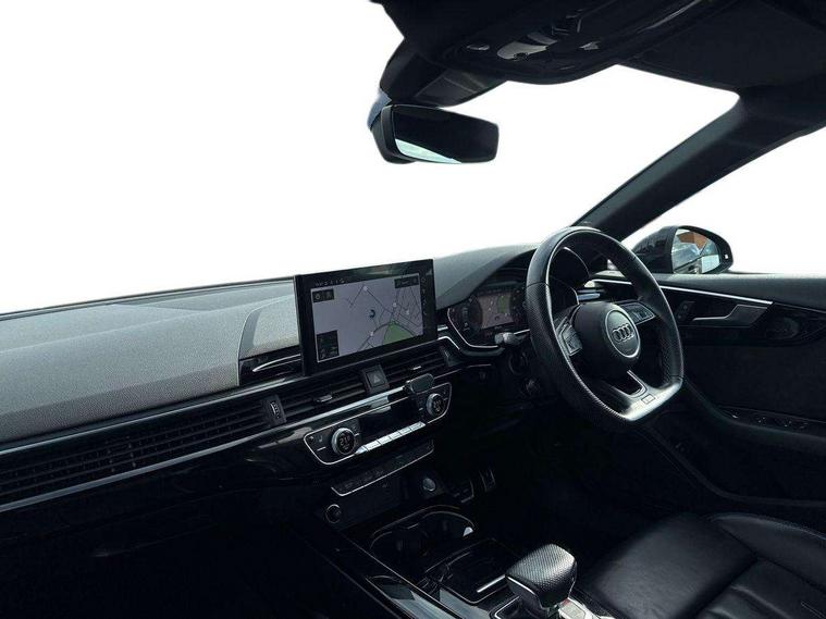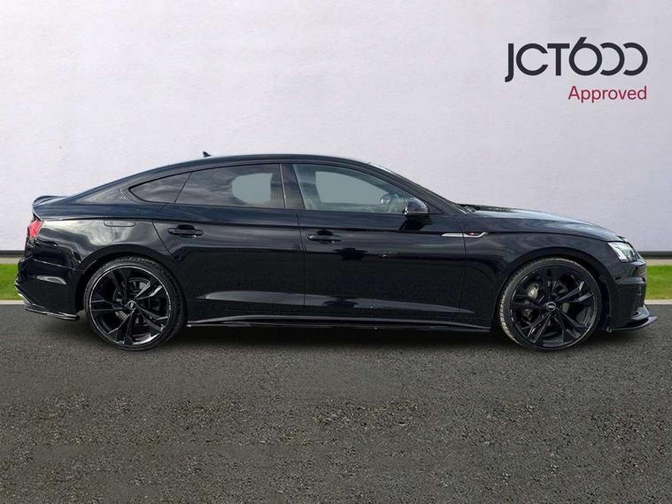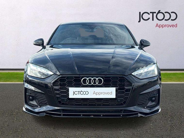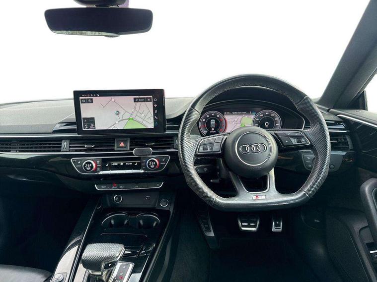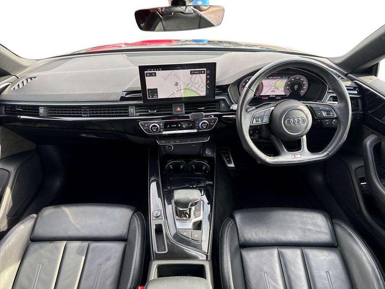 Audi connect safety and service (e-call), Audi drive select (Auto, Comfort, Dynamic, Efficiency and Individual), Audi parking system plus with front and rear sensors, Audi phone box with wireless charging, Audi smartphone interface, Audi virtual cockpit - 12.3" full colour digital instrument cluster, vehicle/engine speed, Radio/media information+Driver assistance systems, Automatic start-stop system with coasting functionality and efficiency programme, Bluetooth interface, Electro-mechanical power steering, Email, calendar and text messages displayed via MMI, MMI nav+ with MMI touch - 10.1" high resolution MMI display, touch sensitive, 3D map, route/country info, dynamic route guide, personal route assist, Power operated tailgate, Rear view camera, Service interval indicator, Voice control system, Sports suspension lowered by 23mm, 8 passive loudspeakers, CD player, DAB digital radio reception, Two additional USB ports for rear passenger in rear centre console, Two SDXC card slots, Auto dimming rear view mirror, Black door mirror housings, Body colour bumpers, Body colour door handles, Body colour front spoiler lip, Body colour side sill trim, Electric adjustable heated door mirrors, Electric folding door mirrors, Electric front windows, Front fog lights, Honeycomb structure radiator grille in grained matt black, Matrix LED headlights with Audi laser light, dynamic light sequencing and dynamic indicator, Matt aluminium silver tailpipe trim, Privacy glass, Rain and light sensors, Rear diffuser in matt titanium black with trim strip in matt aluminium silver, Side air inlets in grained matt black with matt aluminium silver inlay, Sport front and rear bumpers with side skirts, Towbar preparation, Windscreen with acoustic glazing, 4 way electric lumbar support for driver and front passenger, 40/20/40 split folding 3 seater rear bench seat, Adjustable steering column, Black cloth headlining, Black perforated leather gearknob, Contrast stitching on seats, steering wheel and gear lever gaiter, Deluxe 3 zone electronic climate control, Electrically adjustable front seats, Fine Nappa leather upholstery with front sports seats S embossed logo, Front centre armrest, Front head restraints, Front/rear floor mats, Heated front seats, Illuminated door sill trim with S logo, ISOFIX child seat mounting and top tether, Luggage compartment mat, Rear headrests, Stainless steel pedals, Sunvisors with vanity mirrors, Tool kit, Black styling pack - A5 Coupe/Sportback, LED interior light pack - A5/RS5, 3x3 point rear seatbelts, 6 airbags - Driver, front passenger, curtain and side airbags, Electromechanical parking brake, Electronic Stabilisation Control (ESC) including ABS, ASR and EDL, Front passenger airbag deactivation, Height adjustable front seatbelts, Hill hold assist, Multi collision brake assist, Pop-up bonnet for pedestrian protection, Seatbelt monitoring, Tyre pressure warning, Variable restraint system, Warning triangle and first aid kit, Anti theft alarm system, Anti theft wheel bolts, Immobiliser, Keyless Go, Remote central locking, Piano black finish inlay, 20" 5 twin spoke polygon design alloy wheels in gloss anthracite black and gloss turned finish, Tyre repair kit,