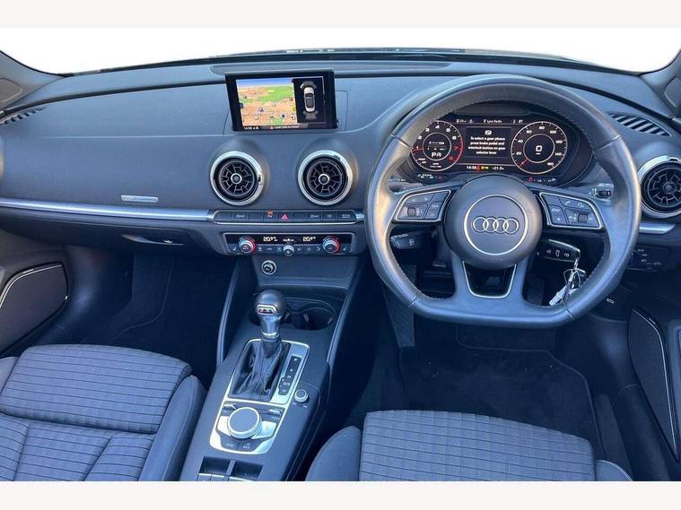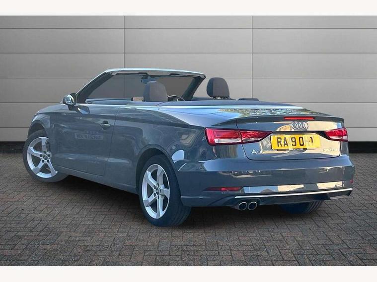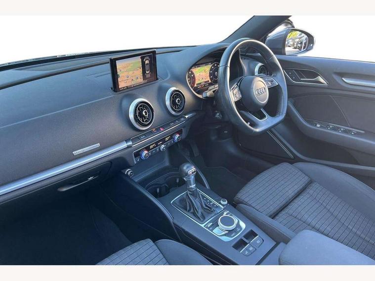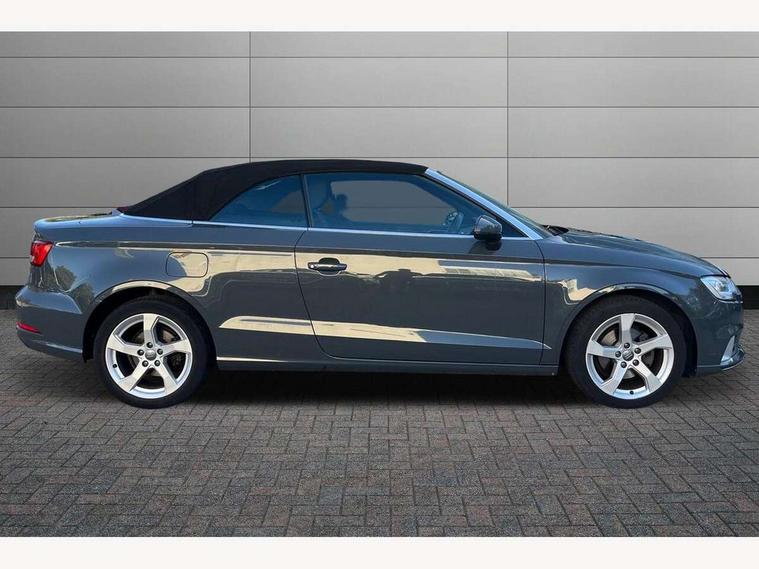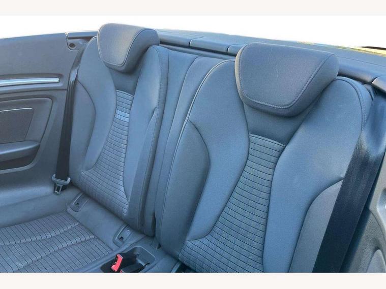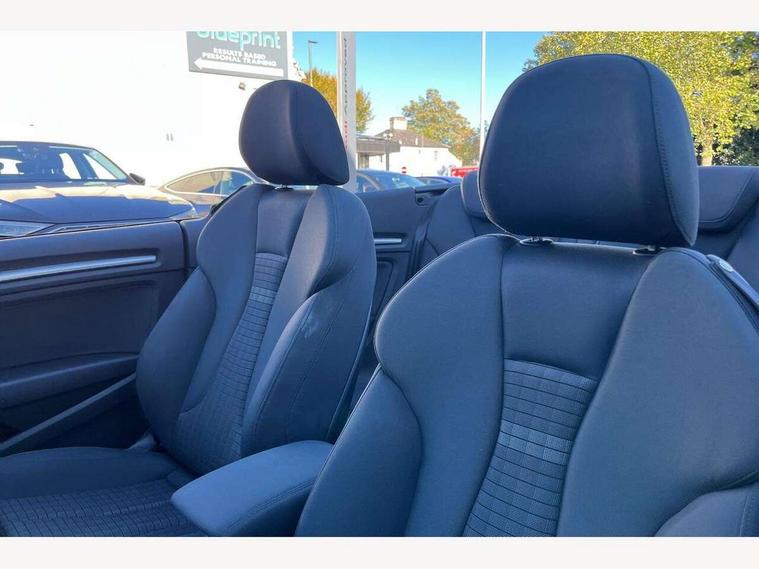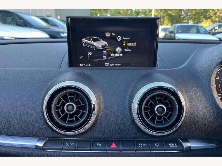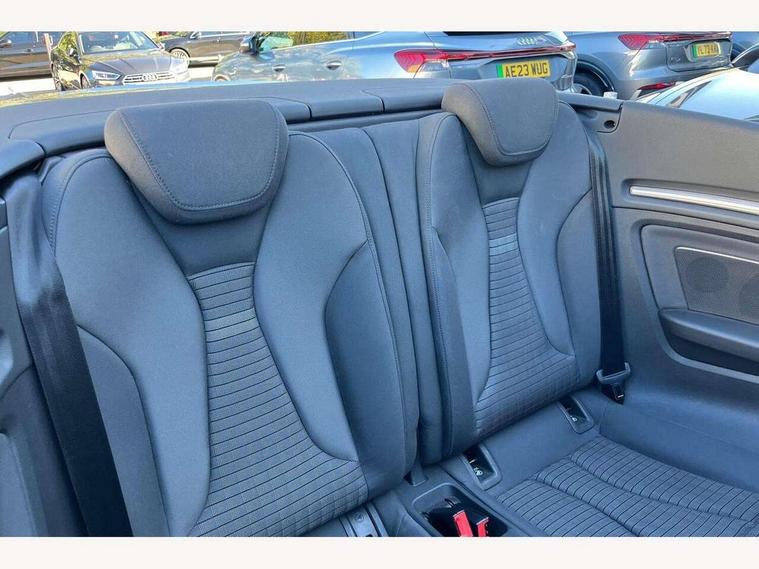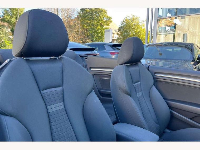 Audi drive select, Audi smartphone interface, Automatic start/stop system, Bluetooth interface, Colour driver's information system display, Electro-mechanical PAS, SD card based MMI navigation, Service interval indicator, 2 USB ports, Audi music interface, Auxiliary input socket, CD player, DAB Digital radio, MMI radio plus with 7" colour MMI screen and MMI controller, Aluminium side window trim, Auto dimming rear view mirror with light and rain sensors, Automatic lights and wipers, Body colour bumpers, Body colour door mirrors with integral indicators, Chrome exhaust tailpipes, Electric operated/heated door mirrors, Front and rear electric windows, Fully automatic acoustic hood, Heated front windscreen, Heated rear window, Heated windscreen washer jets, LED daytime running lights, Roof spoiler, Sport specific side air inlet grille and diffuser insert, Xenon headlights, 2 height adjustable rear headrests, 4 lashing points to secure luggage, 50/50 split folding rear seat, Adjustable front armrest, Aluminium door sill trims, Driver/passenger sunvisors, Dual zone electronic climate control, Front sports seats, Front/rear floor mats, Height adjustable front seats, Height/reach adjustable steering column, Illuminated glovebox, Isofix child seat preparation, Storage box under drivers seat, Storage compartment in centre console, Storage compartments in doors, Tool kit, Light and rain sensor pack - A3 Cabriolet, Non smoking pack - A3, 2 x 3-point rear seat belts, 3 point front seat belts, ABS/EBD, Active bonnet, Active front headrests, ASR, Automatic roll over protection, Driver and passenger side airbags, Driver/Front Passenger airbags, Drivers knee airbag, EDL, Electromechanical parking brake, ESC - Electronic Stability Control + traction control, Front passenger airbag deactivation, Hill hold assist, Seatbelt warning, Tyre pressure monitor, Warning triangle and first aid kit, Anti theft alarm, Anti-theft wheel bolts, Immobiliser, Remote control central locking, Aluminium air vent surrounds, Aluminium mistral silver inlay, Aluminium trim elements, Space saver spare wheel,