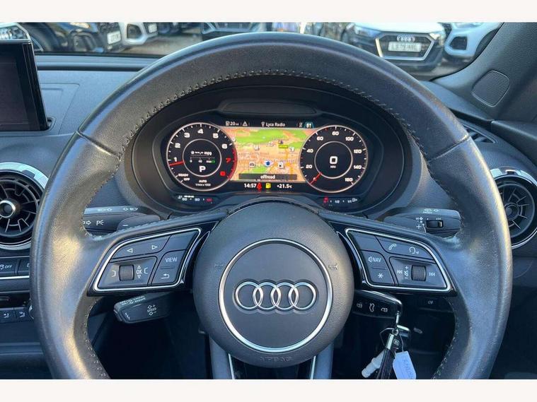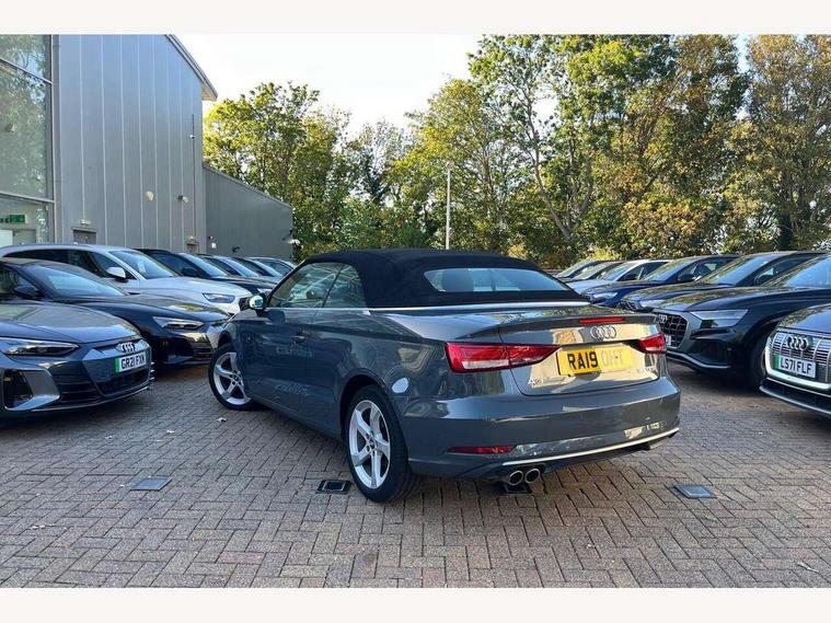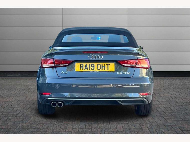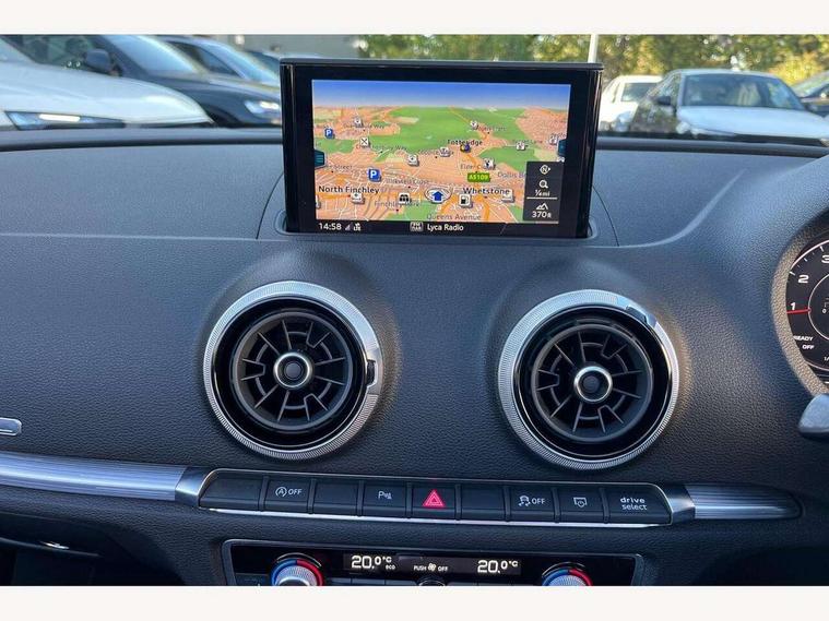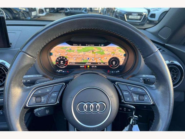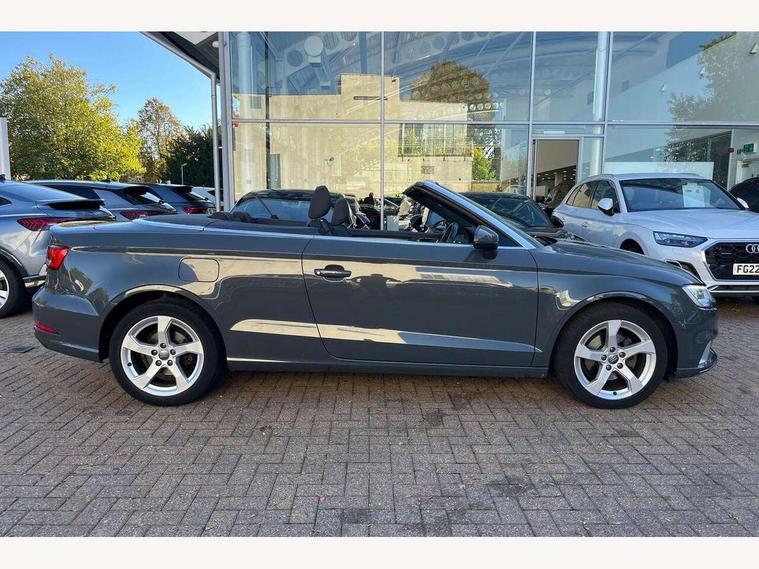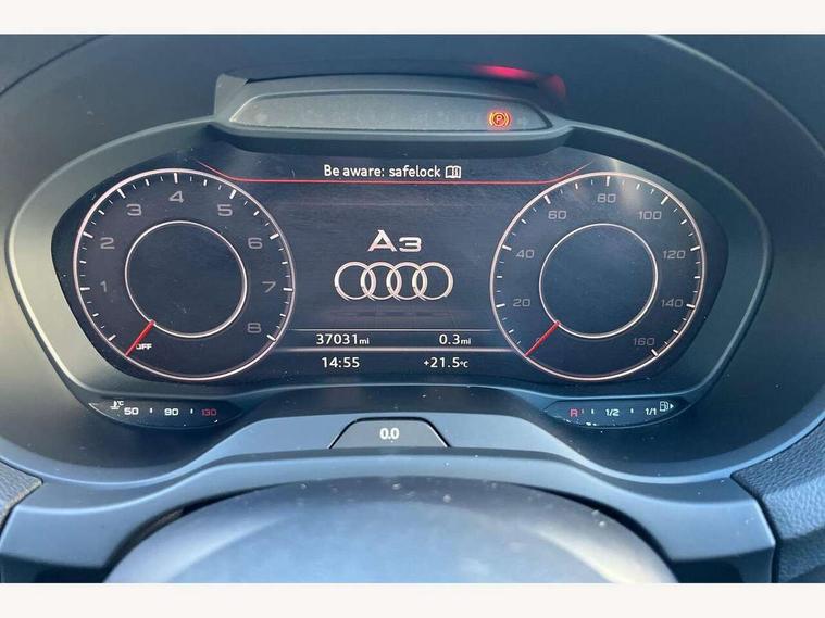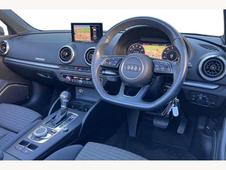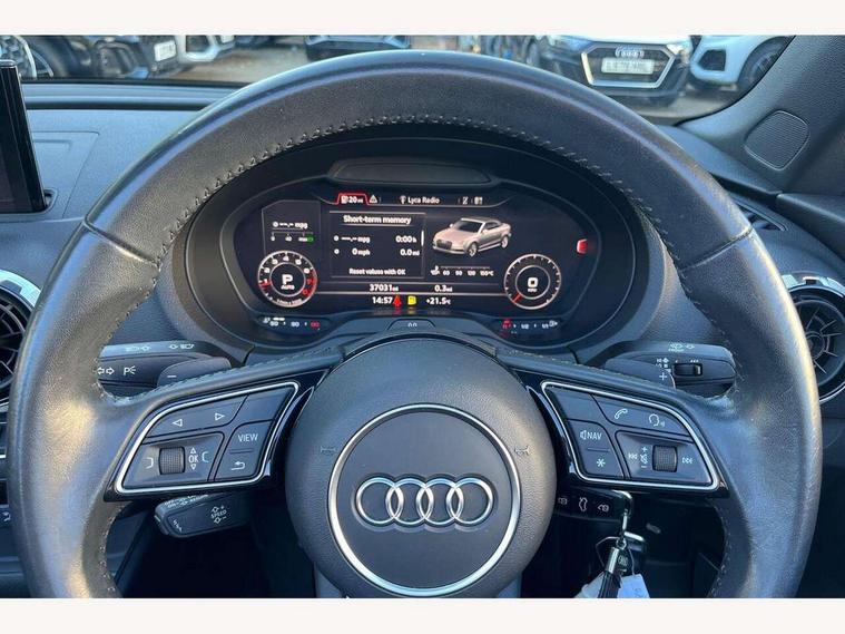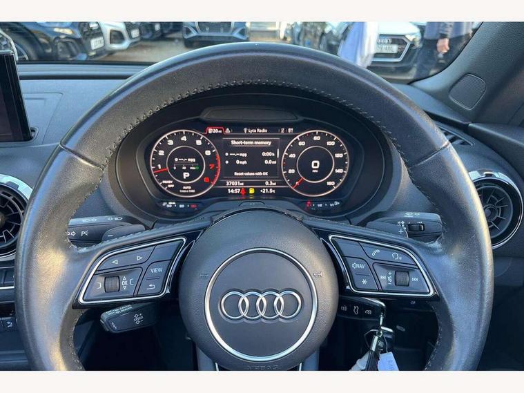 Audi drive select, Audi smartphone interface, Automatic start/stop system, Bluetooth interface, Colour driver's information system display, Electro-mechanical PAS, SD card based MMI navigation, Service interval indicator, 2 USB ports, Audi music interface, Auxiliary input socket, CD player, DAB Digital radio, MMI radio plus with 7" colour MMI screen and MMI controller, Aluminium side window trim, Auto dimming rear view mirror with light and rain sensors, Automatic lights and wipers, Body colour bumpers, Body colour door mirrors with integral indicators, Chrome exhaust tailpipes, Electric operated/heated door mirrors, Front and rear electric windows, Fully automatic acoustic hood, Heated front windscreen, Heated rear window, Heated windscreen washer jets, LED daytime running lights, Roof spoiler, Sport specific side air inlet grille and diffuser insert, Xenon headlights, 2 height adjustable rear headrests, 4 lashing points to secure luggage, 50/50 split folding rear seat, Adjustable front armrest, Aluminium door sill trims, Driver/passenger sunvisors, Dual zone electronic climate control, Front sports seats, Front/rear floor mats, Height adjustable front seats, Height/reach adjustable steering column, Illuminated glovebox, Isofix child seat preparation, Storage box under drivers seat, Storage compartment in centre console, Storage compartments in doors, Tool kit, Light and rain sensor pack - A3 Cabriolet, Non smoking pack - A3, 2 x 3-point rear seat belts, 3 point front seat belts, ABS/EBD, Active bonnet, Active front headrests, ASR, Automatic roll over protection, Driver and passenger side airbags, Driver/Front Passenger airbags, Drivers knee airbag, EDL, Electromechanical parking brake, ESC - Electronic Stability Control + traction control, Front passenger airbag deactivation, Hill hold assist, Seatbelt warning, Tyre pressure monitor, Warning triangle and first aid kit, Anti theft alarm, Anti-theft wheel bolts, Immobiliser, Remote control central locking, Aluminium air vent surrounds, Aluminium mistral silver inlay, Aluminium trim elements, Space saver spare wheel,