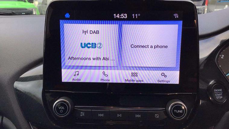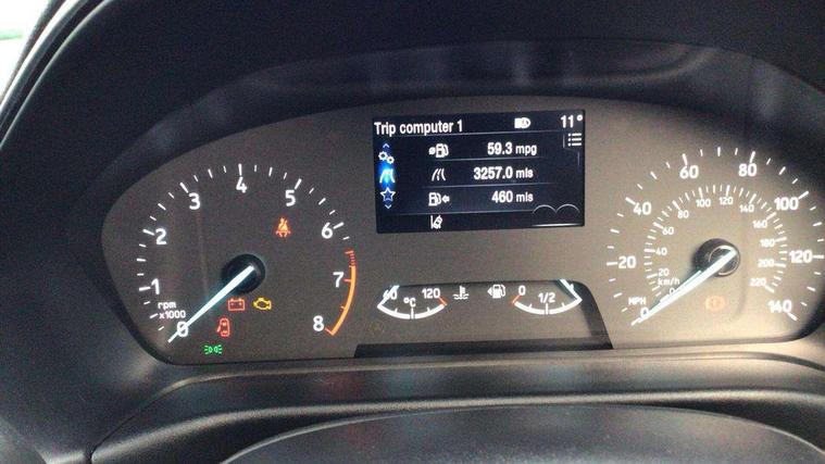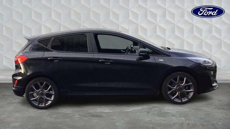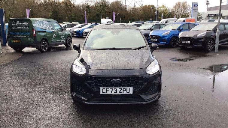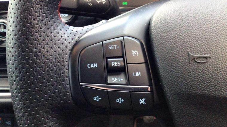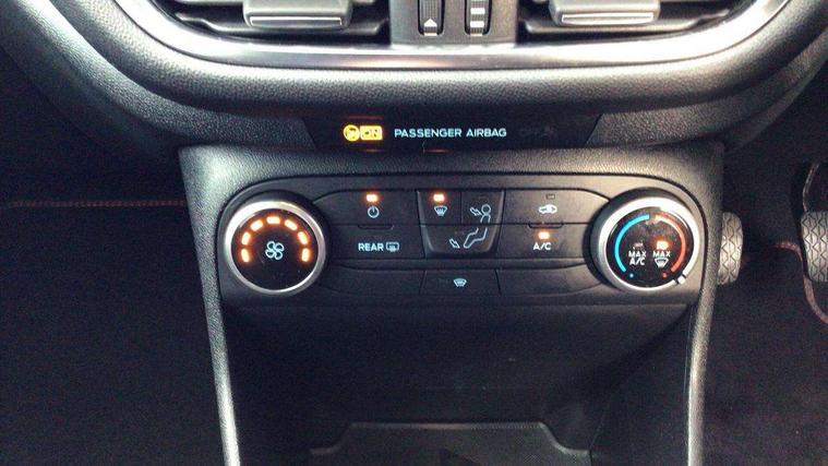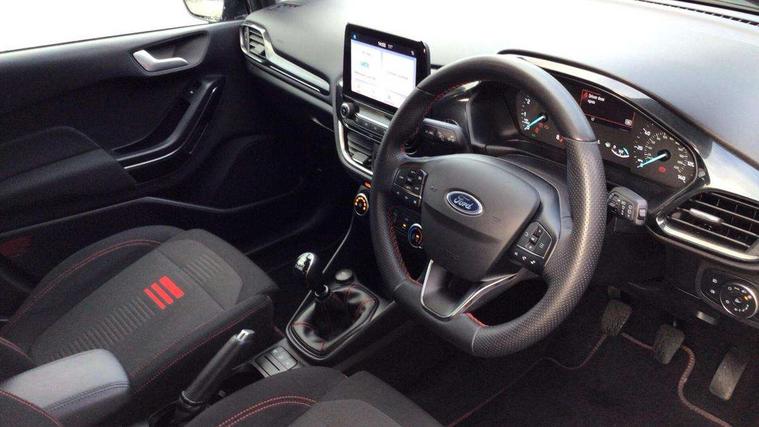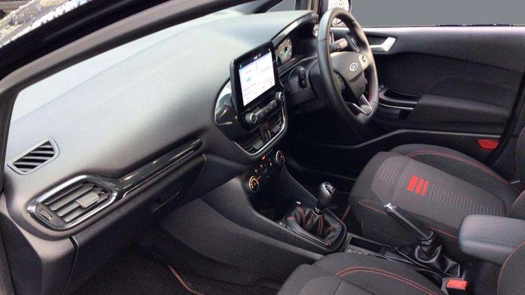 4.2" Colour TFT Ice blue illumination analogue cluster, Driver alert system, Electric power steering, Ford easy fuel, Lane keep assist, Lane keeping aid, Rear parking distance sensors, Selectable drive modes (Normal, Sport, Track), Trip computer, Sports suspension, 3rd brake light, Auto high beam, Automatic headlights, Body colour bumpers, Body colour large rear spoiler, Body coloured electrically operated with side indicators, Electric front windows/one touch facility, Electric rear windows, Quickclear heated windscreen, Rain sensing wipers and auto dimming rear view mirror, Rear privacy glass, Rear side wing doors, Rear wiper, Unique ST-Line grille, full bodystyling kit and large body coloured rear spoiler, 3 rear headrests, 3 seat bench in 2nd row, Adjustable head restraints, Black headlining, Centre console with opening armrest, 2x cupholders, 12v and USB, Cloth upholstery with red stitching, Leather gear knob, Manual 2 way passenger seat adjust, Manual 4-way driver seat adjust, Manual air conditioning, Premium floor mats, Sensico wrapped steering wheel, Single front passenger seat, 3 point seatbelts on all rear seats, Electronic stability control with hill start assist, Front and rear seat belt warning, Manual child lock in rear doors, Tyre pressure monitoring system, Keyless start with 'Ford Power' starter button, MyKey system, Remote central locking, Thatcham alarm with power door dead locks, 17" 5x2 spoke alloy wheels with rock metallic finish,
