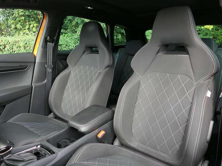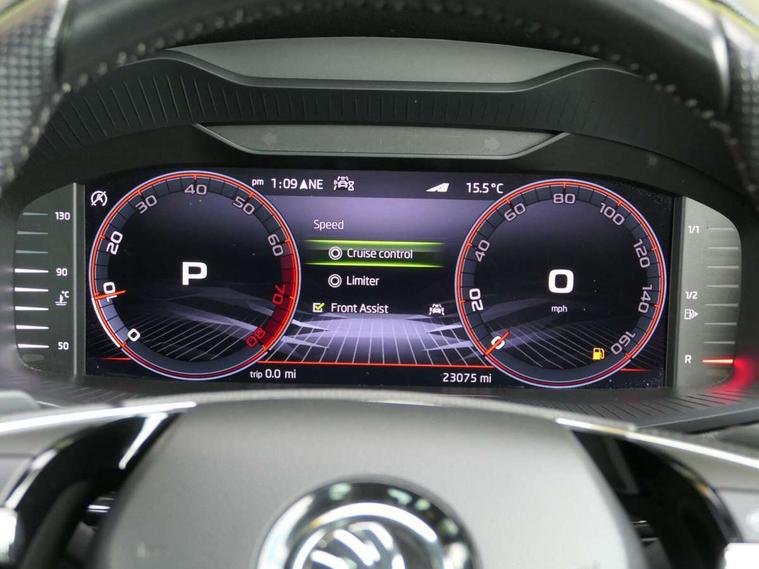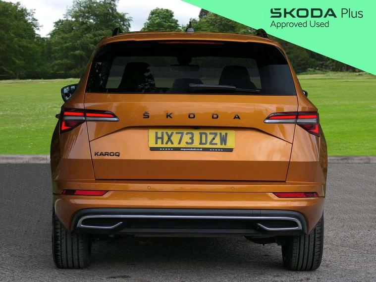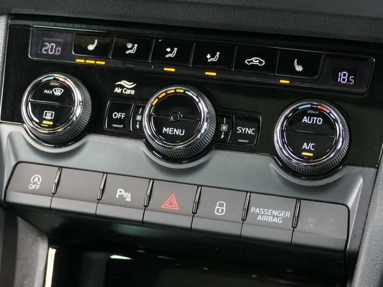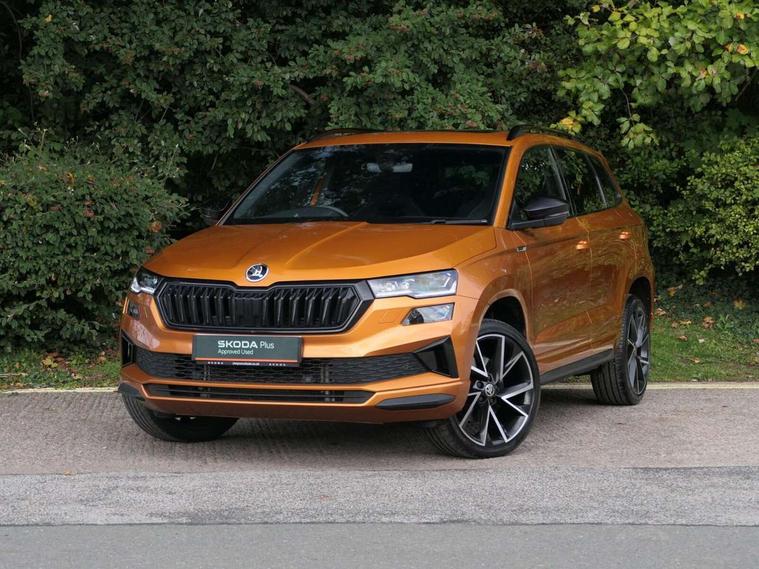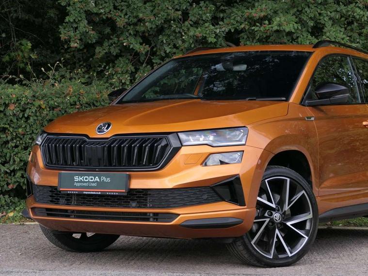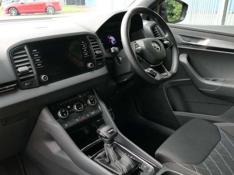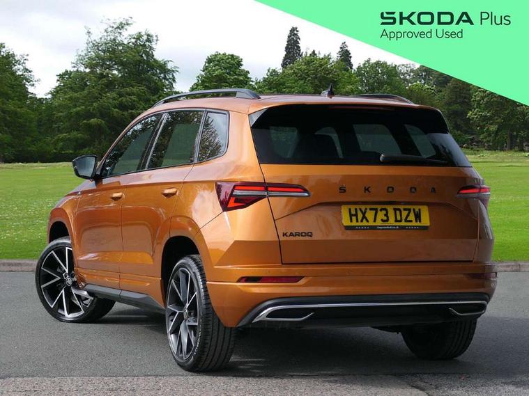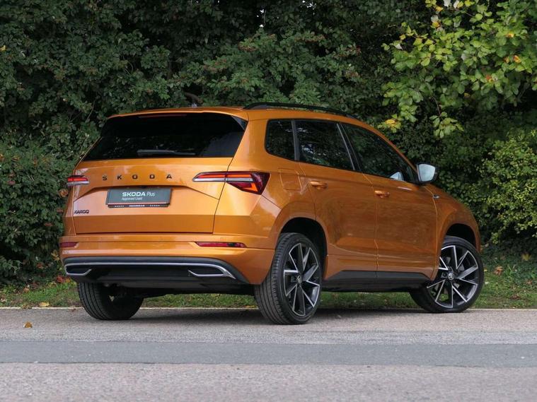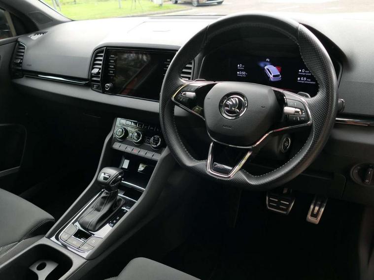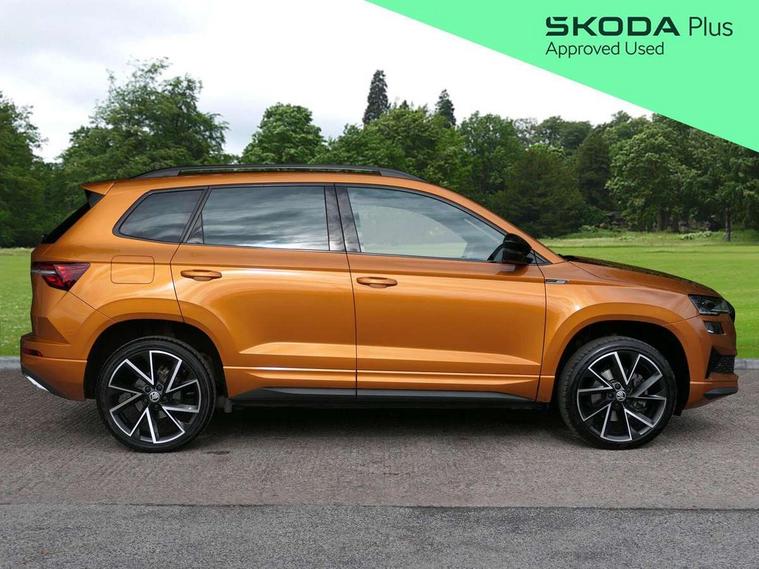 8" Digital display, Care connect, Driver fatigue sensor, Emergency services call system, Outside temperature gauge, Service interval indicator, SmartLink wireless for Apple and wired for Android, Start/stop system with regenerative braking, USB C Port x 2 in front centre console, Virtual cockpit, Virtual pedal with electrically operated boot door, 8 Speakers, DAB radio with Bluetooth, USB connection, Wireless charging without wireless aerial connection, Acoustic glass, Aero front windscreen wipers with intermittent function, Auto dimming rear view mirror with light and rain sensors, Black door mirrors, Black electric window control buttons, Black radiator grille, Black roof rails, Body colour door handles, Electric front and rear windows with child proof lock, Front door steps with SportLine logo, Heated rear windscreen, LED daytime running lights, LED rear lights with high functionality welcome effect and dynamic indicators, Light assistant (coming/leaving home/tunnel light), Panoramic sliding sunroof, Plastic scuff plates, Privacy glass, Protective door side sills in body colour, Rear diffuser, Rear side wing doors, Rear spoiler, Rear window wiper with washer system and intermittent control, Safety reflectors on front doors, Skoda lettering on tailgate in black, Sportline badge on front fender, Sportline decorative inserts with badging, Sports front and rear bumpers, 1.5 litre bottle holders in driver and front passenger door panels, 12V socket in boot, 12v socket in front centre armrest with storage compartment and rear air vents, 3 rear height adjustable headrests, 3 seat bench in 2nd row, 3 spoke leather sports multifunction steering wheel and silver stitching with gear shift paddles, 4 foldable roof handles with rear coat hooks, Black floor carpet, Black roof headlining, Chrome inner door handles, Double sided boot floor, Foldable hooks in the boot, Front head restraints, Height adjustable front three point seats belts with tensioners, Height/reach adjust steering wheel, Ice scraper, Illuminated glovebox, Illuminated luggage compartment, Isofix child seat preparation outer rear, Manual lumbar support for front seats, Pen holder, Pollen filter, Rear boot cover, Rear reading lights, Rear seats fixed folding and divided 60:40, Rubbish bin door, Safety vest holder, Single front passenger seat, Storage box in upper central dashboard closed, Sunvisors with illuminated vanity mirrors, Textile floor mats, Ticket holder, Titan black interior ceiling, Welcome animation with sportline logo, Boot pack - Karoq, Light Pack - Karoq, Parking pack - Karoq, Automatic door unlocking in case of crash, Automatic fuel cut off in case of crash, Child locks on rear doors, Driver airbag, Electronic parking brake with auto hold function, Emergency rear braking signal, ESC including ABS, MSR, ASR, EDS, HBA, DSR, RBS, MKB and traction control, Front side airbags, Hill hold control, Knee airbags, Passenger airbag with switch-off function, Pedestrian monitor, Seatbelt reminder signalisation and pretensioner for all seats, Three point seatbelts rear, Two tone horn, Tyre pressure display, Tyre pressure monitor, Alarm with interior monitoring, back up horn and tilt sensor with safe function, Electronic engine immobiliser, Keyless entry and start/stop, Remote central locking with 2 remote folding keys, Black air vent surround, Black centre console, Satin black dashboard, Satin black door trim, 19" Sagitarius anthracite alloy wheels with matt black aero inserts, Anti-theft wheel bolts protection, Matt black aero hub caps, Tool kit,