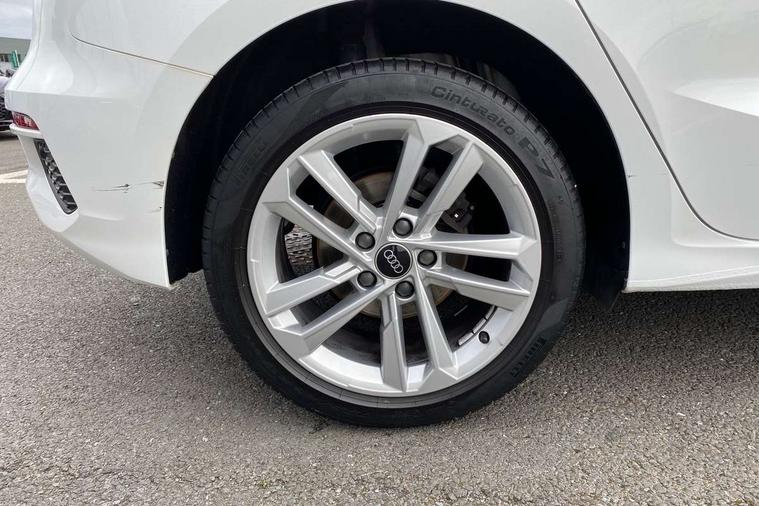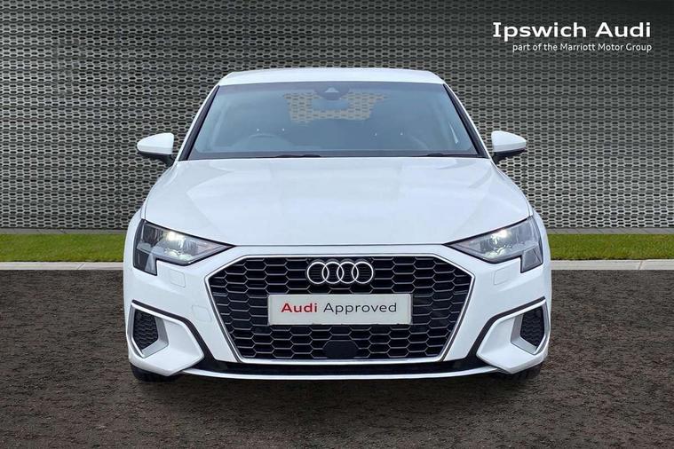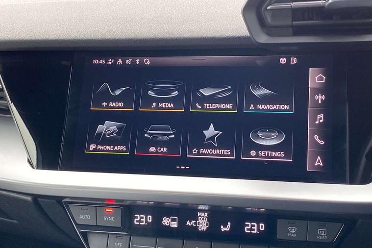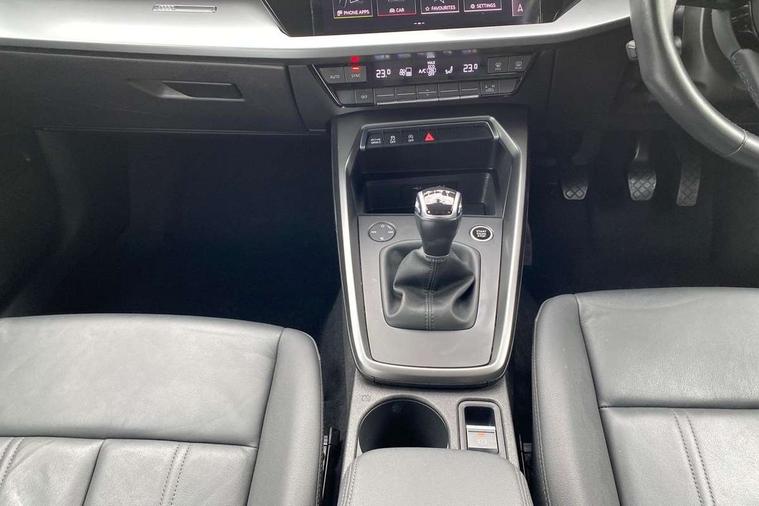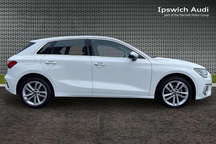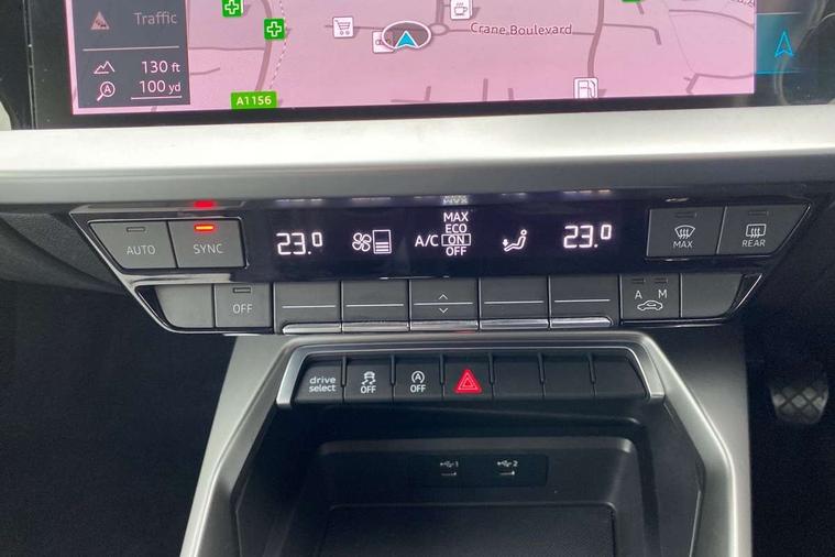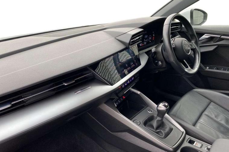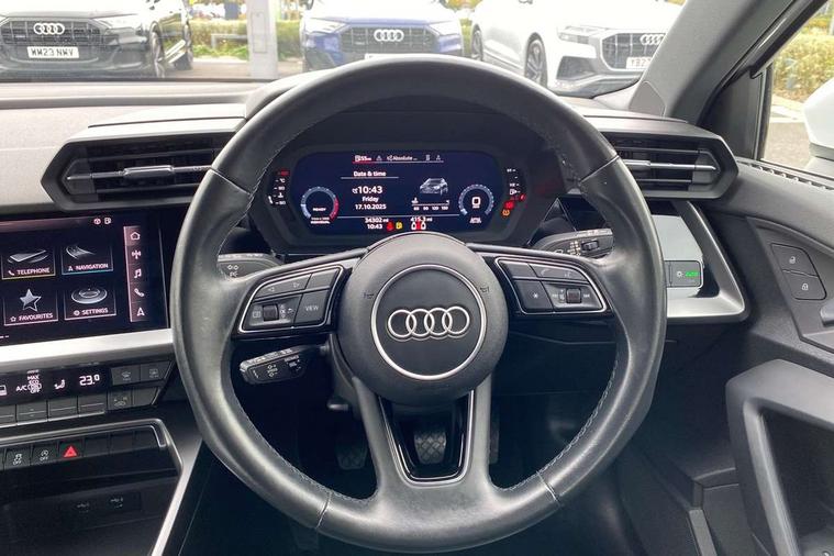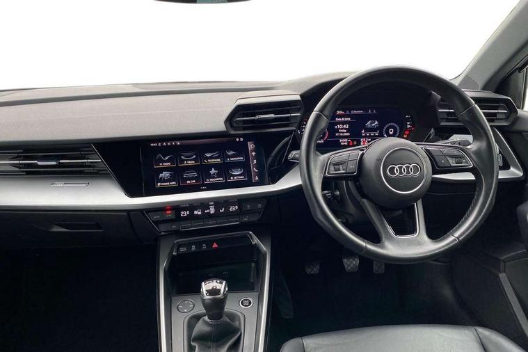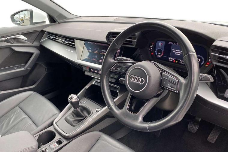 Audi connect emergency call and service, Audi drive select (Auto, Comfort, Dynamic and Individual), Audi smartphone interface, Audi Virtual Cockpit - 10.25" digital and colour instrument cluster, Automatic start/stop system with recuperation, Bluetooth interface, Collision avoidance assistant, Electromechanical power speed sensitive steering, Lane departure warning system, MMI Navigation Plus with high resolution 10.1" colour touch screen display, Service indicator, Trip computer, Voice control system with natural language interaction, Standard suspension, 2xUSB-C connection with data and charging functions, 6 passive loudspeakers, DAB Digital radio, 3rd brake light, Acoustic glass windscreen, Aluminium window trim, Auto dimming frameless rear view mirror, Body colour exterior mirrors, Body colour roof spoiler, Electrically adjustable/heated/folding/auto dimming door mirrors with integrated LED indications + kerb view function for passenger side, Front electric windows, LED daytime running lights, LED headlights and halogen rear lights, Light and rain sensors, Rear electric windows, Rear window, rear door windows and rear side windows in clear glass, Rear wiper, 12V socket and storage compartment in front centre console, 40/20/40 split folding rear seat bench with cupholder, Dual zone electronic climate control, Front and rear centre armrest, Front and rear headrests, Front door sill trims with aluminium inlay, Front/rear floor mats, Height and reach adjustable steering wheel, Interior lighting - Front and rear roof module including reading lights, glove compartment light and right hand side, Luggage compartment floor covering, Manual boot compartment lid, Manually adjustable front seats, Seat side bolsters, Steel grey cloth headlining, Twin leather upholstery, Aluminium interior elements pack - A3 Sportback, Sport styling pack - A3 Sportback, 3x3 point rear seat belts, Driver and front passenger airbag with passenger airbag deactivation, Electronic Stabilisation Control (ESC) including ABS, ASR and EDL, First aid kit with warning triangle and 2 safety vests, Front side airbags with head airbags and interaction airbag, Hill hold assist, Pre-sense front with pedestrian and cyclist detection, Seatbelt monitoring, Tyre pressure loss indicator, Anti theft alarm, Anti-theft wheel bolts, Electronically operated child lock, Immobiliser, Remote control central locking, Inlays with silk effect paint in platinum grey,