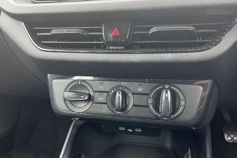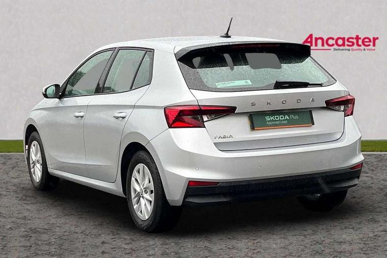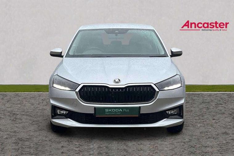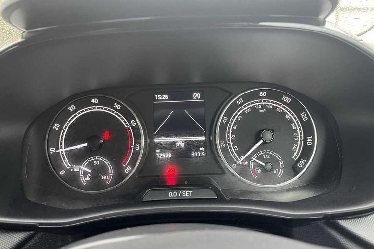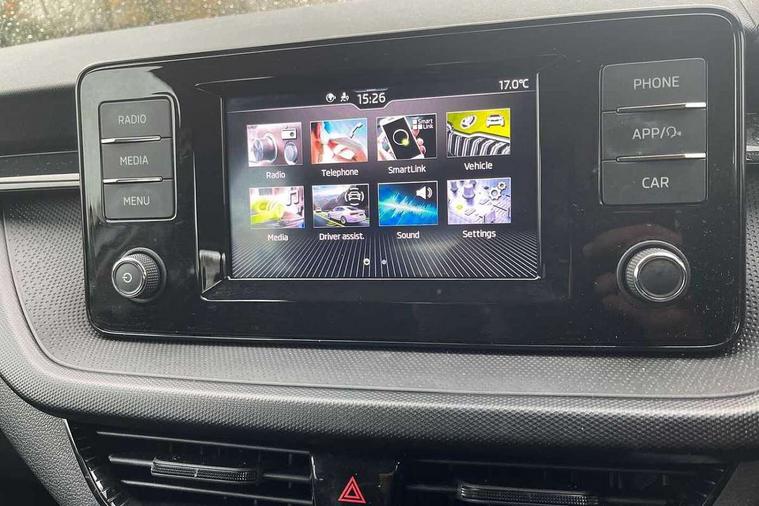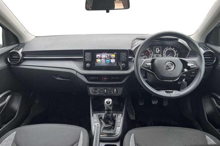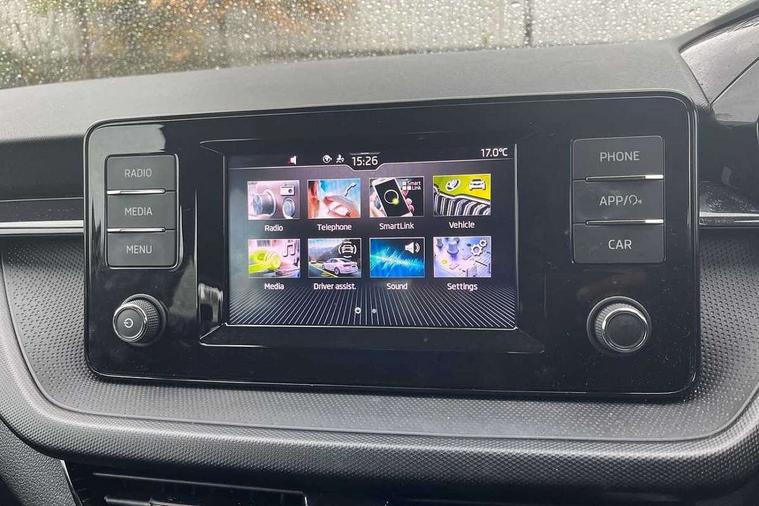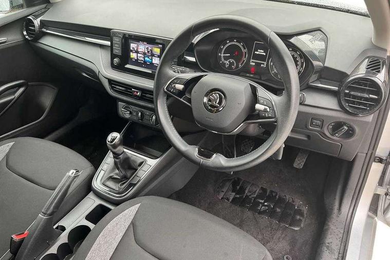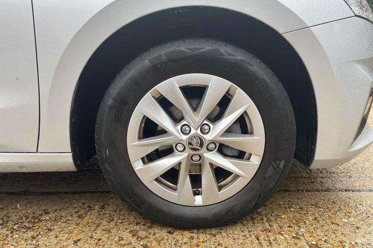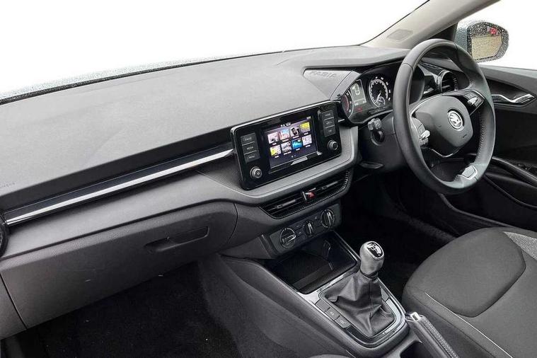 Bluetooth connection, Driver alert system - DAS, Electromechanical power steering, Exterior temperature gauge, Lane assist including road edge detection, Multifunction trip computer in black and white, Service interval indicator, Speed limiter, 2x USB-C in the front (for data transmission and charging), 4 speakers in front, Auxiliary socket for external MP3 player, DAB digital radio reception, Radio Swing with 6.5" colour display, Basic LED Headlights, Basic rear lights, Body colour door mirrors, Body coloured bumpers, Dimming rear view mirror with black frame, Door mirror integrated indicators, Electrically adjustable and heated door mirrors, Electrically adjustable front windows with function auto up/down, Front fog lights, Front window wiper intermittent control, Headlight range control - Automatic, Ice scraper in fuel cap, LED daytime running lights with coming and leaving home feature, Mechanical adjustable rear windows, Rain sensor, Rear LED fog light, Rear side wing doors, Rear window wiper with washing nozzles, Roof mounted spoiler, SKODA tailgate lettering in chrome, Third brake light, 2 reading lights in front and 2 reading lights in rear, 2 spoke leather multifunction steering wheel, 3 rear headrests, Backrest split and folding, Central console with fixed cup holder and storage box, Chrome handbrake release button, Fabric upholstery, Gearshift knob/handle in leather, Grain satin black interior door handles, Hand brake lever handle in leather, Height adjustable front headrests, Height adjustable front seats, Height adjustable steering wheel, ISOFIX and TopTether anchorage points to the outer rear seats, ISOFIX and TopTether on the front passenger seat, Luggage compartment lighting, Manual air conditioning, Manually adjustable lumbar support in front seats, Pollen filter, Rear seat bench unsplit, Single front passenger seat, Storm grey headlining, Sun visors with mirror and airbag label on passenger side, Ticket holder, 3-point height adjustable front seats belts with pretensioner and force limiter, Automatic warning lights in case of crash, Driver and passengers airbag with switch off function, e-Call+, ESC including ABS, MSR, ASR, EDS, HBA and XDS, Front and rear seat belt warning, FRONT ASSIST (AEB City and AEB Inter Urban), Front side airbags, Head airbags, One tone horn, Pedestrian protection, Three rear 3-points safety seat belts with pretensioner and force limiter including stop function for outer rear seat belts, Tyre pressure monitoring system, Anti-theft alarm system including immobiliser, interior monitoring, backup horn, and towing protection, Central locking with radio remote control, interior controls, SAFE function and 2 foldable keys, Black painted air vents, Glossy black decorative trim, Grain satin black central console cover, Grain satin black lower decorative trim, Satin black door and side trim panel in front, Anti-theft wheel bolts protection, Super-low rolling resistance tyres,