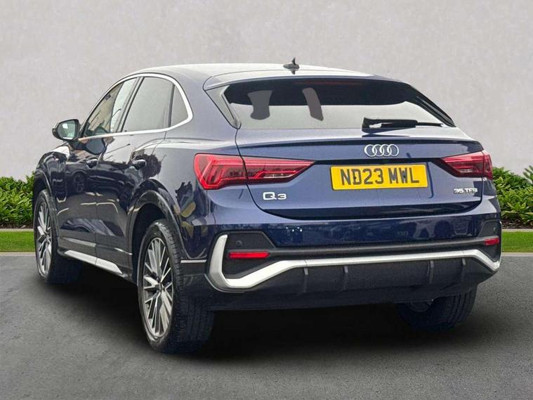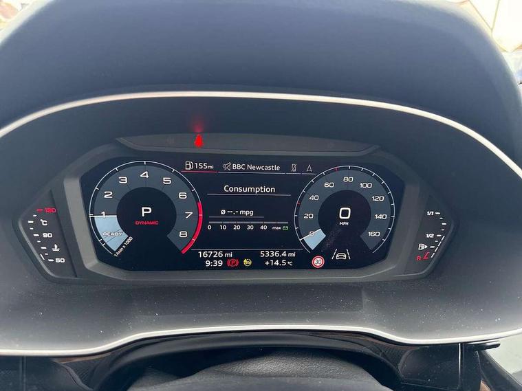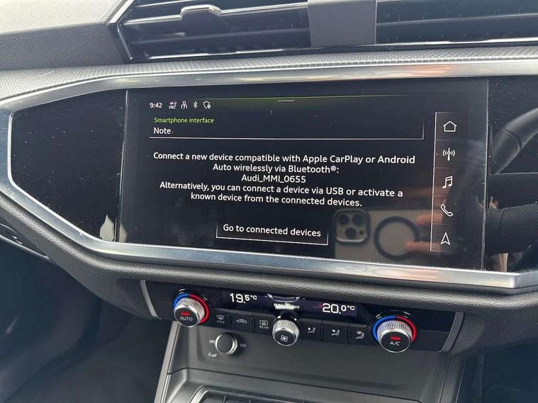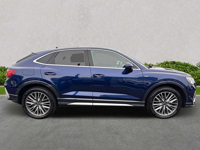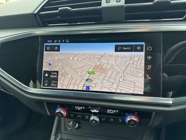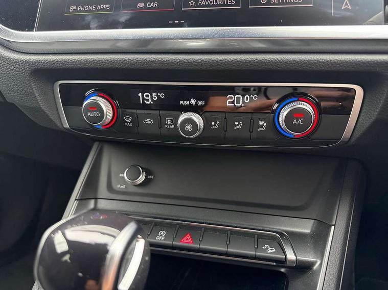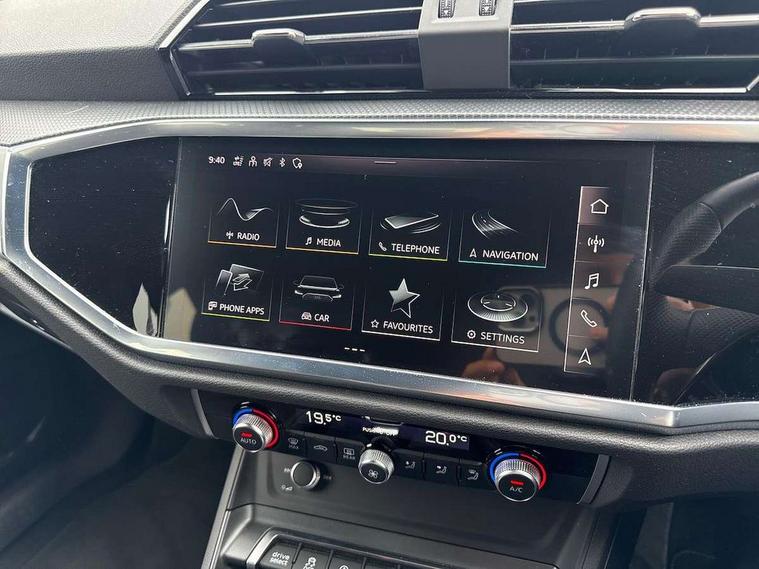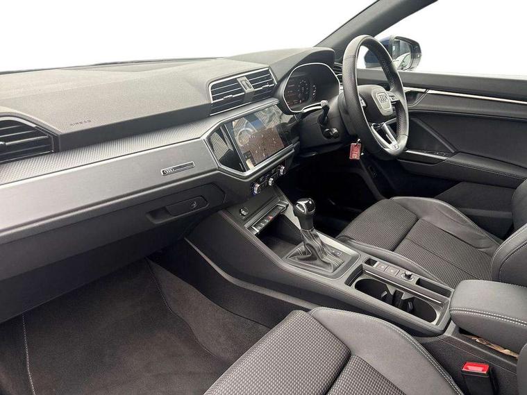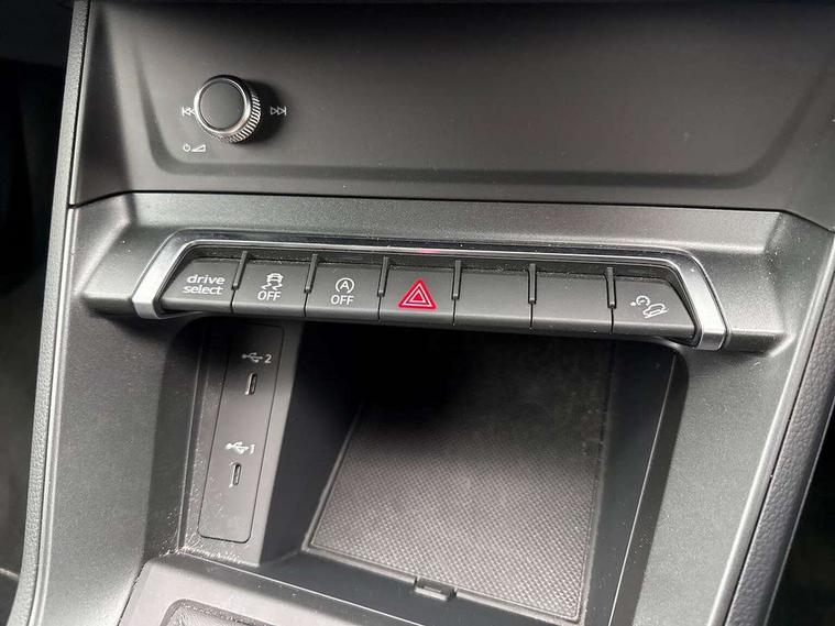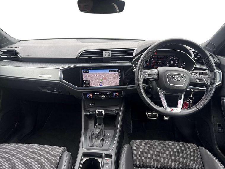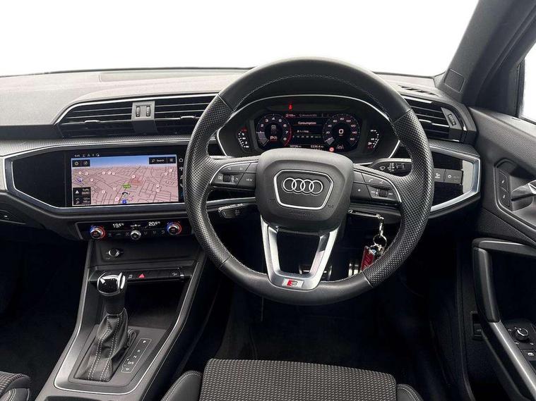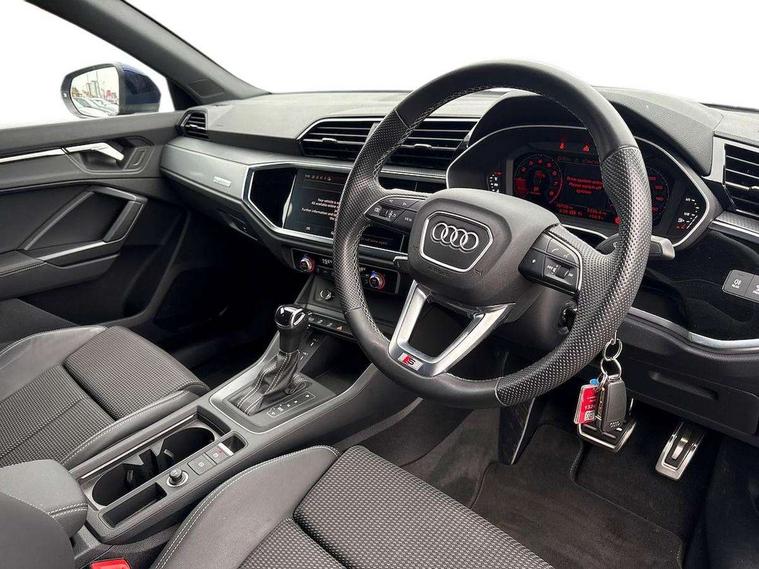 Audi drive select, Audi lane departure warning, Audi Virtual Cockpit - 10.25" display, Bluetooth interface, Camera based traffic sign recognition, Legal emergency call, MMI Navigation Plus with high resolution 10.1 inch touchscreen colour display, Power operated tailgate, Progressive steering, Service interval indicator, Smartphone interface includes wireless Apple carplay/Android Auto, Start stop system with recuperation, Voice control system with natural language interaction, Sports suspension, 2 USB-C ports with charge and data functions, 6 passive loudspeakers, DAB digital radio module, Acoustic windscreen, Aluminium window trim, Auto dimming frameless rear view mirror, Diffuser grille in grained matt black, Diffuser trim in selenite silver, Electrically folding, adjustable and heated door mirrors with integrated LED side indicators and kerb view function for passenger side, Front and rear electric windows, Front fog lights, Front side air inlets in selenite silver, Front underbody protection in manhattan grey paint finish, Grille surround in aluminium silver matt, High gloss black finish B and C pillars, LED Dynamic rear indicators, LED headlights with LED daytime running lights, LED rear lights, LED third brake light, Privacy glass dark tinted rear and rear-side windows (from B-pillar backwards), Radiator grille in anthracite black with inlay in matt aluminium silver, Rain and light sensors, Rear side wing doors, Rear underbody protection in matt black, Rear wiper, S line badges on front wings, S line front and rear bumpers and side skirts in contrasting Manhattan grey paint finish, Side skirt insert in matt Platinium grey, Variable front intermittent wipers, 12V socket in rear centre console, 3 seat bench in 2nd row, 3 spoke leather multifunction steering wheel features S badging and grips in perforated leather with contrast stitching, 40:20:40 folding with manual adjustment for 60:40 forwards/backwards position and backrest angle, Adjustable rear seat bench/backrest with centre armrest and cupholder, Black cloth headlining, Dual zone electronic climate control, Front and rear black floor mats with contrast stitching, Front and rear headrests, Front and rear roof module including reading lights, Front centre armrest, Glove compartment lighting, Height and reach adjustable steering wheel, Illuminated door sill trims with S logo, ISOFIX child seat mounting for front passenger with airbag deactivation and outer rear seat including top tether attachment point for outer rear seats, Luggage compartment light right in white, Luggage compartment sill protection in stainless steel, Manual front seats with height adjustment, Perforated leather gearknob, Single front passenger seat, Stainless steel pedals, Ambient lighting pack - Q3, Non smoking pack - Q3, 3x3 point rear seatbelts, 6 airbags - Driver, front passenger, curtain and side windows, Audi pre-sense front with pedestrain and cyclist recognition, Electrically operated child locks on rear doors, Electromechanical parking brake, Electronic stabilisation control including ABS, ASR and EDL, Front seatbelt reminder, Hill descent control, Hill hold assist, Pre sense basic, Seatbelt monitoring, Tyre pressure warning, Warning triangle and first aid kit, Anti theft alarm, Anti theft wheel bolts, Immobiliser, Remote central locking, Aluminium look interior elements, Black dashboard, Dark matt brushed aluminium inlay, Detail dashboard around MMI touch colour display in glass look, black with surround in aluminium look, Leatherette door armrest,