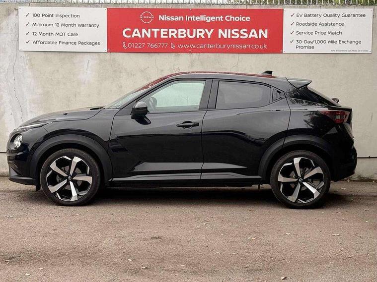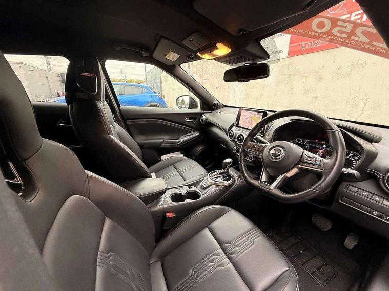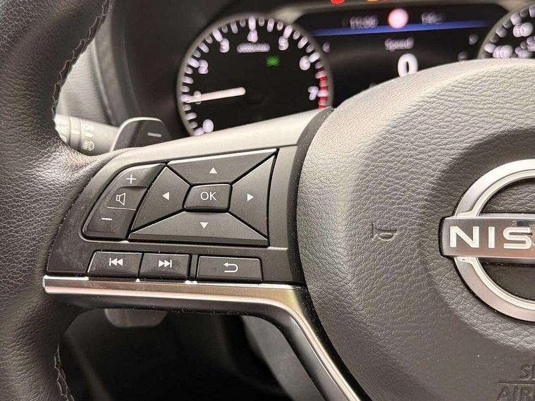 7" full colour TFT screen combimeter, Apple CarPlay and Google Android auto, Drive modes select (Eco, normal and sport), Emergency and breakdown call, Front parking sensor, Idle start/stop system, Intelligent lane intervention, Lane departure warning system, Nissan connect 8" touch screen entertainment system, Nissan connect nav with TomTom traffic, Nissan connect services and Wifi connection, Outside temperature sensor, Power Steering, Rear parking sensor, Traffic sign recognition, Trip computer, Voice recognition, Gasoline particulate filter, 10 Bose speakers 6 speakers and 2 headrest speakers for driver/passenger seats, Bluetooth system, USB, Aux-in and 12V socket, Bose personal sound stage control, DAB Digital radio, Rear console USB port, Auto dimming interior rear view mirror, Auto headlights, Automatic hazard signal with emergency stop signal, Body colour bumpers, Body colour door handles, Electrically adjustable door mirrors with integrated indicators, Follow me home headlights, Front and rear electric window with one touch driver window, Heated and auto folding door mirrors, High beam assist, LED daytime running lights, LED front fog lights, LED headlamps, LED rear fog lamp, LED rear lamps, Rain sensor windscreen wipers, Rear privacy glass, Rear side wing doors, Rear wiper, Thermaclear heated windscreen, Three blink turn signal, 3 height adjustable rear headrests, 3 seat bench in 2nd row, 60/40 split folding rear seat, Automatic climate control, Card holder on driver sunvisor, Door ambient lighting, Driver and passenger sliding and reclining seats, Driver seat back pocket, Driver side rear coat hanger, Driver/passenger sunvisors and vanity mirrors, Front and rear cabin lights, Front armrest, Front door pockets with bottle holders, Front head restraints, Front passenger isofix child seat anchorage point, Front/rear passenger grab handles, Gear console ambient circle lighting, Grey synthetic leather kneepad, Heated front seats, Height adjustable driver's seat, Height adjustable passenger seat, Internal chrome door handles, Leather gearshift knob, Leather steering wheel, Luggage board, Luggage space lighting, Monoform sporty seats, Multifunction steering wheel, Passenger seat back pocket, Rear door bottle holders, Single front passenger seat, Steering wheel mounted gearshift paddles, Synthetic leather upholstery, Telescopic steering wheel adjustment, Two cupholders in front centre console, Two rear isofix child seat anchorage points with top tether, Welcome light and console tray ambient lighting, ProPilot pack - Juke, ABS with EBD and brake assist, Active ride control, Active Trace Control, Driver and passenger airbags, Driver and passenger side airbags, Electric handbrake with auto hold function, Electronic Stability Programme (ESP), Front and rear curtain airbags, Height adjustable seatbelts, Hill start assist, Intelligent emergency braking with pedestrian and cyclist recognition, Rear door child safety locks, Seatbelt reminder for driver/front passenger and rear seats, Single tone horn, Three 3 point rear seatbelts, Traction control, Tyre pressure monitoring system, VDC Dynamic Vehicle Control, Ventilated rear brake discs, Alarm, Immobiliser, Intelligent key and start push button with walk away lock and approach unlock functions, Remote central locking,