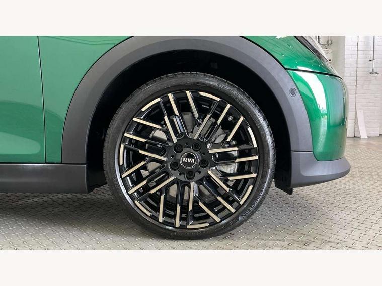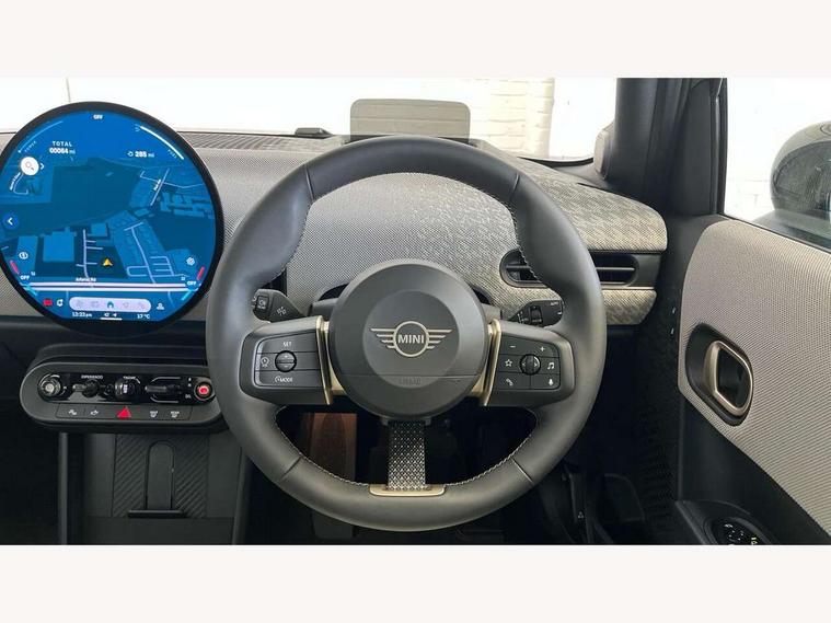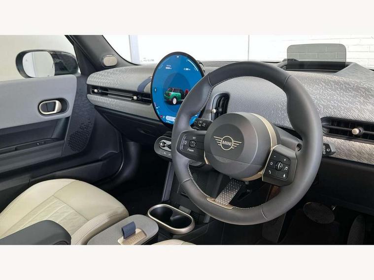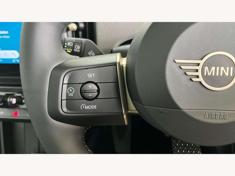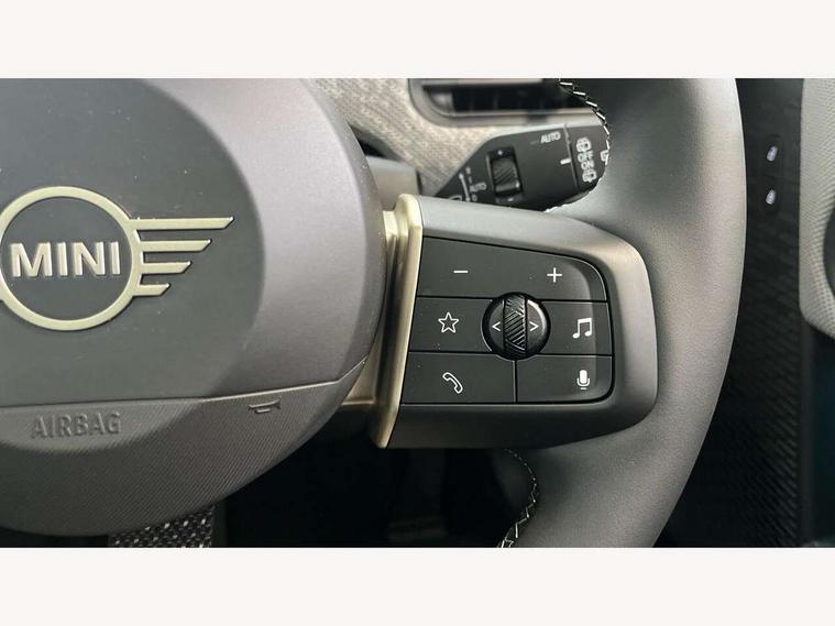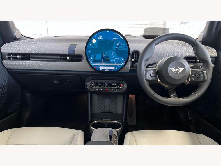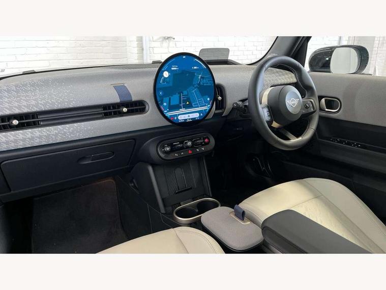 Central toggle bar, Circular OLED Screen, Compatible mobile phone bluetooth with audio streaming, Cruise control, Digital instrument cluster, Electro-mechanical speed dependant steering assistance, Emergency call service, MINI Experience Modes, Mini navigation system, On board computer, Service interval indicator, Tailgate, 7 speed steptronic transmission with double clutch, DAB Digital radio, Personal eSim, Adaptable light signatures, Auto headlights, Electric adjustable heated door mirrors, Electric front+rear windows, Heated rear window, Heated windscreen washer jets, LED 3rd brake light, LED daytime running lights, LED indicator lights, LED rear lights, Logos in Vibrant Silver, Rain sensor window wipers, Rear fog lights, Rear side wing doors, Rear window wiper, Vibrant silver grille surround, 2 zone automatic air conditioning, 3 seat bench in 2nd row, 60/40 rear seat bench, Ambient lighting, Cupholders, Dark headliner, Front and rear floor mats, Front and rear head restraints, Front compact armrest, Heated steering wheel, Height adjustable passenger seat, Lidded storage box in grey knit, Luggage compartment lighting, Single front passenger seat, Sport Vescin Steering Wheel black with vibrant silver accents, Sunvisors with vanity mirrors, Vescin synthetic leather upholstery includes dash knit in beige with grey accents, Driving assistant pack - Cooper Hatchback, Level 1 pack - Mini Hatchback, Park assistant pack - Cooper Hatchback, 3 point seatbelts on all five seats, 6 Airbags - front, side, head and seat belt tensioners, Anti-lock braking system (ABS), Child locks on rear doors, DSC - Dynamic Stability Control, Electronic parking brake, Front and rear disc brakes, Front ISOFIX (iSize), Front passenger airbag deactivation, Traction control, Tyre pressure monitoring system, Alarm, Immobiliser, Remote central locking, Blue decorative dash strap, Tyre repair kit,
