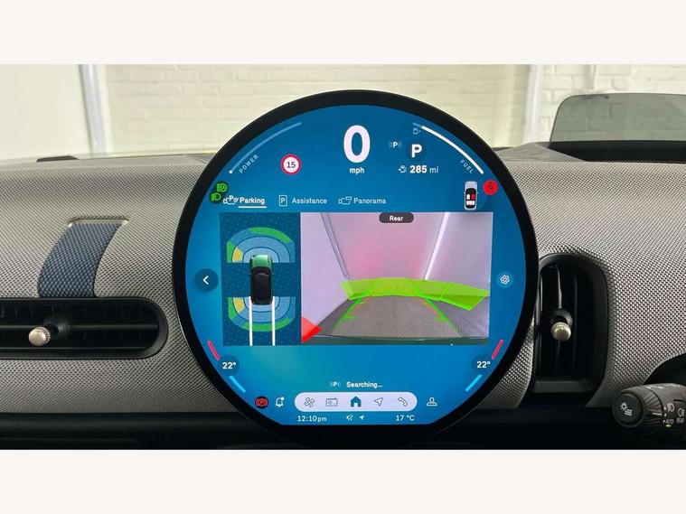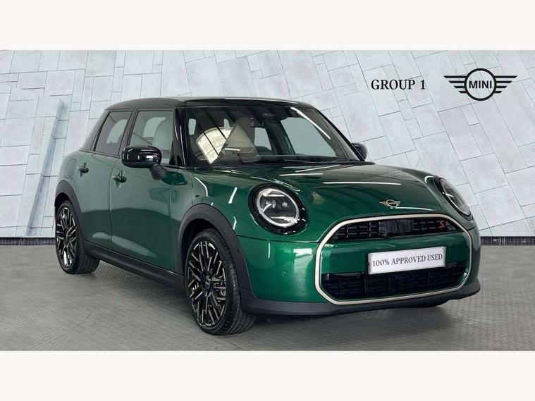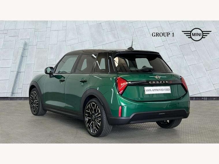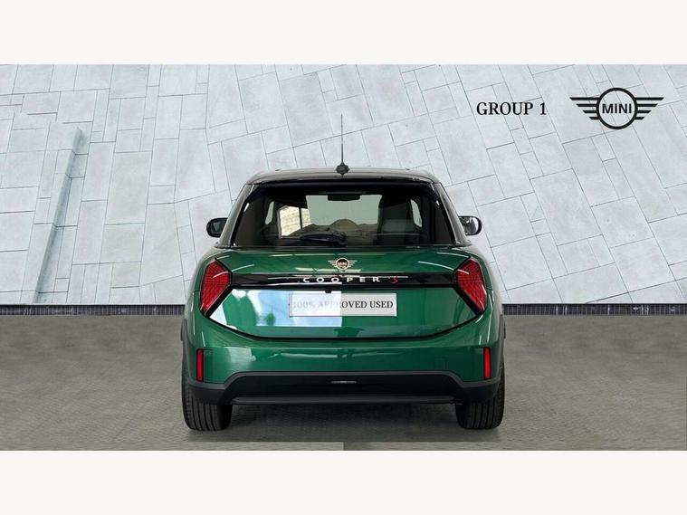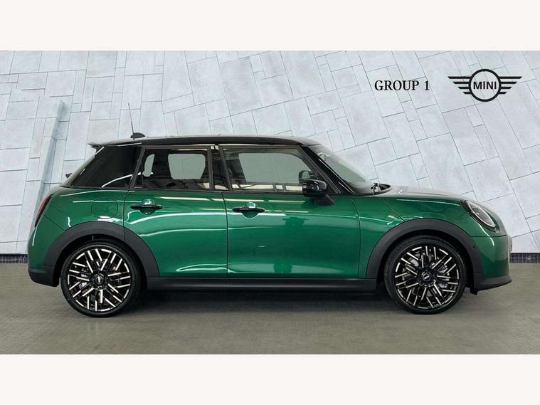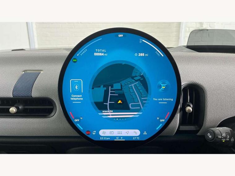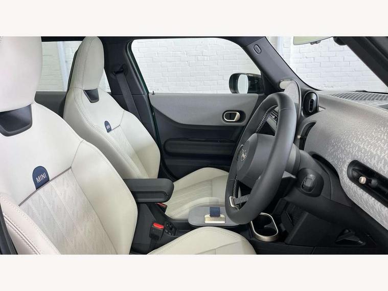 Central toggle bar, Circular OLED Screen, Compatible mobile phone bluetooth with audio streaming, Cruise control, Digital instrument cluster, Electro-mechanical speed dependant steering assistance, Emergency call service, MINI Experience Modes, Mini navigation system, On board computer, Service interval indicator, Tailgate, 7 speed steptronic transmission with double clutch, DAB Digital radio, Personal eSim, Adaptable light signatures, Auto headlights, Electric adjustable heated door mirrors, Electric front+rear windows, Heated rear window, Heated windscreen washer jets, LED 3rd brake light, LED daytime running lights, LED indicator lights, LED rear lights, Logos in Vibrant Silver, Rain sensor window wipers, Rear fog lights, Rear side wing doors, Rear window wiper, Vibrant silver grille surround, 2 zone automatic air conditioning, 3 seat bench in 2nd row, 60/40 rear seat bench, Ambient lighting, Cupholders, Dark headliner, Front and rear floor mats, Front and rear head restraints, Front compact armrest, Heated steering wheel, Height adjustable passenger seat, Lidded storage box in grey knit, Luggage compartment lighting, Single front passenger seat, Sport Vescin Steering Wheel black with vibrant silver accents, Sunvisors with vanity mirrors, Vescin synthetic leather upholstery includes dash knit in beige with grey accents, Driving assistant pack - Cooper Hatchback, Level 1 pack - Mini Hatchback, Park assistant pack - Cooper Hatchback, 3 point seatbelts on all five seats, 6 Airbags - front, side, head and seat belt tensioners, Anti-lock braking system (ABS), Child locks on rear doors, DSC - Dynamic Stability Control, Electronic parking brake, Front and rear disc brakes, Front ISOFIX (iSize), Front passenger airbag deactivation, Traction control, Tyre pressure monitoring system, Alarm, Immobiliser, Remote central locking, Blue decorative dash strap, Tyre repair kit,