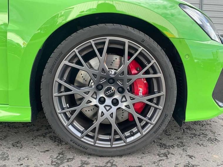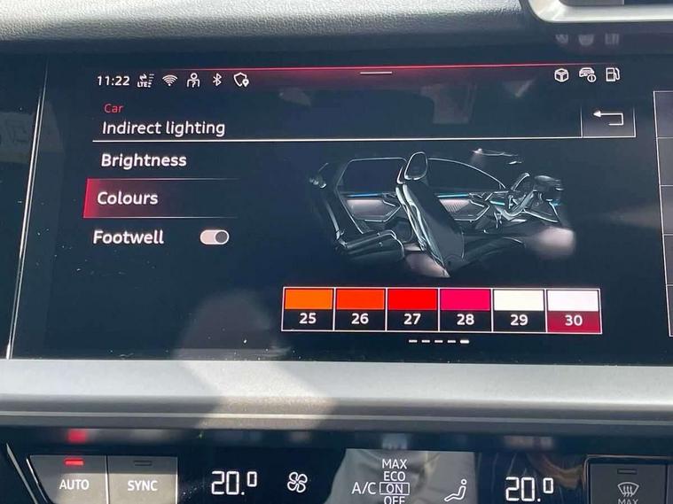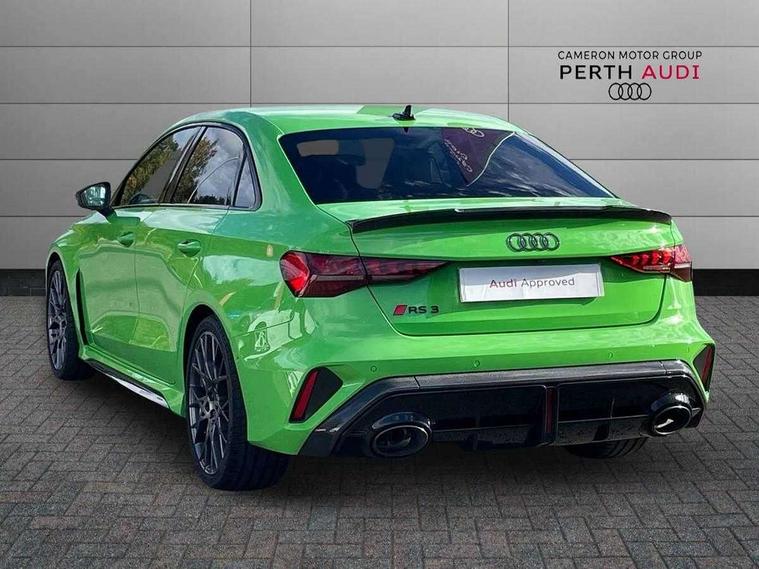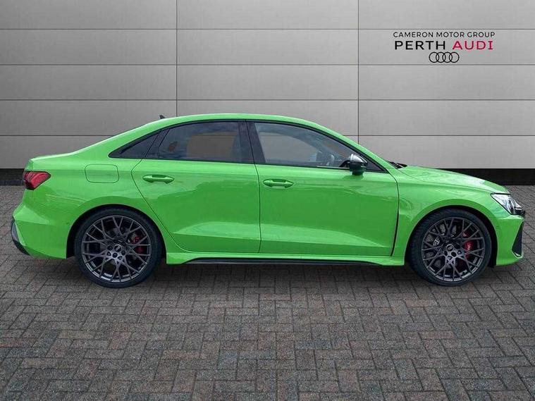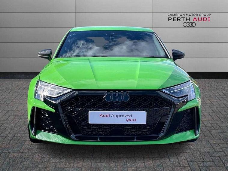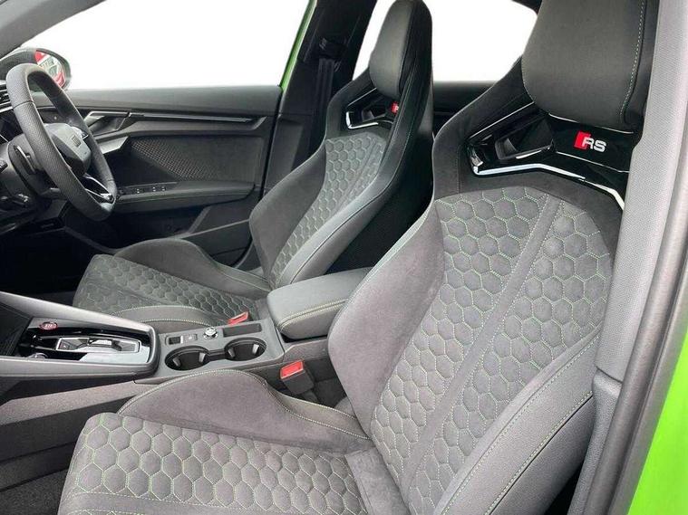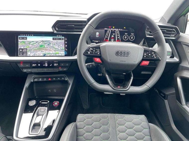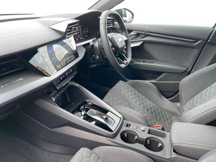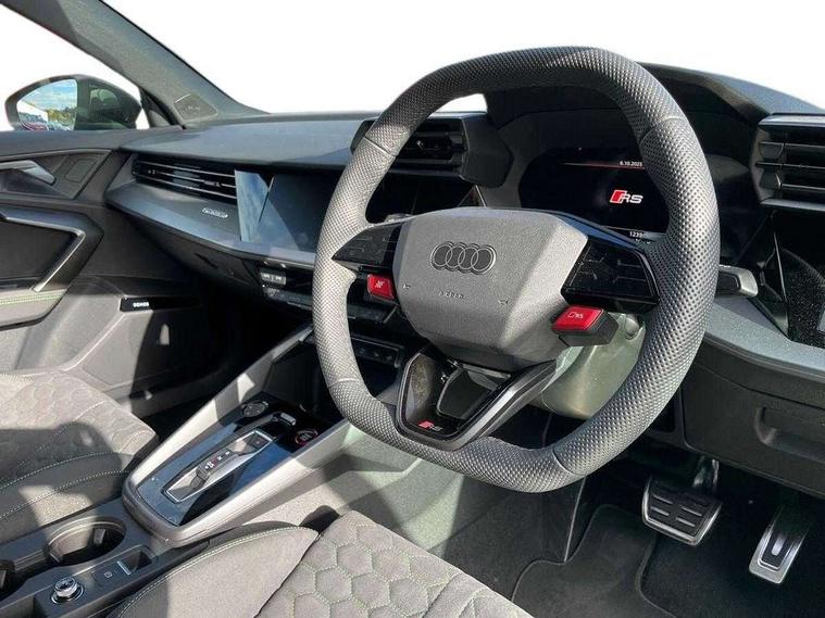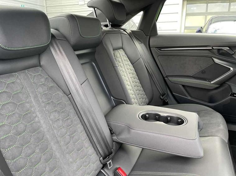 Adjustable speed limiter, Audi drive select comfort, auto, dynamic and efficiency, Audi smartphone interface with app store includes wireless Apple carplay, Android auto and Amazon alexa integration, Audi virtual cockpit plus with RS specific design and 12.3" display with additional graphic display options, Automatic start/stop system with recuperation, Bluetooth interface, Camera based traffic sign recognition, Collision avoidance assistant, Distraction and Fatigue warning, e-Call (emergency call), Lane departure warning system, MMI Navigation Plus with high resolution 10.1" colour touch screen display, Park Assist with parking system Plus, Progressive steering, RS specific driving modes - RS Individual, RS Performance and RS Torque rear, Voice control system with natural language interaction, Quattro permanent four wheel drive, Audi Phonebox light with wireless charging, DAB Digital radio, USB ports with charging function in the rear, All weather light, Audi beam LED projection of RS logo on ground as you exit, Audi darkened matrix LED headlights with dynamic light sequencing and dynamic indicator, Auto dimming frameless rear view mirror, Automatic dynamic range control, Carbon door mirror housings, Carbon fibre engine cover, Dipped beam, main beam, position light and turning light, Dynamic RS specific light sequencing of the coming home and leaving home function, Electrically adjustable/heated/folding/auto dimming door mirrors with integrated LED indications + kerb view function for passenger side, Exterior model badging, Front electric windows, Headlight cleaning system, Heat insulating glass windscreen, Intersection light, LED 3rd brake light, LED brake lights, LED rear lights with dynamic light sequencing and dynamic indicator, LED rear number plate lights, LED reverse light, LED tail lights, Light and rain sensors, Manoeuvring light, Motorway light, Privacy glass - dark tinted rear window, rear door and side windows, Rear boot, Rear electric windows, Rear side wing doors, RS dual branch exhaust system with two chrome plated oval tailpipe trims, Static Cornering lights, Tailgate spoiler in carbon, Visually upgraded RS specific daytime running light choice of 4 digital signature in chequered flag design within the headlight, 12V socket and storage compartment in front centre console, 3 seat bench in 2nd row, 3 Spoke flat top and bottomed black leather multi function steering and gear shift paddles, 3-zone deluxe automatic air conditioning, 40/20/40 split folding rear seat bench, Black cloth headlining, Black front and rear floor mats, Front and rear headrests, Front centre armrest, Front door sill trims with RS 3 logo, Front sports seats RS embossed logo, Heated front seats, Height and reach adjustable steering wheel, Manual boot compartment lid, Manually adjustable front seats, Rear centre armrest with cupholder, Seat side bolsters, Single front passenger seat, Stainless steel pedals and front footrest in black, Vanadium look - Interior door handles, Door trim, power latching, Air vents, window controls, mirror adjust, rear door lock, Selector lever in centre console, Black Styling plus package - RS3, Extended ambient lighting package Pro with Multi-coloured contour lighting of instrument panel - RS3, RS exterior features pack in carbon and gloss black - RS3, RS sport suspension pack - RS3, Storage package - RS3 Saloon, Technology package without speed limiter - RS3, 3x3 point rear seat belts, Driver and front passenger airbag with passenger airbag deactivation, Electronic Stabilisation Control (ESC) including ABS, ASR and EDL, First aid kit with warning triangle and 2 safety vests, Hill hold assist, Pre-sense front with pedestrian and cyclist detection, RS steel brakes, Seatbelt monitoring, Tyre pressure loss indicator, Anti theft alarm, Anti-theft wheel bolts, Electronically operated child locks, Immobiliser, Remote central locking with safelock, Black dashboard, Inlays in carbon atlas structure, 19" 10 cross spoke silk matt grey alloy wheels, Tyre repair kit,