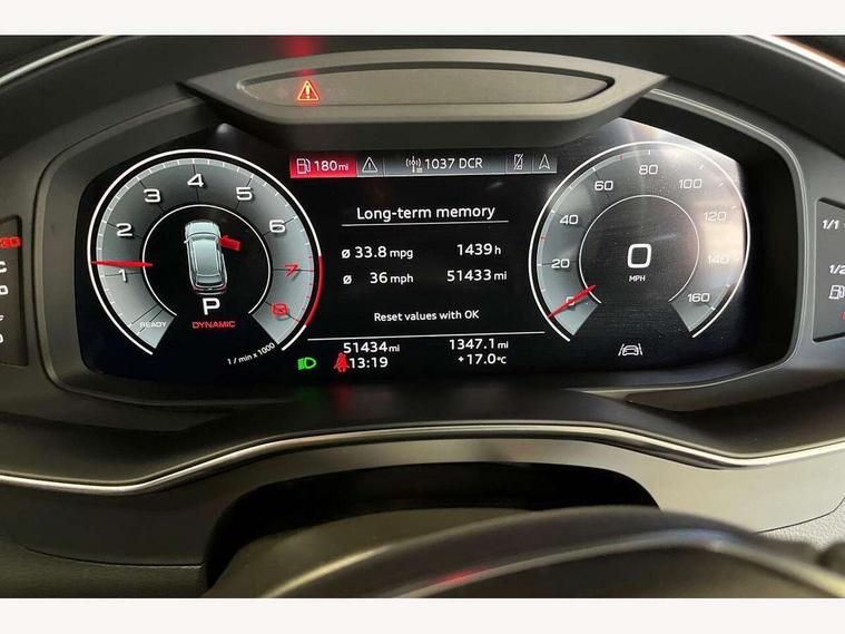 7" high resolution colour driver information display system, Audi connect safety and service (e-call), Audi drive select, Audi parking system plus - acoustic and visual park assist system for front and rear, Audi smartphone interface, Automatic start/stop system with coasting functionality, Bluetooth interface, Lane departure warning system, MMI navigation with MMI touch + twin touch screens 8.8" and 8.6" with haptic and acoustic feedback, Power operated tailgate, Progressive steering, Rear view camera, Service interval indicator, Voice control system, 12V Mild hybrid, Quattro on demand, Sports suspension, Audi music interface, Audi sound system, Auxiliary input socket, DAB Digital radio, USB connection, Aluminium roof rails, Body coloured door mirrors, Electric front/rear windows, Frameless auto dimming interior rear view mirror, Headlight washers, Heat insulating darkened glass in side and rear windows, Heat insulating glass in windshield, LED rear lights, LED signature front daytime running light, Matrix LED headlights with dynamic rear indicators, Matt black side air intake grille with inlay in matt aluminium, Privacy glass, Radiator grille in titanium black matt, single frame in chrome and horizontal struts in matt aluminium silver, Rain and light sensors, S line air inlet design with inlay in matt aluminium, S Line badge on front fender, S Line front and rear bumpers, S line rear diffuser and grille in matt black with matt aluminium tailpipes, S Line roof edge spoiler, S Line side skirts, Signature rear LED light design, 2 zone deluxe electronic climate control, 4 way electric lumbar support for driver and front passenger, 40/20/40 split folding 3 rear seat bench in 3 parts with rear centre armrest, Black cloth headlining, Electrically adjustable front seats with driver memory, Front centre armrest, Front head restraints, Heated front seats, Height/reach adjust steering wheel, Illuminated door sill trims with S logo, Illuminated sun visors with vanity mirrors, ISOFIX child seat mounting and Top Tether with front passenger airbag deactivation, Leather gear knob, Luggage compartment system, Rear headrests, S line front and rear floor mats with contrast stitching, Stainless steel pedals and foot rest, Tool kit and car jack, LED Interior Ambient Lighting Pack - A6, Non smoking pack - A6, 3 point seatbelts on all seats, Airbags - Front side, front and rear including head, Audi pre-sense front, Black seatbelts, EBD - Electronic brakeforce distribution, Electromechanical parking brake, Electronic Stability Control (ESC) including ABS, ASR and EDL, Extended pedestrian protection measures, Seatbelt monitoring, Tyre pressure warning light, Warning triangle and first aid kit, Anti theft alarm with tow away protection, Anti-theft wheel bolts and wheel loosening detection, Immobiliser, Keyless Go, Remote central locking, Matt brushed aluminium dark inlays,