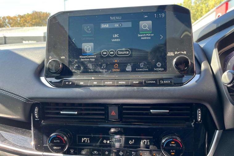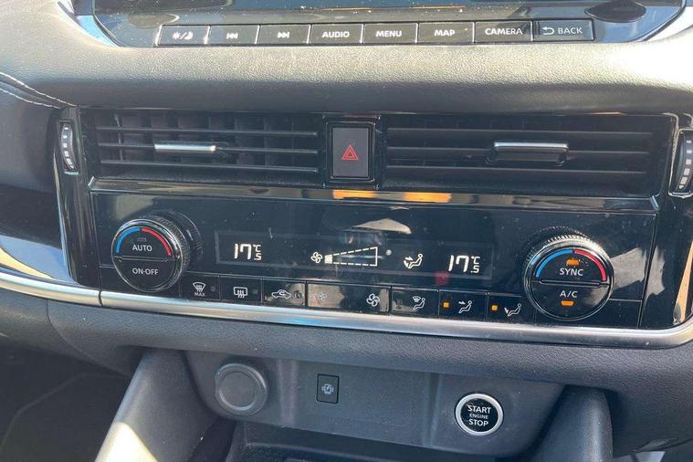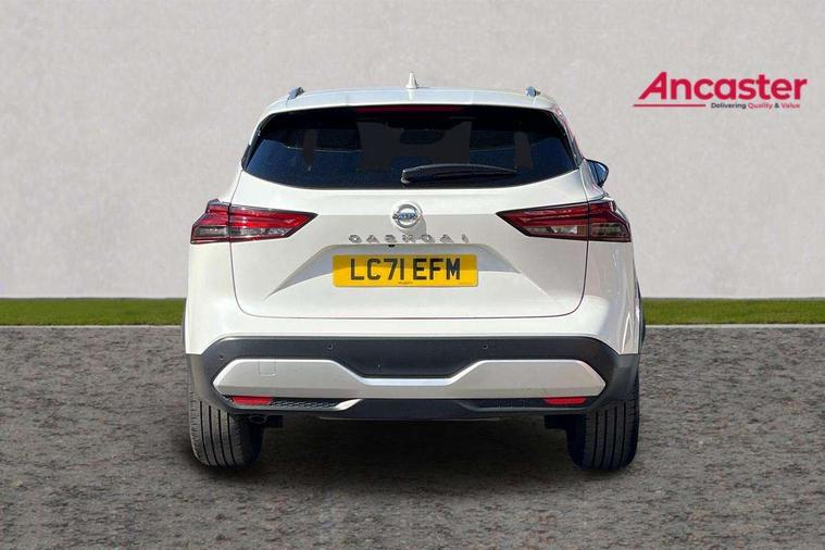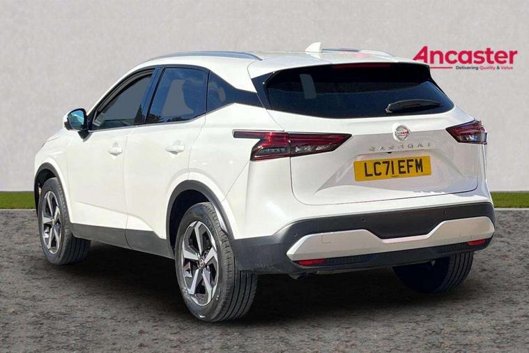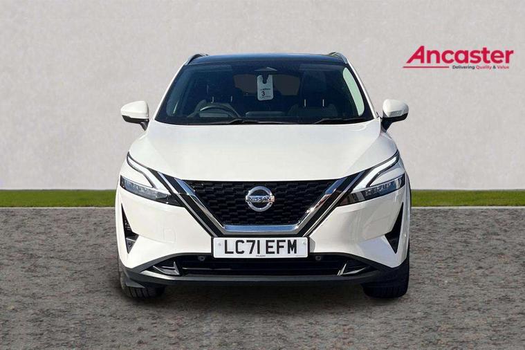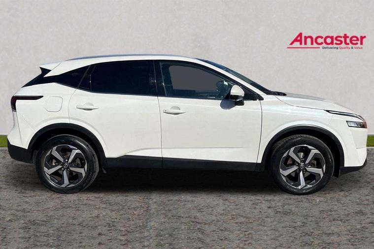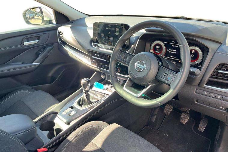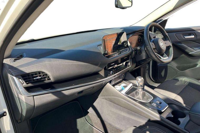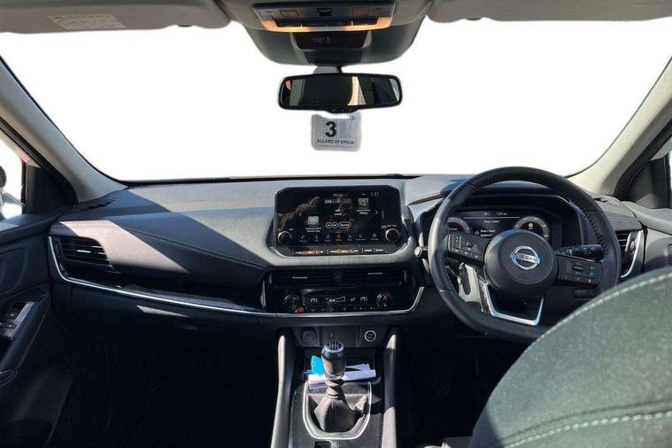 Blind spot warning, Drive modes (sport, normal, eco), Electric speed sensitive power steering, Emergency and breakdown call, Front and rear parking sensors, Full Digital 12.3" TFT Digital Combimeter, Idle stop/start system, Intelligent Cruise control (ICC), Intelligent driver alert system, Intelligent forward collision warning, Intelligent lane intervention, Lane departure prevention, Lane departure warning system, Moving object detection, Push button starter, Rear cross traffic alert, Traffic sign recognition with legal speed adjustment, Trip computer, 6 speakers, AM/FM audio system with DAB, Bluetooth audio streaming, Front USB connections (Type-A and Type-C), Rear USB charging only ports (Type-A and Type-C), 3rd brake light, Auto dimming rear view mirror, Auto rear wiper when reversing, Body colour mirror caps, Body coloured door handles, Bodyside mouldings, Chrome side window finisher, Electric auto folding door mirrors, Electrically adjustable and heated door mirrors with LED turn indicator, Fixed panoramic glass roof with electric sunshade, Follow me home headlights, High beam assist, Intelligent auto headlights, LED daytime running lights, LED rear lights, One touch front and rear electric windows with remote opening and closing, Partially body coloured bumpers, Privacy glass, Rain sensor, Rear roof spoiler, Rear side wing doors, Rear styling plate, Roof rails, Shark fin antenna, Splash free rain sensing wipers, Super UV and infrared cut glass, Three blink turn signal, 12v power socket in dashboard and luggage, 2 way electrical driver lumbar adjustment, 2x Rear coat hooks, 3 bench rear seats in 2nd row, 3 rear headrests, 4 grab handles, 6 Luggage hooks - 4 on floor, 2 on side, 60/40 split folding rear seat bench, Ambient lighting around centre console, Centre console storage tray, Chrome interior door handles, Cloth monoform upholstery, Driver and front passenger sunvisors with illuminated vanity mirrors, Driver seat back pocket, Dual zone automatic climate control with pollen filter, Front centre console and armrest, Front cupholder, Front door with bottle holders, Glovebox with light, Hard trunk cover, Height adjustable driver's seat, Height adjustable front headrests, Leather shift knob, Leather steering wheel, Luggage board system, Luggage space lighting, Manually adjustable passenger (slide recline + lifter), Multifunction steering wheel, Passenger seat back pocket, Rear armrest with 2 cupholders, Rear door bottle holders, Single front passenger seat, Soft PVC kneepad, Steering wheel switches, Tilt/telescopic adjustable steering wheel, Two rear isofix child seat anchorage points with top tether, Welcome light and console tray ambient lighting, Connectivity Pack - Qashqai, Tech Pack (Drive Assist + HUD), 3x3 point rear seatbelt pretensioners + load limiters, ABS, ESP, EBD and brake assist, Active brake limited slip, Auto hold function, Child locks on rear doors, Curtain and front side, far side airbags, Driver and passenger airbags, Driver, passenger and 2nd row rear seat belt reminder, Electronic parking brake, Front seatbelt pretensioners + load limiters, Height adjustable front seatbelts, Hill start assist, Intelligent blind spot intervention, Intelligent front emergency braking with pedestrian, cyclist recognition and junction assist, Intelligent rear automatic braking, Tyre pressure monitoring system, Vehicle dynamic control, Capless fuel filler, Engine immobiliser, Nissan i-key, Remote central door locking with deadlocking, Thatcham Cat.1 alarm, 18" Diamond cut alloy wheels,