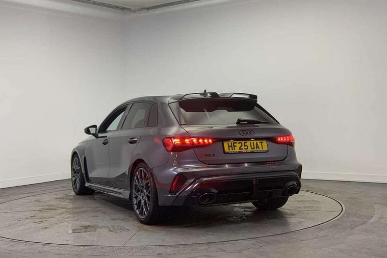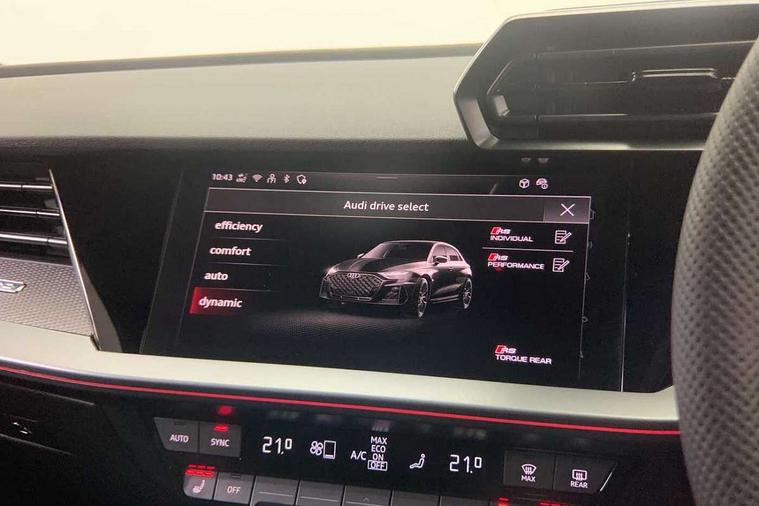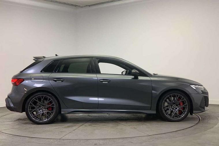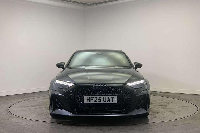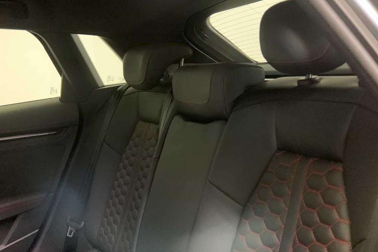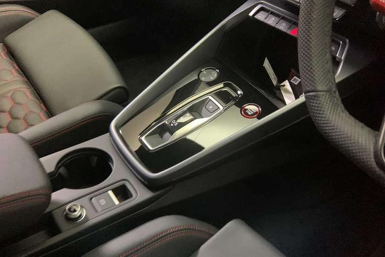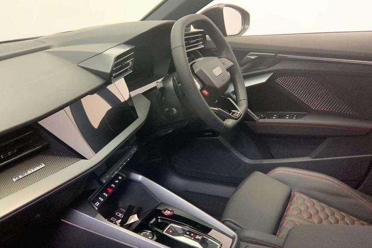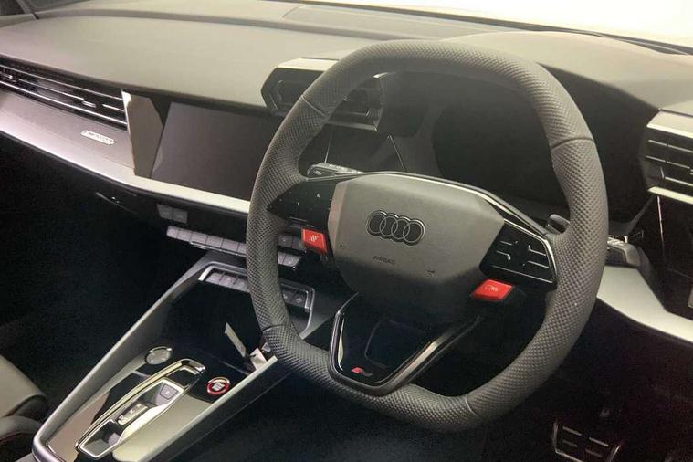 Adjustable speed limiter, Audi drive select comfort, auto, dynamic and efficiency, Audi smartphone interface with app store includes wireless Apple carplay, Android auto and Amazon alexa integration, Audi virtual cockpit plus with RS specific design and 12.3" display with additional graphic display options, Automatic start/stop system with recuperation, Bluetooth interface, Camera based traffic sign recognition, Collision avoidance assistant, Distraction and Fatigue warning, e-Call (emergency call), Lane departure warning system, MMI Navigation Plus with high resolution 10.1" colour touch screen display, Park Assist with parking system Plus, Progressive steering, RS specific driving modes - RS Individual, RS Performance and RS Torque rear, Voice control system with natural language interaction, Quattro permanent four wheel drive, Audi Phonebox light with wireless charging, DAB Digital radio, USB ports with charging function in the rear, All weather light, Audi beam LED projection of RS logo on ground as you exit, Audi darkened matrix LED headlights with dynamic light sequencing and dynamic indicator, Auto dimming frameless rear view mirror, Automatic dynamic range control, Carbon door mirror housings, Carbon fibre engine cover, Dipped beam, main beam, position light and turning light, Dynamic RS specific light sequencing of the coming home and leaving home function, Electrically adjustable/heated/folding/auto dimming door mirrors with integrated LED indications + kerb view function for passenger side, Exterior model badging, Front electric windows, Headlight cleaning system, Heat insulating glass windscreen, Intersection light, LED 3rd brake light, LED brake lights, LED daytime running x3, LED rear lights with dynamic light sequencing and dynamic indicator, LED rear number plate lights, LED reverse light, LED tail lights, Light and rain sensors, Manoeuvring light, Motorway light, Privacy glass - dark tinted rear window, rear door and side windows, Rear electric windows, Rear side wing doors, Rear wiper, Roof edge spoiler in carbon, RS dual branch exhaust system with two chrome plated oval tailpipe trims, Static Cornering lights, Visually upgraded RS specific daytime running light choice of 4 digital signature in chequered flag design within the headlight, 12V socket and storage compartment in front centre console, 3 seat bench in 2nd row, 3 Spoke flat top and bottomed black leather multi function steering and gear shift paddles, 3-zone deluxe automatic air conditioning, 40/20/40 split folding rear seat bench, Black cloth headlining, Front and rear headrests, Front centre armrest, Front door sill trims with RS 3 logo, Front sports seats RS embossed logo, Front/rear floor mats, Heated front seats, Height and reach adjustable steering wheel, Manual boot compartment lid, Manually adjustable front seats, Rear centre armrest with cupholder, Seat side bolsters, Single front passenger seat, Stainless steel pedals and front footrest in black, Vanadium look - Interior door handles, Door trim, power latching, Air vents, window controls, mirror adjust, rear door lock, Selector lever in centre console, Black Styling plus package - RS3, Extended ambient lighting package Pro with Multi-coloured contour lighting of instrument panel - RS3, RS exterior features pack in carbon and gloss black - RS3, RS sport suspension pack - RS3, Storage package - RS3 Sportback, Technology package without speed limiter - RS3, 3x3 point rear seat belts, Driver and front passenger airbag with passenger airbag deactivation, Electronic Stabilisation Control (ESC) including ABS, ASR and EDL, First aid kit with warning triangle and 2 safety vests, Hill hold assist, Pre-sense front with pedestrian and cyclist detection, RS steel brakes, Seatbelt monitoring, Tyre pressure loss indicator, Anti theft alarm, Anti-theft wheel bolts, Electronically operated child locks, Remote central locking with safelock, Inlays in carbon atlas structure, 19" 10 cross spoke silk matt grey alloy wheels, Tyre repair kit,