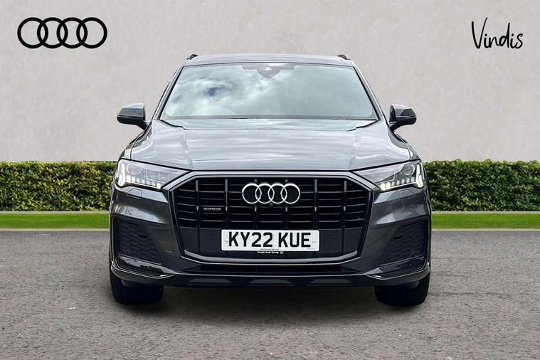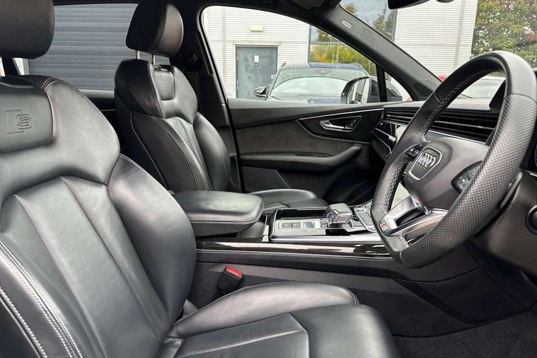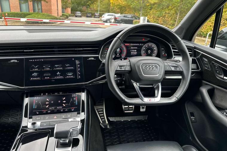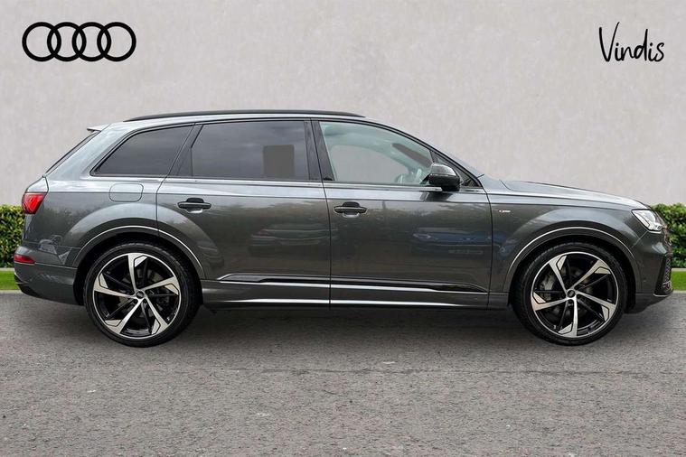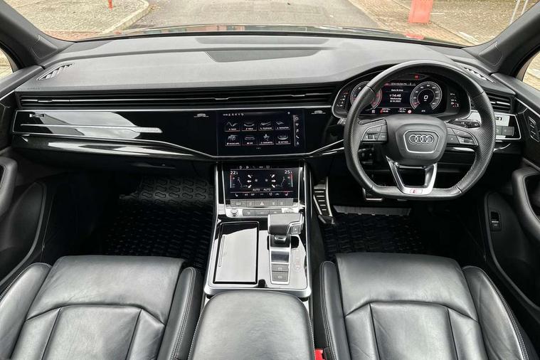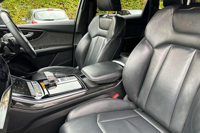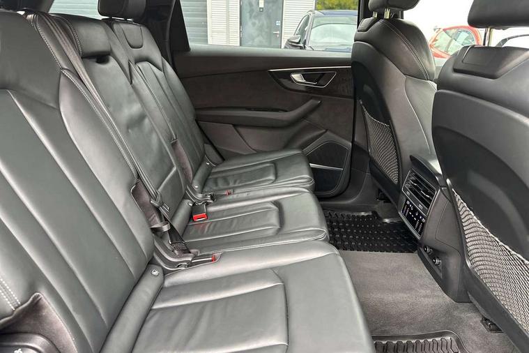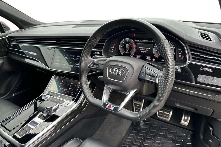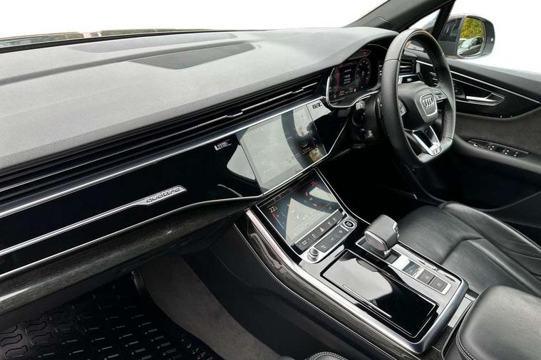 Audi connect safety and service (e-call), Audi connect with Amazon Alexa Integration, Audi drive select (Auto, Comfort, Dynamic, Efficiency, Individual, Off-road and All road), Audi smartphone interface includes wireless Apple carplay/Android Auto, Bluetooth interface, Camera based traffic sign recognition, Electromechanical steering, MMI navigation plus with MMI touch screens includes 10.1" and 8.6" screens with haptic feedback, Natural voice recognition, Parking system plus with 360 degree display (front, rear and side sensors) - acoustic and visual park assist system, Power operated tailgate, Rear view camera, Start/stop system, 48V Mild hybrid technology, Adaptive air sports suspension, Quattro all wheel drive with self locking centre differential, Audi music interface - front 2 USB-C ports with charger and data functions, Audi sound system with 6 channel amplifier, 180 watt amplifying capacity and 10 loudspeakers including subwoofer, DAB digital radio module, 3rd brake light, Auto dimming frameless rear view mirror, Black roof rails, Bumpers in contrast paint scandium grey finish includes door trim and wheel arch trim strips, inlays in door strip contain quattro embossing, Electrically adj heated/folding + automatically dimming exterior mirrors with memory + automatic kerb side function for passenger side exterior mirror, Heat insulating glass in windshield, Integrated LED indications in door mirrors, LED daytime running lights, LED headlights and high beam assist, LED rear tail lights, Privacy glass - dark tinted rear and rear side windows from B-pillar backwards, Rear side wing doors, Rear wiper, 2 seat bench in 3rd row, 3 seat bench in 2nd row, 4 zone deluxe automatic climate control, 7 seat layout with ISOFIX points for the front passenger seat and rear passenger seat, Black cloth headlining, Comfort front centre armrest, Electric adjustable front seat with 4 way lumbar support, driver memory functionality, Folding rear seats, Front head restraints, Front/rear floor mats, Heated front seats, Illuminated door sill trims with S logo, LED interior ambient lighting, Luggage compartment cover, Luggage compartment sill protection in stainless steel, Rear head restraints, Single front passenger seat, Stainless steel pedals, Sunvisors with illuminated vanity mirrors, Tool kit, Titanium black styling pack - Q7/SQ7, 3 point seatbelts on all rear seats, Audi pre sense front, Child locks on rear doors, Driver and front passenger, front side and curtain airbags, Electromechanical parking brake, Electronic Stabilisation Control (ESC) including ABS, ASR and EDL, Extended pedestrian protection measures, Hill hold assist, Seatbelt monitoring, Tyre pressure loss indicator, Warning triangle and first aid kit, Anti theft alarm, Anti-theft wheel bolts and wheel loosening detection, Keyless Go, Remote central locking, Polished oak trim with grey finished, Tyre repair kit,