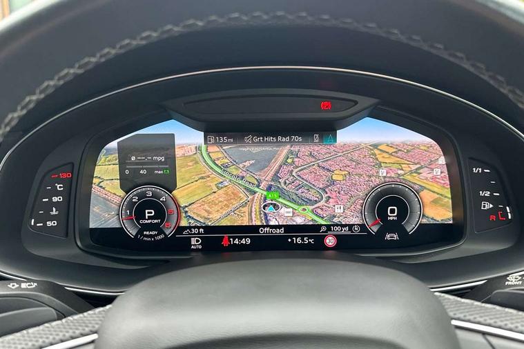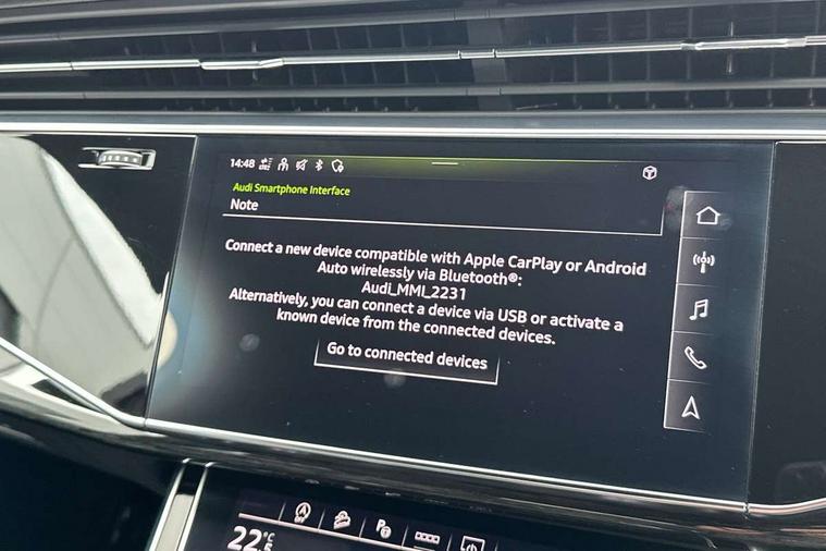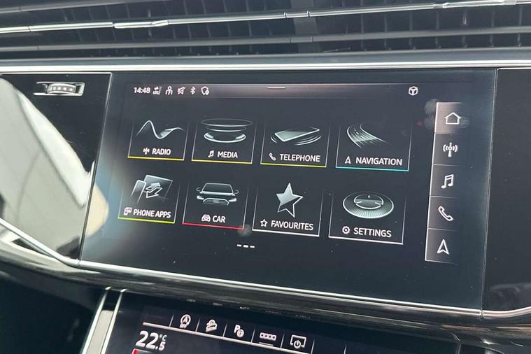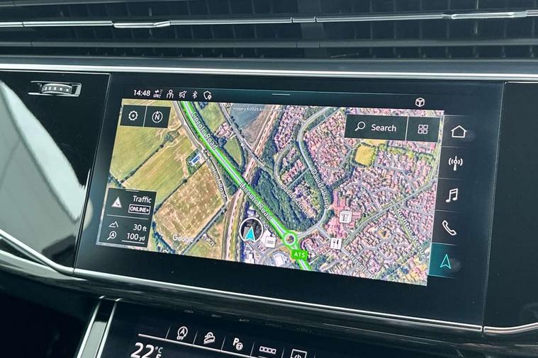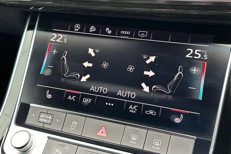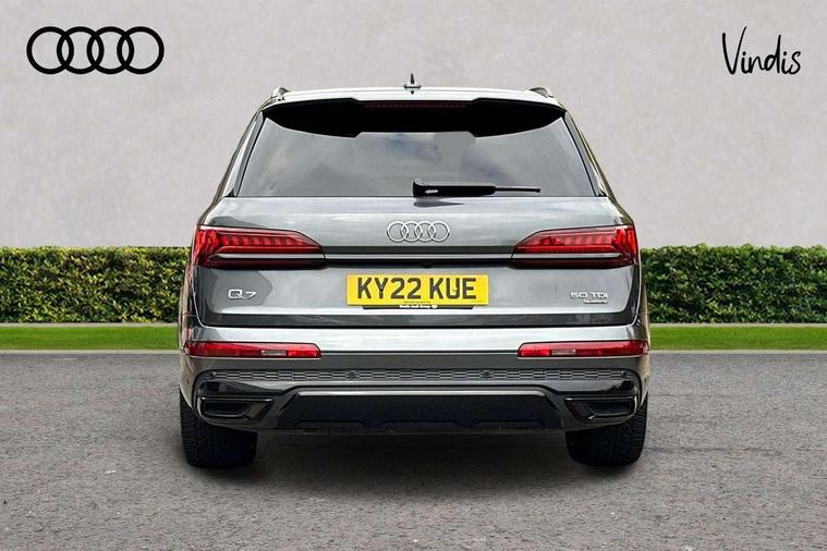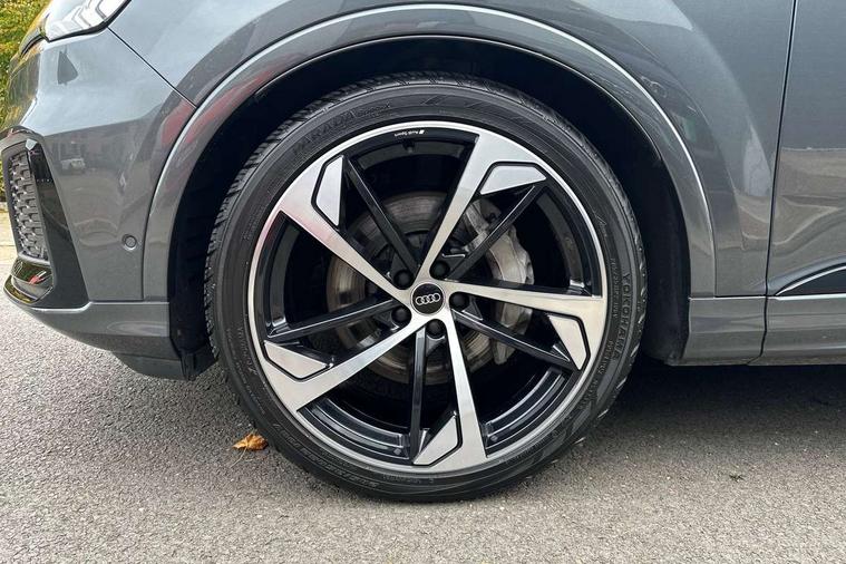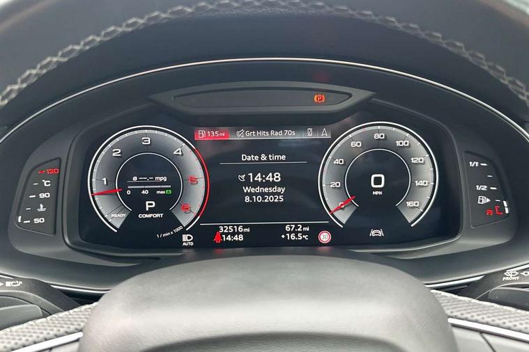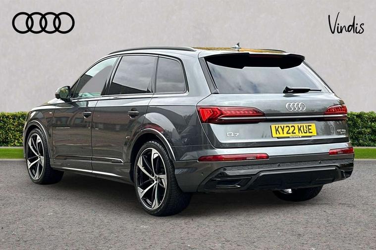 Audi connect safety and service (e-call), Audi connect with Amazon Alexa Integration, Audi drive select (Auto, Comfort, Dynamic, Efficiency, Individual, Off-road and All road), Audi smartphone interface includes wireless Apple carplay/Android Auto, Bluetooth interface, Camera based traffic sign recognition, Electromechanical steering, MMI navigation plus with MMI touch screens includes 10.1" and 8.6" screens with haptic feedback, Natural voice recognition, Parking system plus with 360 degree display (front, rear and side sensors) - acoustic and visual park assist system, Power operated tailgate, Rear view camera, Start/stop system, 48V Mild hybrid technology, Adaptive air sports suspension, Quattro all wheel drive with self locking centre differential, Audi music interface - front 2 USB-C ports with charger and data functions, Audi sound system with 6 channel amplifier, 180 watt amplifying capacity and 10 loudspeakers including subwoofer, DAB digital radio module, 3rd brake light, Auto dimming frameless rear view mirror, Black roof rails, Bumpers in contrast paint scandium grey finish includes door trim and wheel arch trim strips, inlays in door strip contain quattro embossing, Electrically adj heated/folding + automatically dimming exterior mirrors with memory + automatic kerb side function for passenger side exterior mirror, Heat insulating glass in windshield, Integrated LED indications in door mirrors, LED daytime running lights, LED headlights and high beam assist, LED rear tail lights, Privacy glass - dark tinted rear and rear side windows from B-pillar backwards, Rear side wing doors, Rear wiper, 2 seat bench in 3rd row, 3 seat bench in 2nd row, 4 zone deluxe automatic climate control, 7 seat layout with ISOFIX points for the front passenger seat and rear passenger seat, Black cloth headlining, Comfort front centre armrest, Electric adjustable front seat with 4 way lumbar support, driver memory functionality, Folding rear seats, Front head restraints, Front/rear floor mats, Heated front seats, Illuminated door sill trims with S logo, LED interior ambient lighting, Luggage compartment cover, Luggage compartment sill protection in stainless steel, Rear head restraints, Single front passenger seat, Stainless steel pedals, Sunvisors with illuminated vanity mirrors, Tool kit, Titanium black styling pack - Q7/SQ7, 3 point seatbelts on all rear seats, Audi pre sense front, Child locks on rear doors, Driver and front passenger, front side and curtain airbags, Electromechanical parking brake, Electronic Stabilisation Control (ESC) including ABS, ASR and EDL, Extended pedestrian protection measures, Hill hold assist, Seatbelt monitoring, Tyre pressure loss indicator, Warning triangle and first aid kit, Anti theft alarm, Anti-theft wheel bolts and wheel loosening detection, Keyless Go, Remote central locking, Polished oak trim with grey finished, Tyre repair kit,