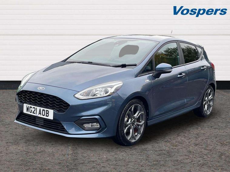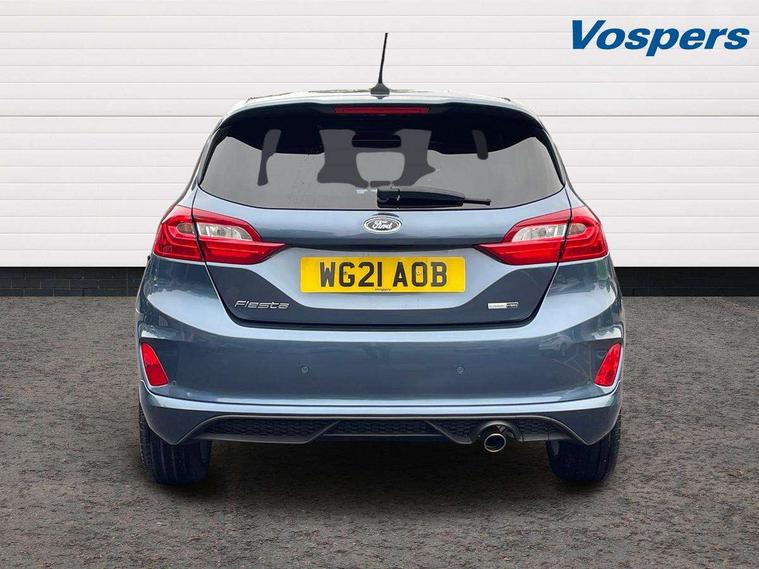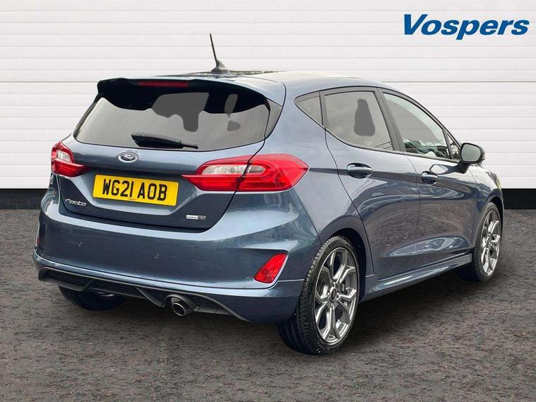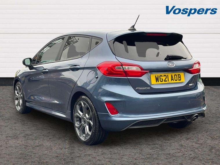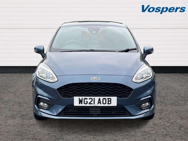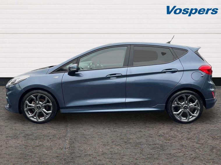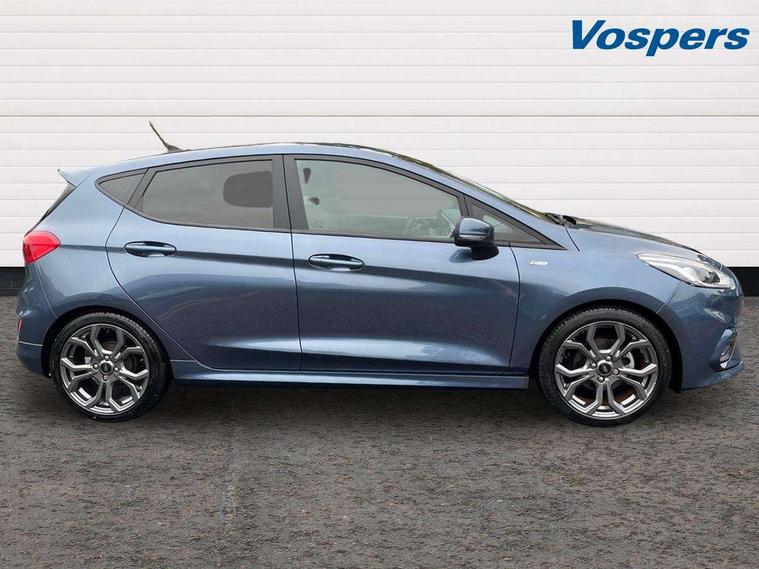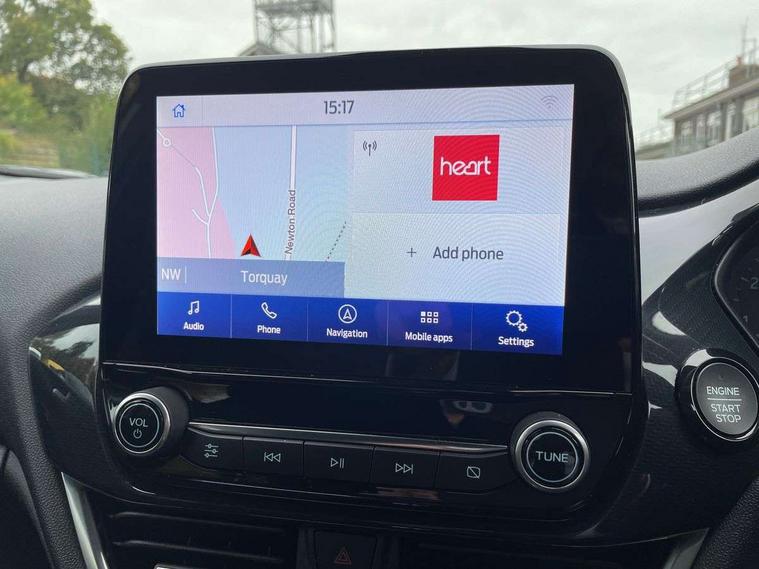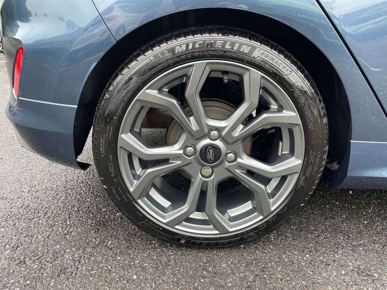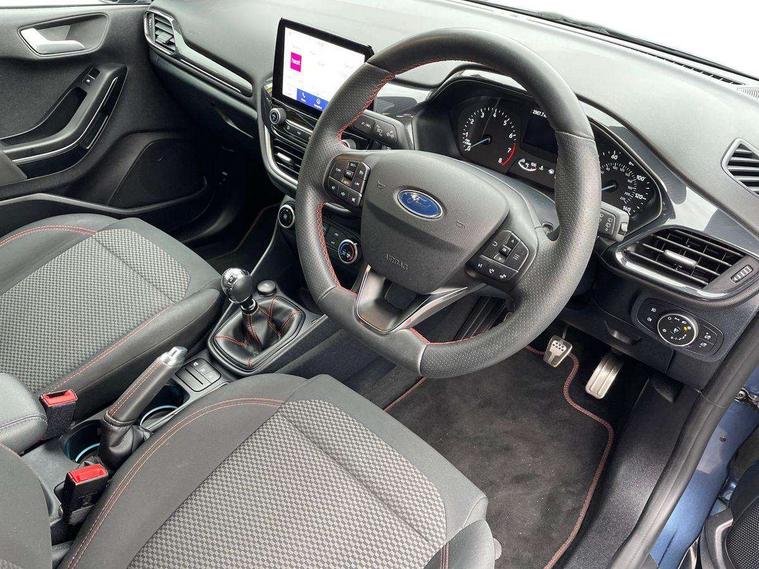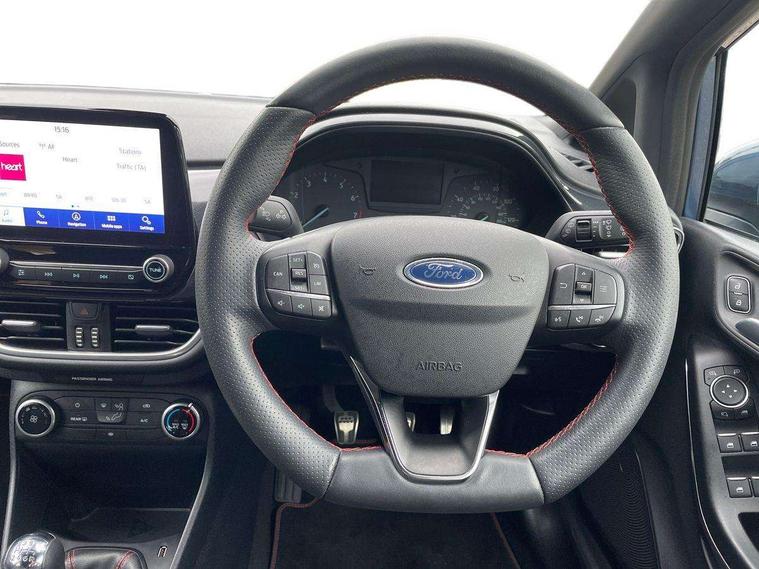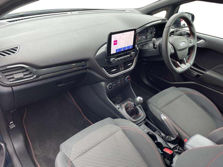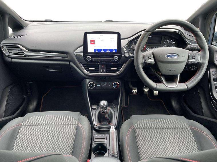 Bluetooth system, Electric power steering, Ford easy fuel, Ford SYNC 3 Navigation system incl 8" touchscreen, 7 speakers, FordPass connect, Apple carplay, android auto, voice control and emergency assistance, Rear parking distance sensors, Selectable drive modes (Normal, Sport, Track), Trip computer, Sports suspension, 2 USB ports, Auxiliary input socket, DAB Digital radio, Steering wheel mounted controls, Body colour bumpers, Body colour door handles, Body colour large rear spoiler, Body coloured electrically operated and heated door mirrors with side indicators, Cornering front fog lights, Electric front windows/one touch facility, Electric rear windows, LED Night signature to rear lights, Quickclear heated windscreen, Rain sensing wipers and auto dimming rear view mirror, Rear privacy glass, Rear wiper, Unique ST-Line upper grille & full bodystyling kit with ST-Line wing badges, 3 spoke flat bottomed leather steering wheel, 60/40 split folding rear seat, Adjustable head restraints, Black headlining, Boot carpet, Centre console with opening armrest, 2x cupholders, 12v and USB, Chrome inner door handles, Cloth upholstery, Footwell illumination, Front floor mats in velour, Front map reading lights, Front seat and rear pockets, Illuminated glovebox, Leather gaiter, Load area light, Manual 2 way passenger seat adjust, Manual 4-way driver seat adjust, Manual air conditioning, Overhead console with sunglasses holder, Pollen filter, Rake/reach adjustable steering wheel, Sensico wrapped steering wheel, Sports front seats, NCAP Pack - Fiesta, 3 point seatbelts on all rear seats, ABS+EBA, Curtain airbags, Driver and passenger airbags, Drivers knee airbag, Electronic stability control with hill start assist, Front passenger airbag deactivation, Front side airbags, Seatbelt warning, Two tone horn, Tyre pressure monitoring system, Keyless start with 'Ford Power' starter button, MyKey system, Remote central locking & engine immobiliser, Thatcham Cat.1 alarm, 17" 5 spoke alloy wheels with rock metallic finish,