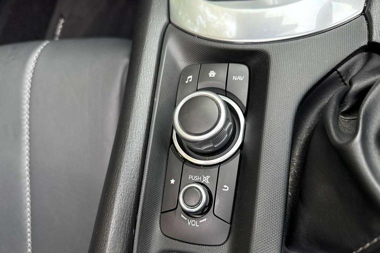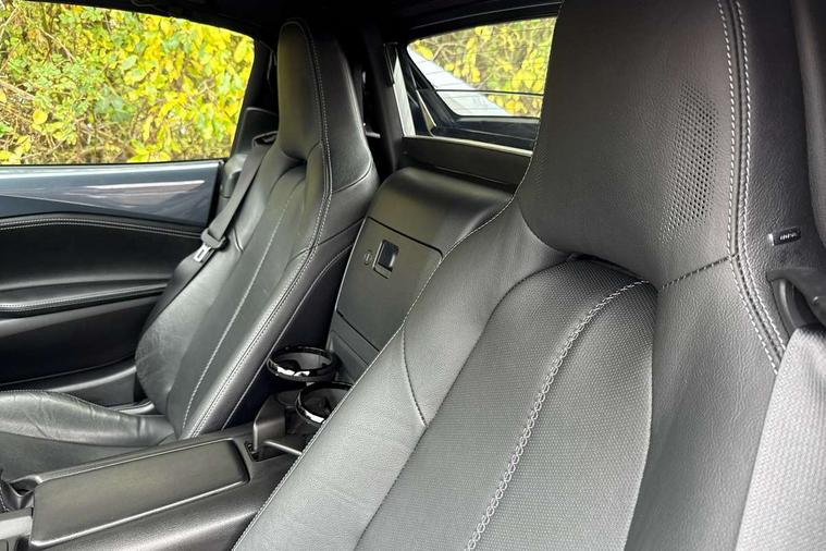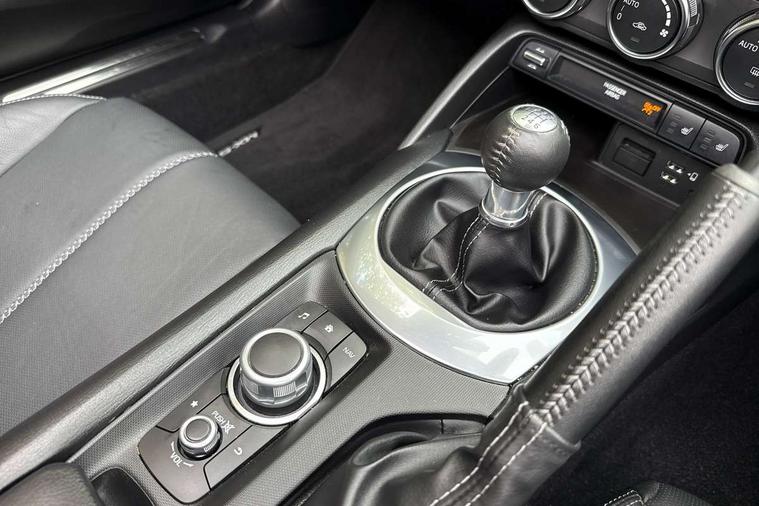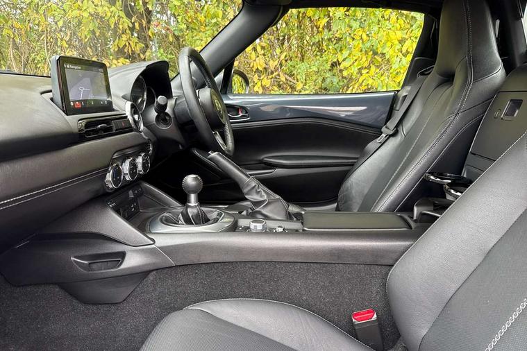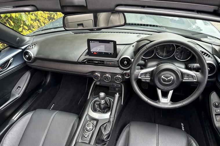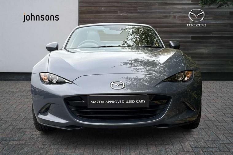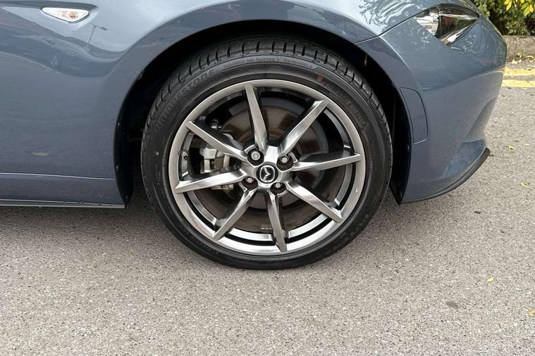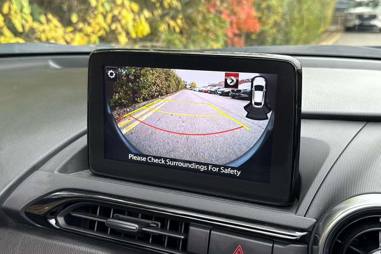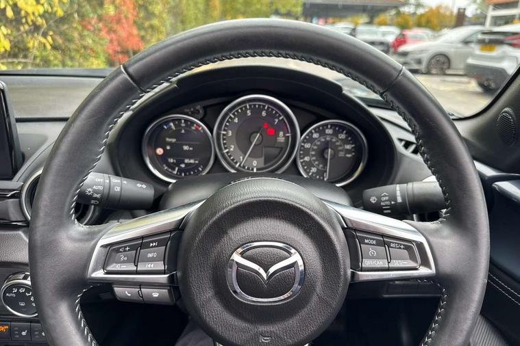 7" colour touch screen with Mazda connect infotainment, Aha and stitcher app, Analogue speedometer, Apple car play/Android Auto, Blind spot monitoring with rear cross traffic alert, Cruise control + speed limiter, Driver alert system, eCall emergency call system, Emergency stop signalling system, Engine start/stop button, Hands free phone preparation, Integrated bluetooth with hands-free calling, bluetooth audio and easy access to phone contacts, Integrated navigation system, Lane departure warning system, Multi dot display tachometer and electric odometer, PAS, Rear parking sensor, Reversing camera, Service indicator, Traffic sign recognition, Trip computer, Water temperature gauge, I-ELOOP, i-stop, Limited slip differential, Sports suspension featuring Bilstein dampers, 2 USB/aux input socket, Multimedia Commander including separate volume dial, Premium Bose sound system with 9 speakers with 2 in each front headrest, AM/FM/DAB radio and MP3, Steering wheel mounted audio/bluetooth controls, Adaptive LED Headlights, Auto dimming rear view mirror, Automatic headlamp levelling, Black scuff plates with stainless steel insert, Body colour bumpers, Body colour co ordinated interior upper door trim, Body coloured electric/heated door mirrors, Coming/leaving home lighting function, Dual exhaust pipes, Dusk sensitive headlamps, Electric front windows/one touch facility, Electrically operated body colour retractable hard top with heated rear glass window, High mounted rear brake light with Black coloured cover, LED 3rd brake light, LED daytime running lights, LED indicator lights, LED rear lights, Piano Black fashion bars, Rain sensing front wipers, Rear boot, 12V socket, Centre console storage box, Chrome Air conditioning dials, Climate control air conditioning, Coin Box, Driver and front passenger sunvisors with covered vanity mirror and driver ticket holder, Driver seat manual slide, recline and tilt adjustment, Front centre armrest, Front head restraints, Gear shift indicator, Heated front seats, in 3 heat levels, Interior courtesy light, ISOFIX front passenger seat child seat compliance, Leather gear knob, Leather handbrake lever, Leather steering wheel, Lockable rear centre box with lid, Passenger seat + manual slide/recline adjust, Perforated leather upholstery, Side door trim in black vinyl with silver stitching, Single front passenger seat, Sports seats, Strut brace, Tilt/telescopic steering column, Transparent windblocker, Two cupholders, 3 point ELR front seatbelts with pretensioners, ABS+Electronic Brake force Distribution, Deployable Hood System (DHS), Driver and front passenger airbags, Driver and passenger seatbelt reminder audible warning, Front dynamic yaw stability control, Hill hold assist, Passenger airbag deactivate switch, SCBS - Smart City Brake Support, rear plus front with autonomous emergency braking, Side airbags, Traction control, Tyre pressure monitor, Remote central locking with deadlocking and remote boot release, Smart keyless entry, Superlocking, Thatcham category 1 alarm + immobiliser, Chrome air vent surrounds, Chrome meter rings, Dashboard panel - vinyl leather Black, 17" Bright Silver alloy wheels, Tyre puncture repair kit,