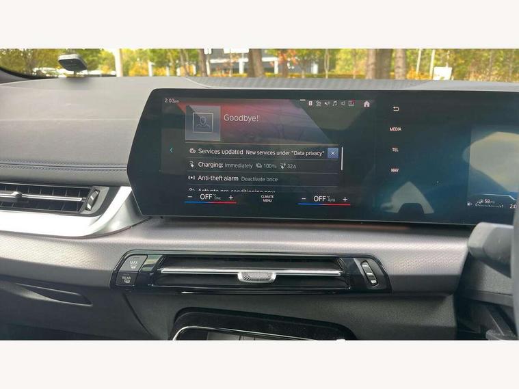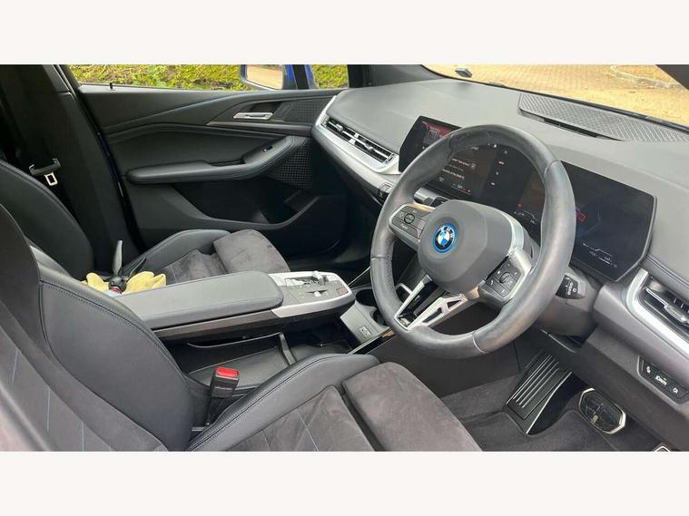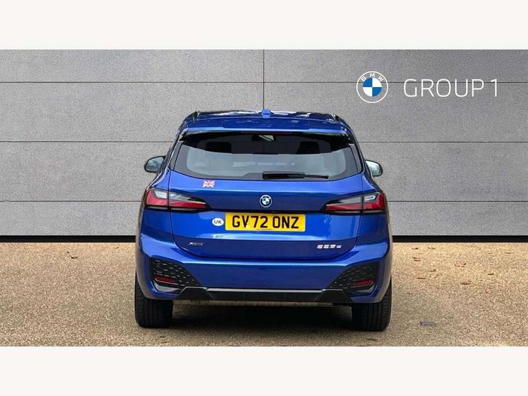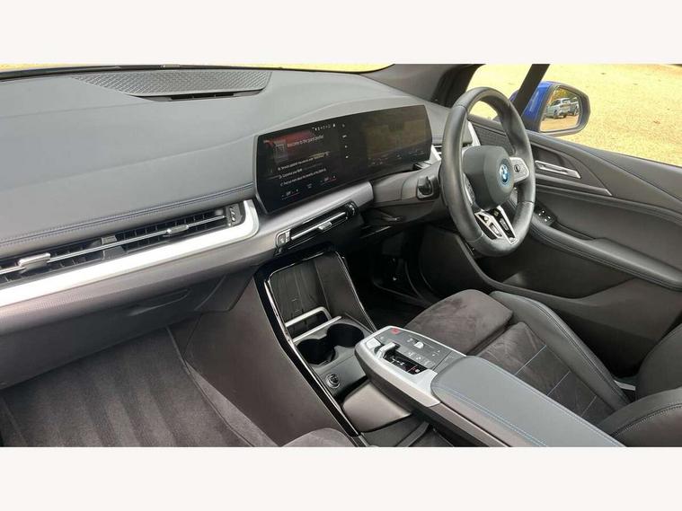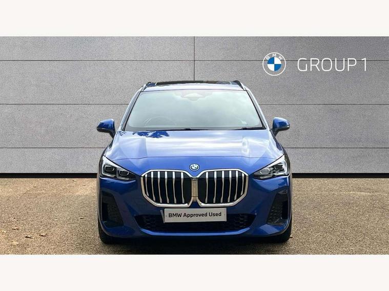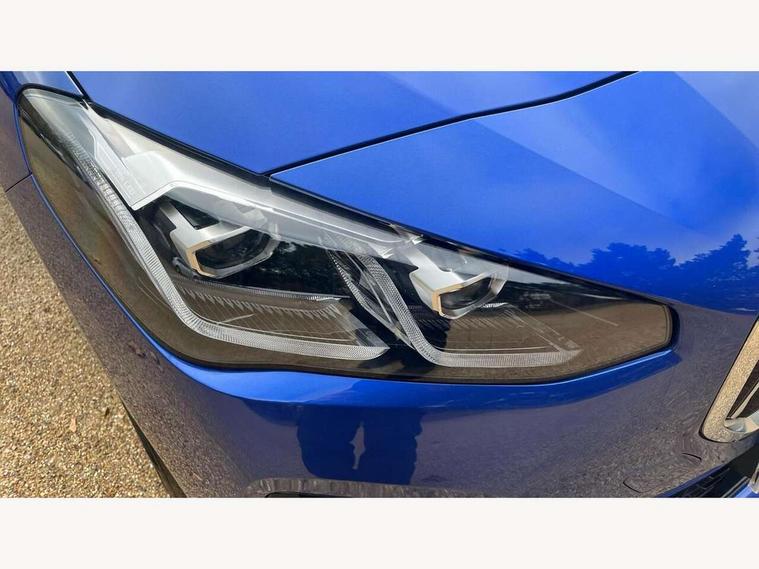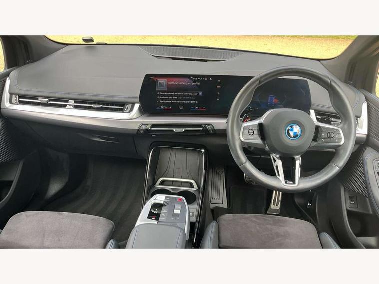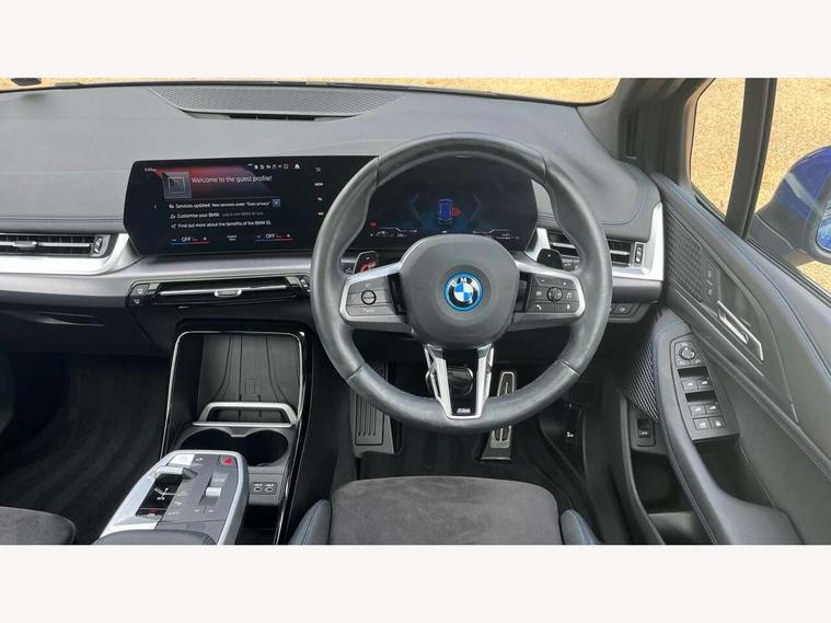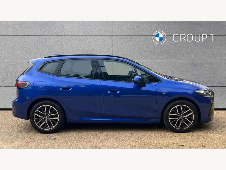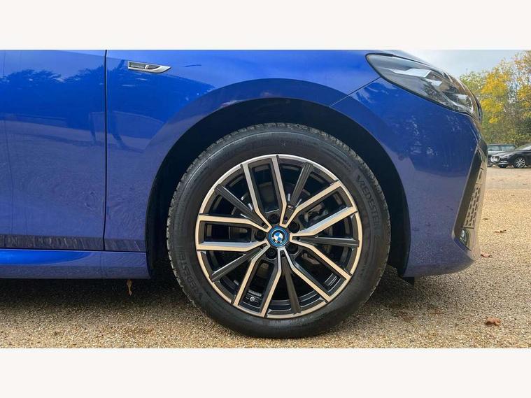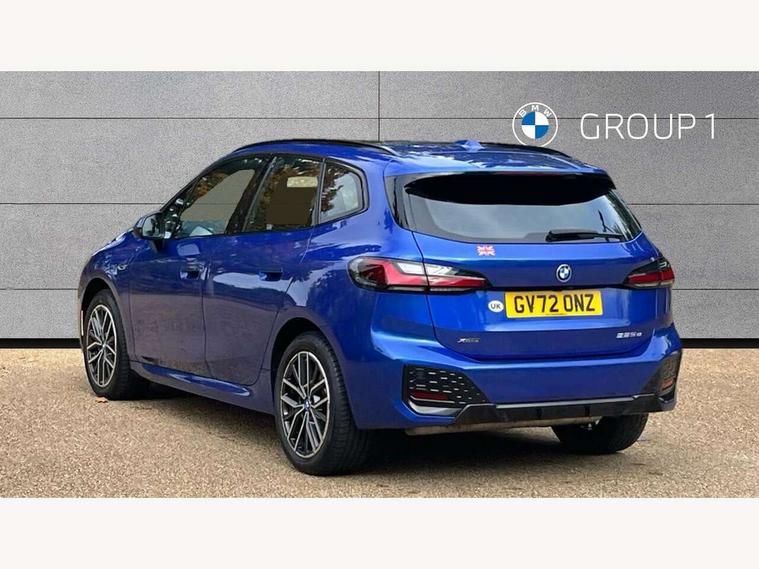Active Guard incl speed limiting and lane departure functions with auto steering, and front collision warning with brake intervention, Automatic powered tailgate, Automatic start/stop function, BMW Iconic sounds electric, BMW Online services, BMW Teleservices, Brake pad wear indicator in front and rear, Condition based service, Drive off assistant, Flat air vents on instrument panel in high gloss black, adjustable slats with elements in pearl chrome, iDrive controller, Language version English, On board computer - average speed+fuel consumption, service interval, clock/date, odometer/trip meter, outside temperature display and ice warning, Parking assistant with active park distance control, reversing assistant, lateral parking aid and rear view camera, Servotronic variable electric power steering (EPS), Smartphone integration, Widescreen display, 45 Litre fuel tank, Drive performance control with ECO PRO comfort + sport mode, eDrive exterior sound, Gear selector switch with toggle operation, M Adaptive suspension, Mode 3 charging cable, Petrol Particulate Filter, Steptronic transmission with double clutch and gear shift paddles, 2x USB Type C ports in front centre console for charging and data transfer, 2x USB Type C ports in rear centre console for charging, DAB Digital radio, Welcome sound upon opening of the front driver or passenger door, Air inlet middle part on front apron in lines specific design with trim strip in satinised aluminium, Automatic headlights, BMW emblem, engine compartment lid and tailgate, Body colour roof mouldings, Body coloured door mirror caps, Contoured rear roof spoiler in vehicle colour with side aeroblades in black high-gloss, Driver side exterior mirror lighting with BMW logo projection, Dynamic brake lights, Electric adjustable heated door mirrors, Electric windows - front and rear, with open/close fingertip control, anti-trap facility and comfort closing, Folding door handles integrated flush with surface, Front and rear windscreen wipers with heated front washer nozzles, Front bumper cover with independent design in body colour with inserts in black high gloss, Front bumper design elements in satinised aluminium, Front door exit lights, Front door sill finishers aluminium inserts with M inscription, Front entry sills with aluminium inserts + BMW inscription, Front oramental grille with radiator grille bars in satinised aluminium, Heated rear window, Hidden exhaust pipe, High gloss shadow line, High gloss shadowline roof rails, Key with M identification, LED Daytime running lights and parking lights with turn indicators, LED number plate light, LED third brake light in rear spoiler, M identification on sides, Manual headlight range control, Model inscription on right tailgate, Rain sensor, Rear bumper cover with independent design in body colour with inserts in black high gloss, Rear bumper trim strip in satinised aluminium, Rear side wing doors, Shark fin antenna, Side sill covers with independent design in Body colour, Trailer stabilisation logic, Trims on front and rear bumper covers colour-coordinated with side window graphic, Visible VIN plate, Welcome lighting, Windscreen washer nozzle for rear view camera, 12V power socket in luggage compartment and front centre console, 12V socket in right side trim panel, 2 bag hooks in luggage compartment, 2 front reading lights, 2 open cup holders in front centre console, 3 seat bench in 2nd row, 40:20:40 split folding rear seat backrests, Ambient lighting front and rear, Automatic two zone climate control air conditioning, Bottle trays in all doors, Child seat ISOFIX attachment for two outer rear seats and front passenger seat with anchorage points, Driver and front passenger sports seats, Four grab handles integrated in roof lining, Front and rear door pockets, Front and rear footwell lighting, Front and rear side armrest integrated into door trim, Front centre console storage compartment, Front head restraints, Glovebox with light, Heated front seats, Height adjustable 3 rear head restraints, Interior door handle recess light on all doors, Luggage compartment lighting, M Anthracite headlining, M specific floor mats, M sport leather steering wheel, Map pockets, Mechanical rear seats with fore/aft adjustment, Multi-function controls for steering wheel, One piece parcel shelf opens together with tailgate and removable, Rear cloth hooks, Single front passenger seat, Stainless steel pedals, Steering wheel column manual adjustment, Storage compartment lighting in centre console and storage tray in centre stack, Storage compartment net in left side trim panel, Storage compartment with folding cover under centre console armrest cushion, Storage tray in right side trim panel, Sunvisors with illuminated vanity mirrors, Three spoke sport leather steering wheel, Connected pack professional - 2 Series Active Tourer, Technology pack - 2 Series Active Tourer - MY22, 3 point seatbelts on all seats, front pyrotechnic belt tensioners, stopper and belt force limiters, rear coded belt buckles, Airbag - Front driver and passenger, front and rear head, front side, curtain head protection, manual deactivation of front passenger airbag possible, Anti lock braking system (ABS) with brake assist, Automatic hold function, BMW emergency call, Brake drying, Braking readiness, Child proof locking system in rear door, Cornering brake control, Crash Sensor - activates hazard/interior lighting + unlocks doors, DSC - Dynamic Stability Control, Dynamic brake control, Dynamic Traction Control - DTC, Electromechanical parking brake, Energy recovery system, Front disc brakes, Integrated braking system, PC iBrake PostCrash approach control warning with light braking function, Rear disc brakes, Tyre pressure monitoring system, Warning triangle and first aid kit, Anti theft alarm system, Closing system with central locking, Engine immobiliser, Locking wheel bolts, Front centre console trim in high gloss black with my mode expressive, BMW mobility