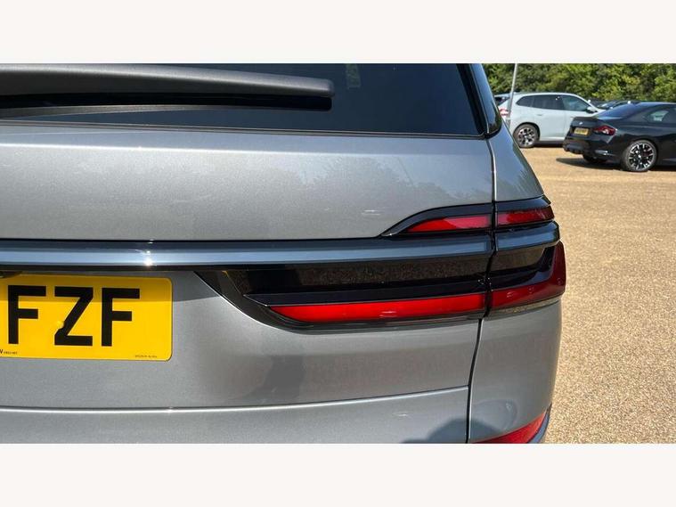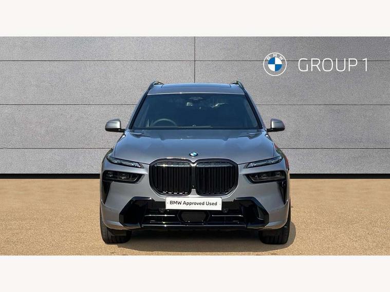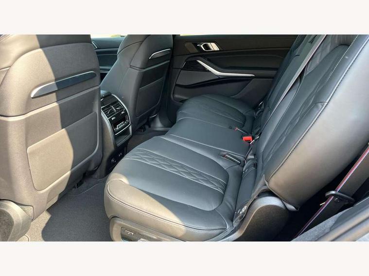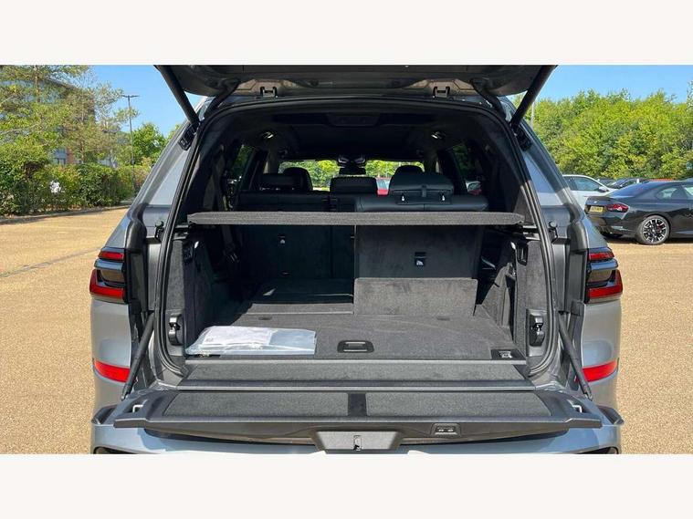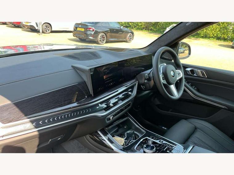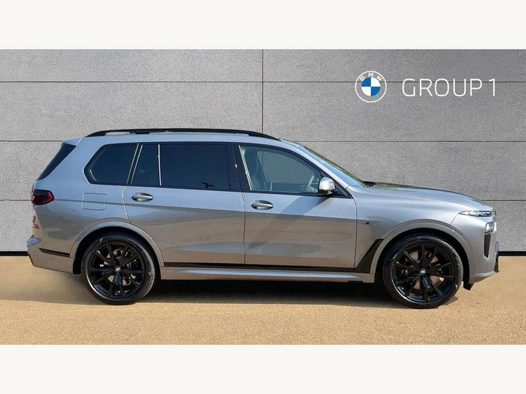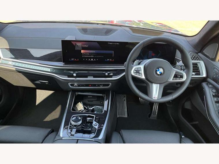 2 rear USB-C ports, Attentiveness assist, Automatic start/stop function, Automatic tailgate operation, BMW ConnectedDrive online services, BMW Drive recorder, BMW gesture control, BMW Teleservices, Brake pad wear indicator in front and rear, Condition based service, Integrated owner's handbook, Live Cockpit Professional with head up display including 12.3" instrument cluster and 14.9" central display, Parking assistant pro including reversing assistant, PDC, lateral parking aid, reversing assist camera, parking drive off monitoring, 48V Mild hybrid technology, 8 speed automatic with steptronic transmission including automatic hold function and gearshift paddles on the steering wheel, Drive experience switch with comfort mode + ECO PRO + sport mode, Permanent all wheel drive, 2x Front USB (1x USB-C, 1x USB-A), DAB radio, Personal eSim, Acoustic glazing, Adaptive air flap control bars in high gloss black, Air breather and door claddings in high gloss chrome, Body coloured wheel arches, Dynamic brake lights with LED technology, Electrically adjustable and heated aspheric folding side mirrors with auto dimming, electric fold in function, automatic parking function, Exterior and central air inlets in front bumper painted pearl chrome, Follow me home headlight function, Frameless interior mirror, Front and rear electric windows, Heated windscreen washer nozzles, High beam assist, High gloss black shadow line roof rails, High gloss black shadowline trim in side/window frame, window recess cover, window guide, B and C pillar, mirror triangle, mirror base, mirror frame, Integrated turn indicators, LED daytime running lights, LED rear lights, LED third brake light in rear spoiler, Rain sensor with automatic headlight activation and windscreen wiper control, Rear side wing doors, Sump guard front and rear painted in silver, Trailer stabilisation logic, 12V - Power sockets with 2x centre console and 1x luggage compartment, 2 seat bench in 3rd row, 2x cupholders in front, rear centre armrest and two in third row seats, 3 seat bench in 2nd row, 3 spoke M leather multifunction steering wheel, 40:20:40 split folding rear seat backrests, Ambient lighting strip in the instrument panel with illuminated, Armrest in front centre console, Compartment in front of cupholder, Driver and front passenger sunvisors with illuminated vanity mirrors and ticket holder, Electrical steering column with adjustable height and length with activation and control on the steering column, Entry sills with illuminated M inscription, Fold down flush into floor of luggage compartment 50:50, Front and rear colour co-ordinated with all standard carpet colours, Front and rear door pockets, Front and rear side armrests integrated into door trim, Front seat back pockets, Grab handles, Height adjustable front headrests, Height adjustable rear headrests, Lockable glove compartment, Nano filter, Single front passenger seat, Soft close doors, Storage tray and compartment with lid in centre console, Wireless charging tray, Additional storage compartment pack - X7, Ambient light interior pack - X7, Connected Package Professional - X7, Interior lighting pack - X7, Luggage compartment pack - X7, M aerodynamics pack - X7, M Sport pack - X7, 3 point seatbelts on all seats, front pyrotechnic belt tensioners, stopper and belt force limiters, front and outer rear seats, Acoustic protection for pedestrians, Active protection, Airbag - Front driver and passenger, side airbags and Head airbags, Anti lock braking system (ABS) with cornering brake control, Automatic Stability Control (ASC), BMW emergency call, Child seat ISOFIX attachment rear outer seats in 2nd row and both seats in 3rd row includes top tether, Comfort access system with digital key, Comfort cushion seats for outer seats in 2nd row, Crash sensor inclu activation of airbags, interior light, safety battery terminal clamp, hazard warn flasher, unlock doors, deactivation of fuel pump, DSC - Dynamic Stability Control, Dynamic Traction Control - DTC, Electromechanical parking brake with automatic drive away release and auto hold function, Front and rear brake discs with interior ventilation, Hill descent control, Integrated braking system, Manual child lock in rear doors, PC iBrake PostCrash approach control warning with light braking function, Tyre pressure monitoring system, Tyre pressure sensors, Variable torque distribution, Warning triangle and first aid kit, Alarm, Central locking including 2 vehicle keys with integrated emergency key, Engine immobiliser, Locking wheel bolts, Galvanic embellisher for controls,
