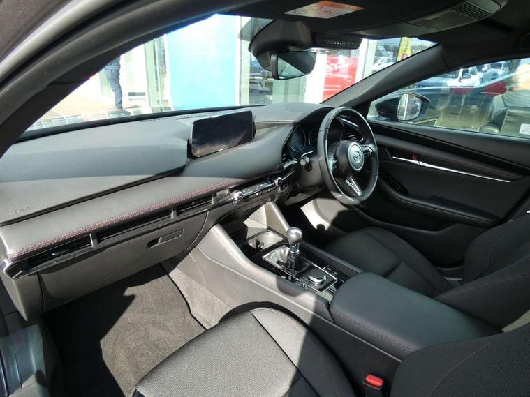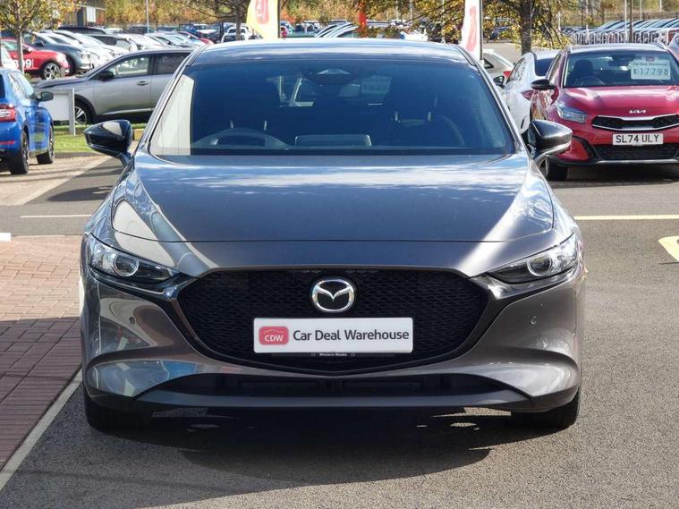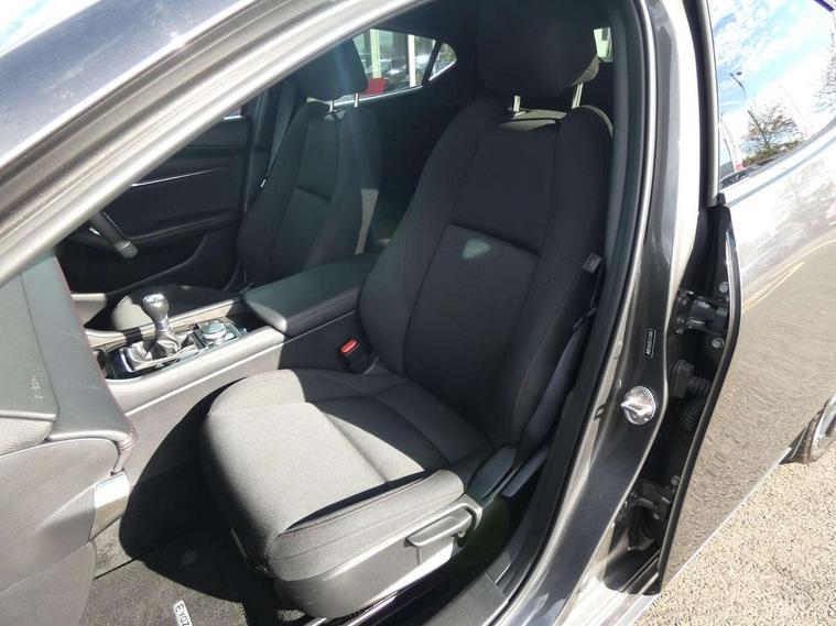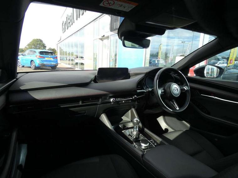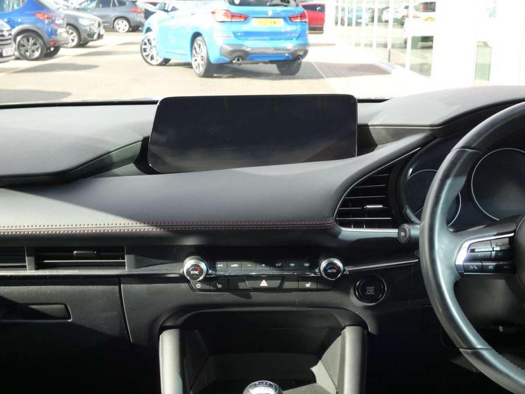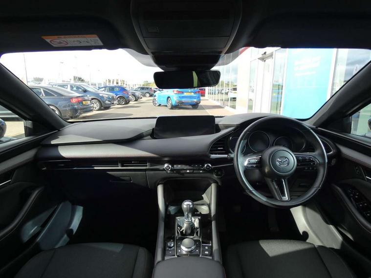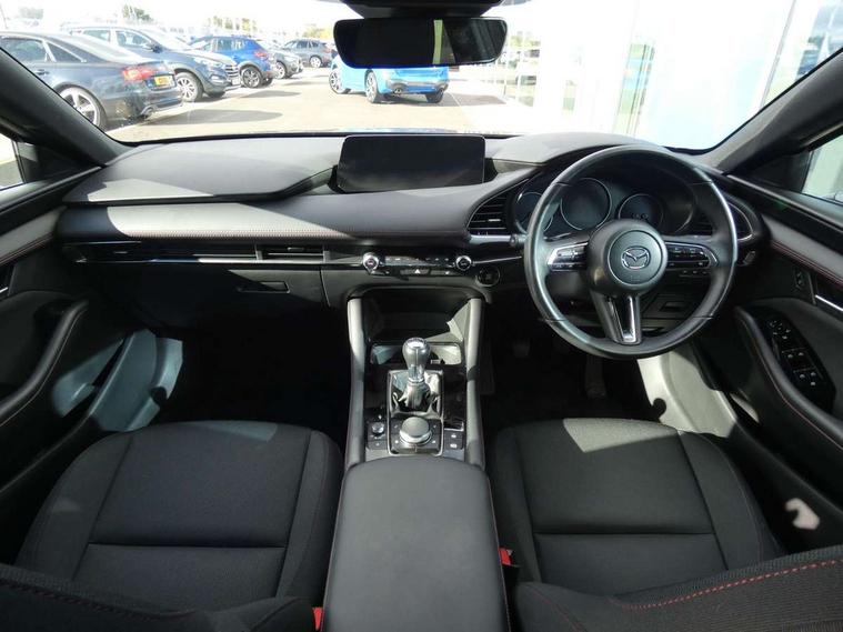 10.25" display with Mazda Connect infotainment, 7" colour TFT display, Audio transfer from bluetooth devices, Blind spot monitoring with rear cross traffic alert, Colour active driving display inc Windscreen projected, Traffic Sign Recognition, turn-by- turn navigation and Mazda Radar Cruise Control information, Digital instrument cluster, Driver attention alert system, E-call with GPS, Emergency stop signalling system, Engine start/stop button, Front and rear parking sensor with audible and visual warning, Head up Display, Integrated bluetooth with steering wheel mounted controls, Intelligent speed assist, Lane keep assist system (LAS) with Lane departure warning system (LDWS), Mazda connected services, Mazda Navigation System with european mapping, Mazda Radar Cruise Control, Mobile App interface, Multimedia Commander, PAS, Reversing camera, Service indicator, Tailgate, Traffic sign recognition (TSR), Trip computer, Wireless Apple CarPlay/Android Auto, Wireless charging, i-stop, 2 USB-C ports in the front, Mazda Multimedia System with AM / FM / DAB radio with 8 speakers, Auto dimming rear view mirror, B-pillar garnish in piano black, Black door mirrors, Coming/leaving home lighting function, Dark metallic finish signature wing, Daytime running lights, Dual chrome tailpipes tip, Dusk sensing headlights, Electric front/rear windows with one touch/auto up/down, Electrically adjustable, heated auto power folding door mirrors, Front body coloured bumper with black lower bezel, Front kodo turn signal, Gloss black finish front grille, Gloss black rear roof spoiler, High beam control, LED front fog lights, LED headlamps with auto levelling, LED indicator lights, LED rear combination lights, LED third brake light, Privacy glass with dark tinting on rear side windows and rear window, Rain sensing front wipers with adjustable sensitivity and speed, Rear colour coded bumper with gloss black lower moulding, Rear fog lights, Rear side wing doors, Speed adjustable rear wash wiper with intermittent wipe, 12v electrical power outlet, 3 seat bench in 2nd row, 60/40 split fold down rear seats, Black with red stiching steering wheel, gearshift gaitor, dashboard panel, armrest, Cloth upholstery, Dark cloth door panel inserts, Dark roof headlining, ceiling and pillars, Driver seat manual slide, recline, height and seat tilt adjust, Driver, front passenger and two rear door pockets, Driver, Front passenger and two rear grab handles with coathooks, Driver/passenger sunvisors + vanity mirrors (drivers side with ticket holder), Dual zone climate control air conditioning, Folding rear centre armrest with two cup holders, Front and rear courtesy lamps, Front armrest, Front centre storage with two cupholders, Front head restraints, Front passenger seatback pocket, Front passengers seat manual slide, recline and height adjustment, Gear shift indicator, Heated front seats with 3 stage setting, Illuminated glovebox, Interior colouration dashboard and doorcards in black with dark stitching, ISOFIX child seat anchorage points attached on outer rear seats, Leather wrapped gear shift knob, Leather wrapped steering wheel, LED interior light, LED light in luggage compartment, Power outlet in luggage compartment, Roof mounted sunglasses holder, Single front passenger seat, Three height adjustable rear head restraints, Tilt/height adjustable steering wheel, 3 point ELR front seatbelts with pretensioners, 3 rear 3 point seatbelts with ELR, Anti-lock braking system (ABS), Drivers knee airbag, DSC - Dynamic Stability Control, Dual stage driver and single stage passenger airbags, EBD - Electronic brakeforce distribution, Electronic parking brake with auto disengage function and auto hold function, Front and rear curtain airbags, Front passenger airbag cut-off switch, Front side airbags, Front smart city brake support, G-Vectoring control plus, Hill launch assist, Intelligent Traction Control system, Manual child lock in rear doors, Mild Hybrid system with regenerative braking, Seatbelt reminder for driver/front passenger and rear seats, Tyre pressure monitoring system (TPMS), Auto door lock when driving, Remote central locking + deadlocks, Smart keyless entry, Thatcham accredited alarm and immobiliser, 18" Black alloy wheels, Emergency tyre repair kit,