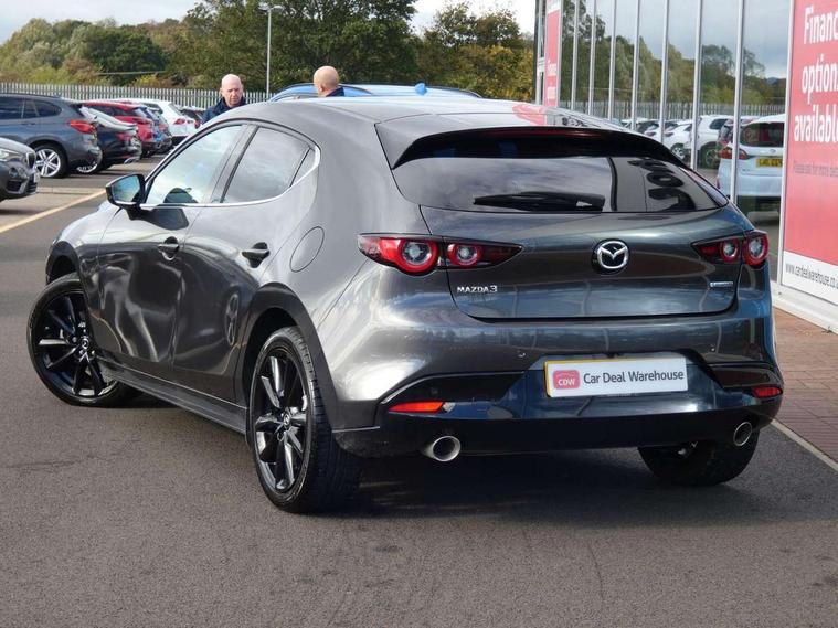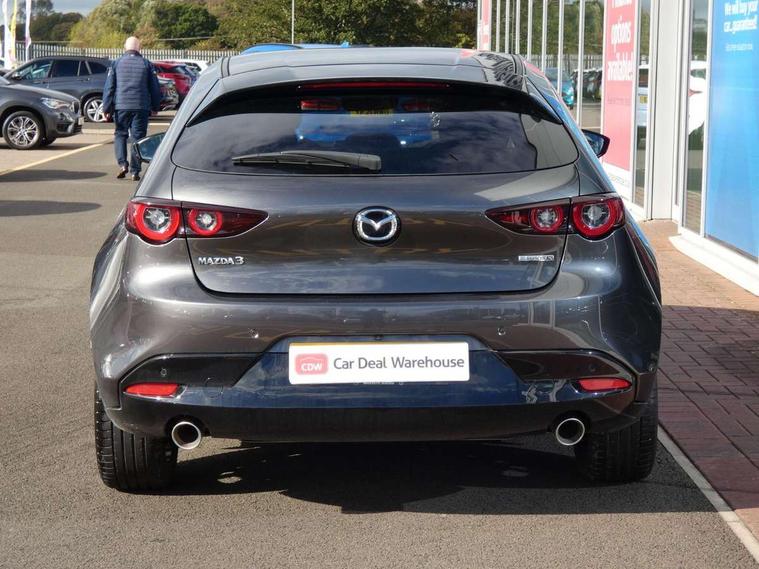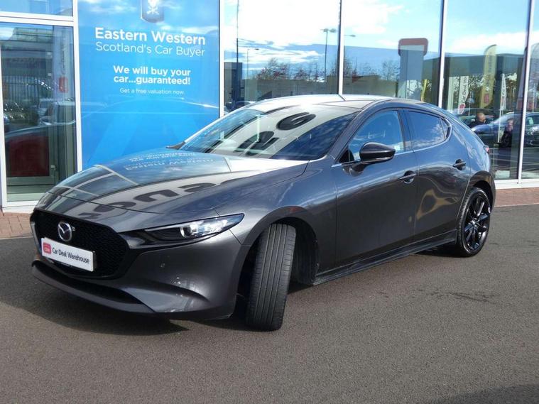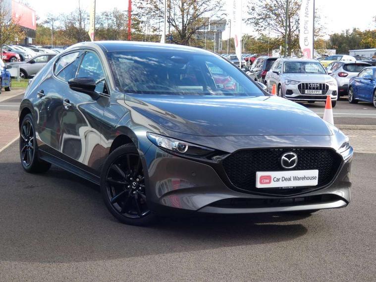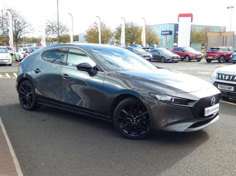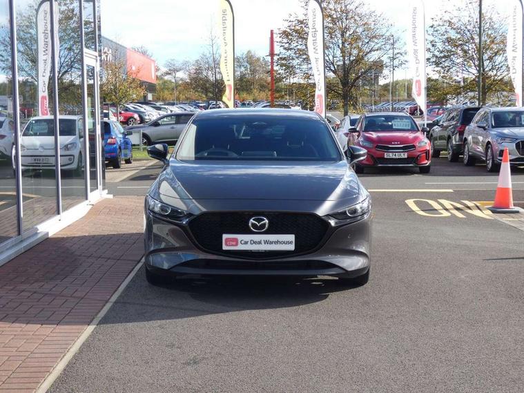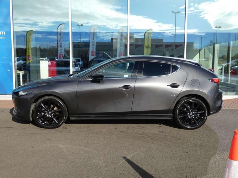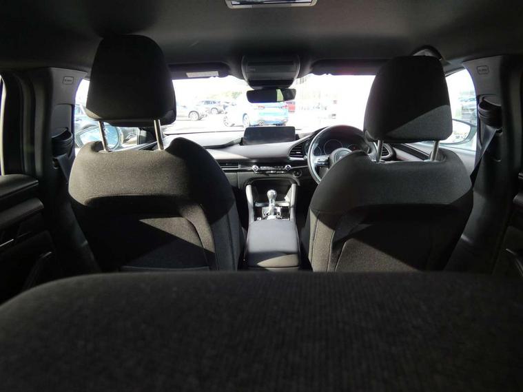 10.25" display with Mazda Connect infotainment, 7" colour TFT display, Audio transfer from bluetooth devices, Blind spot monitoring with rear cross traffic alert, Colour active driving display inc Windscreen projected, Traffic Sign Recognition, turn-by- turn navigation and Mazda Radar Cruise Control information, Digital instrument cluster, Driver attention alert system, E-call with GPS, Emergency stop signalling system, Engine start/stop button, Front and rear parking sensor with audible and visual warning, Head up Display, Integrated bluetooth with steering wheel mounted controls, Intelligent speed assist, Lane keep assist system (LAS) with Lane departure warning system (LDWS), Mazda connected services, Mazda Navigation System with european mapping, Mazda Radar Cruise Control, Mobile App interface, Multimedia Commander, PAS, Reversing camera, Service indicator, Tailgate, Traffic sign recognition (TSR), Trip computer, Wireless Apple CarPlay/Android Auto, Wireless charging, i-stop, 2 USB-C ports in the front, Mazda Multimedia System with AM / FM / DAB radio with 8 speakers, Auto dimming rear view mirror, B-pillar garnish in piano black, Black door mirrors, Coming/leaving home lighting function, Dark metallic finish signature wing, Daytime running lights, Dual chrome tailpipes tip, Dusk sensing headlights, Electric front/rear windows with one touch/auto up/down, Electrically adjustable, heated auto power folding door mirrors, Front body coloured bumper with black lower bezel, Front kodo turn signal, Gloss black finish front grille, Gloss black rear roof spoiler, High beam control, LED front fog lights, LED headlamps with auto levelling, LED indicator lights, LED rear combination lights, LED third brake light, Privacy glass with dark tinting on rear side windows and rear window, Rain sensing front wipers with adjustable sensitivity and speed, Rear colour coded bumper with gloss black lower moulding, Rear fog lights, Rear side wing doors, Speed adjustable rear wash wiper with intermittent wipe, 12v electrical power outlet, 3 seat bench in 2nd row, 60/40 split fold down rear seats, Black with red stiching steering wheel, gearshift gaitor, dashboard panel, armrest, Cloth upholstery, Dark cloth door panel inserts, Dark roof headlining, ceiling and pillars, Driver seat manual slide, recline, height and seat tilt adjust, Driver, front passenger and two rear door pockets, Driver, Front passenger and two rear grab handles with coathooks, Driver/passenger sunvisors + vanity mirrors (drivers side with ticket holder), Dual zone climate control air conditioning, Folding rear centre armrest with two cup holders, Front and rear courtesy lamps, Front armrest, Front centre storage with two cupholders, Front head restraints, Front passenger seatback pocket, Front passengers seat manual slide, recline and height adjustment, Gear shift indicator, Heated front seats with 3 stage setting, Illuminated glovebox, Interior colouration dashboard and doorcards in black with dark stitching, ISOFIX child seat anchorage points attached on outer rear seats, Leather wrapped gear shift knob, Leather wrapped steering wheel, LED interior light, LED light in luggage compartment, Power outlet in luggage compartment, Roof mounted sunglasses holder, Single front passenger seat, Three height adjustable rear head restraints, Tilt/height adjustable steering wheel, 3 point ELR front seatbelts with pretensioners, 3 rear 3 point seatbelts with ELR, Anti-lock braking system (ABS), Drivers knee airbag, DSC - Dynamic Stability Control, Dual stage driver and single stage passenger airbags, EBD - Electronic brakeforce distribution, Electronic parking brake with auto disengage function and auto hold function, Front and rear curtain airbags, Front passenger airbag cut-off switch, Front side airbags, Front smart city brake support, G-Vectoring control plus, Hill launch assist, Intelligent Traction Control system, Manual child lock in rear doors, Mild Hybrid system with regenerative braking, Seatbelt reminder for driver/front passenger and rear seats, Tyre pressure monitoring system (TPMS), Auto door lock when driving, Remote central locking + deadlocks, Smart keyless entry, Thatcham accredited alarm and immobiliser, 18" Black alloy wheels, Emergency tyre repair kit,