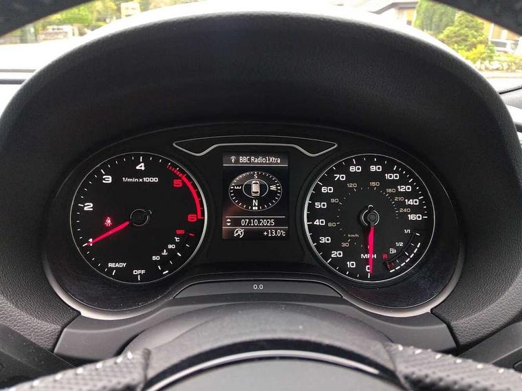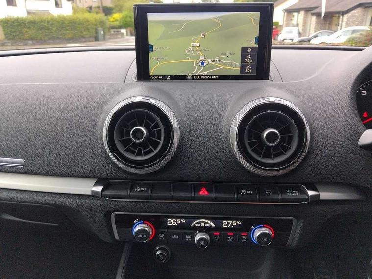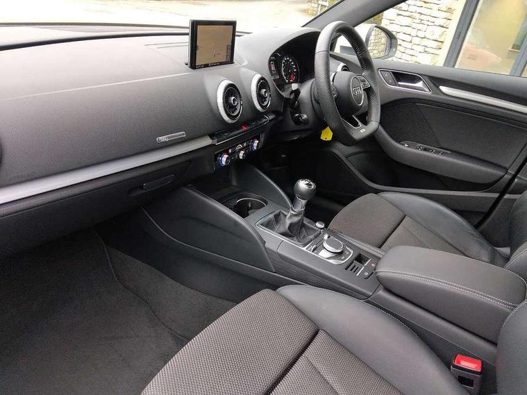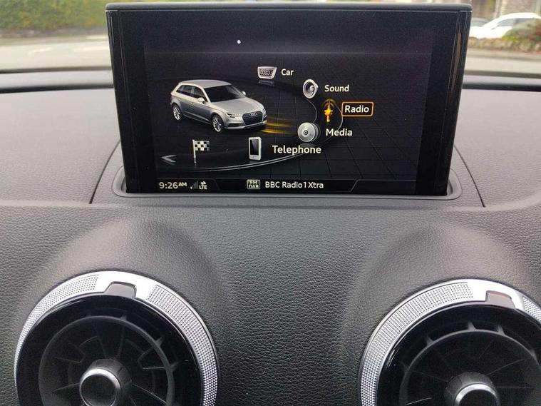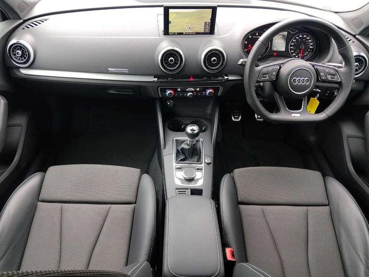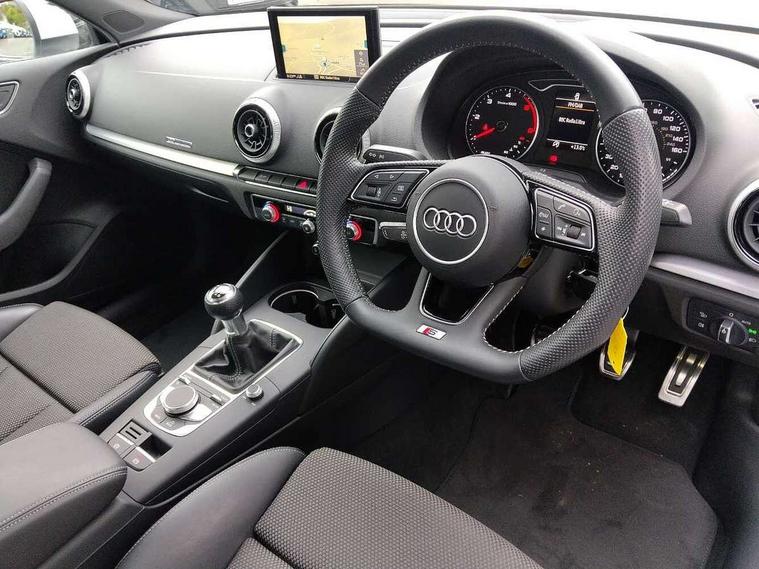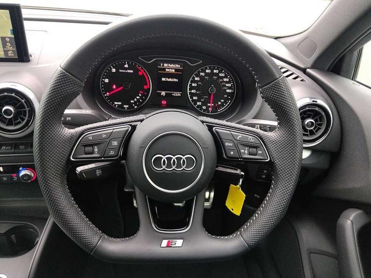 Audi drive select, Audi smartphone interface, Automatic start/stop system, Colour driver's information system display, Electro - mechanical power assisted steering, Mobile telephone preparation - bluetooth interface, SD card based MMI navigation, Service interval indicator, Speed limit display, Voice control system, Voice recognition for navigation system, Diesel particulate filter, Sports suspension, 2 USB interfaces and Aux-In jack, Audi music interface, CD player, DAB Digital radio, MMI radio plus with 7" colour MMI screen and MMI controller, Online entertainment, Aluminium window trim, Auto dimming interior rear view mirror, Body colour door mirrors, Chrome exhaust tailpipes, Electric front windows, Electric rear windows, Electrically adjustable and heated door mirrors with integrated LED side indicators, Heated windscreen washer jets, LED daytime running lights, Light and rain sensors, Matt black radiator grille, Rear wiper, S line badges on front wings, S Line body styling with front & rear bumpers and side skirts, radiator grille and rear diffuser insert, roof spoiler, Sport specific side air inlet grille and diffuser insert, 3 adjustable rear headrests, 3 spoke flat bottomed multi-function leather sport steering wheel, 60/40 split folding rear seat, Adjustable front centre armrest, Black cloth headlining, Dual zone electronic climate control, Front and rear interior lights with delay, Front/rear floor mats, Height and reach adjustable steering wheel, Illuminated door sill trims with S logo, Isofix child seat preparation for front passenger/outer rear seats inc passenger airbag deactivation including top tether, Lashing point in luggage compartment, Manual height adjustable front seats, Stainless steel pedals, Storage compartments in doors side trims, centre console and under front drivers seat, LED interior light pack - A3/RS3, Non smoking pack - A3, Storage and luggage pack - A3/RS3, 3 point seatbelts on all seats, ABS/EBD, Active bonnet, Active front headrests, Airbags - front driver/passenger, front & rear side, curtain, drivers knee, ASR, EDL, Electromechanical parking brake, ESC - Electronic Stability Control + traction control, Front passenger airbag deactivation, Hill hold assist, Manual rear child locks, Multi-Collision braking, Seatbelt warning, Tyre pressure warning, Warning triangle and first aid kit, Anti theft alarm, Anti-theft wheel bolts, Remote control central locking, Thatcham category 1 alarm + immobiliser, Aluminium air vent surrounds, Aluminium trim elements, Matt brushed aluminium inlays, Tool kit, Tyre repair kit,