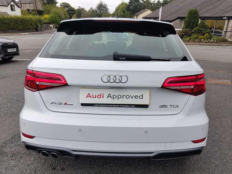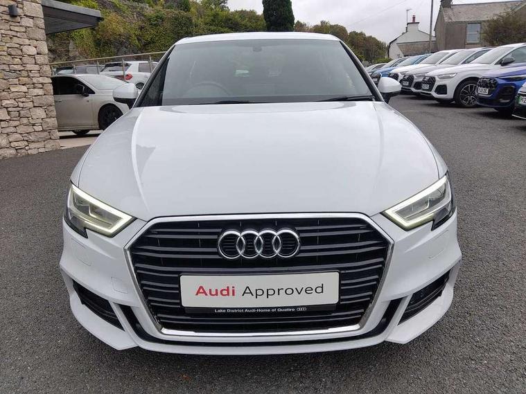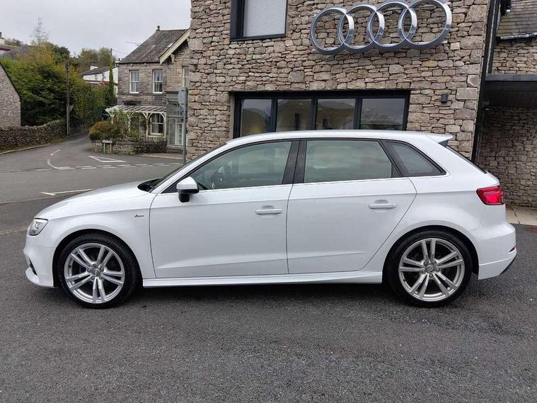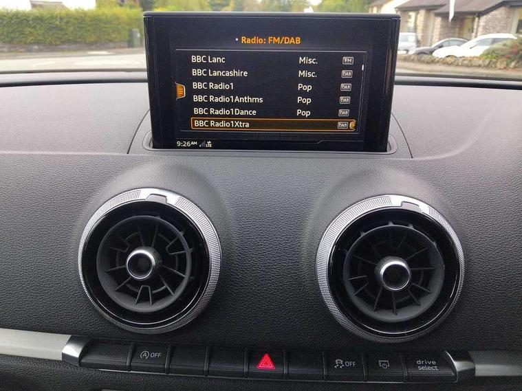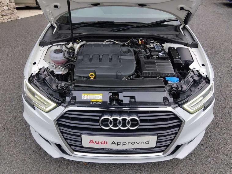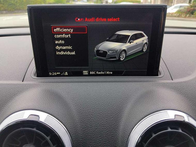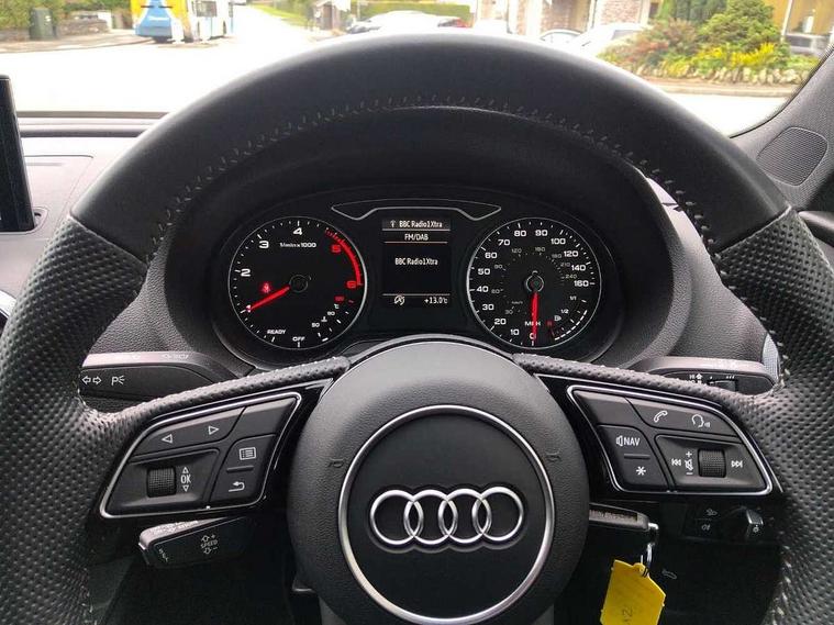 Audi drive select, Audi smartphone interface, Automatic start/stop system, Colour driver's information system display, Electro - mechanical power assisted steering, Mobile telephone preparation - bluetooth interface, SD card based MMI navigation, Service interval indicator, Speed limit display, Voice control system, Voice recognition for navigation system, Diesel particulate filter, Sports suspension, 2 USB interfaces and Aux-In jack, Audi music interface, CD player, DAB Digital radio, MMI radio plus with 7" colour MMI screen and MMI controller, Online entertainment, Aluminium window trim, Auto dimming interior rear view mirror, Body colour door mirrors, Chrome exhaust tailpipes, Electric front windows, Electric rear windows, Electrically adjustable and heated door mirrors with integrated LED side indicators, Heated windscreen washer jets, LED daytime running lights, Light and rain sensors, Matt black radiator grille, Rear wiper, S line badges on front wings, S Line body styling with front & rear bumpers and side skirts, radiator grille and rear diffuser insert, roof spoiler, Sport specific side air inlet grille and diffuser insert, 3 adjustable rear headrests, 3 spoke flat bottomed multi-function leather sport steering wheel, 60/40 split folding rear seat, Adjustable front centre armrest, Black cloth headlining, Dual zone electronic climate control, Front and rear interior lights with delay, Front/rear floor mats, Height and reach adjustable steering wheel, Illuminated door sill trims with S logo, Isofix child seat preparation for front passenger/outer rear seats inc passenger airbag deactivation including top tether, Lashing point in luggage compartment, Manual height adjustable front seats, Stainless steel pedals, Storage compartments in doors side trims, centre console and under front drivers seat, LED interior light pack - A3/RS3, Non smoking pack - A3, Storage and luggage pack - A3/RS3, 3 point seatbelts on all seats, ABS/EBD, Active bonnet, Active front headrests, Airbags - front driver/passenger, front & rear side, curtain, drivers knee, ASR, EDL, Electromechanical parking brake, ESC - Electronic Stability Control + traction control, Front passenger airbag deactivation, Hill hold assist, Manual rear child locks, Multi-Collision braking, Seatbelt warning, Tyre pressure warning, Warning triangle and first aid kit, Anti theft alarm, Anti-theft wheel bolts, Remote control central locking, Thatcham category 1 alarm + immobiliser, Aluminium air vent surrounds, Aluminium trim elements, Matt brushed aluminium inlays, Tool kit, Tyre repair kit,