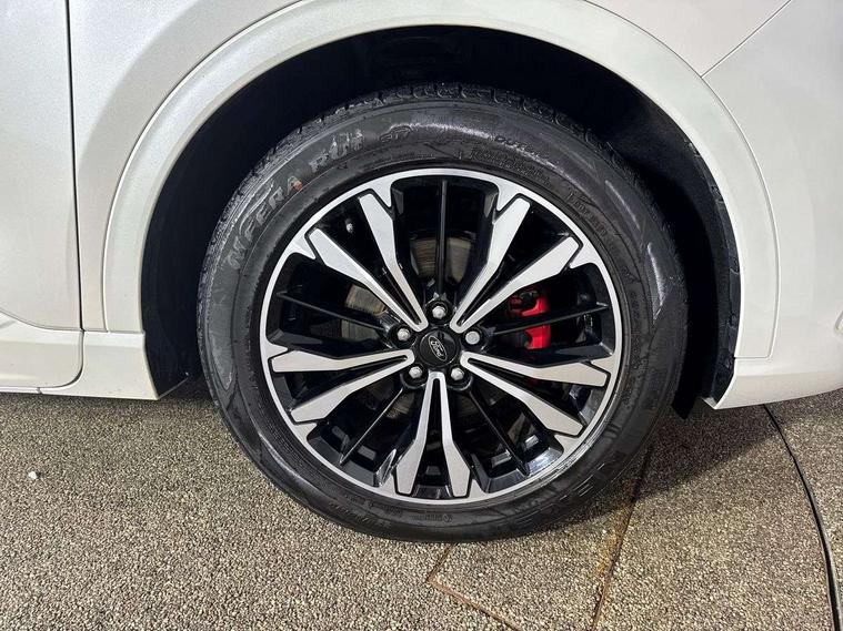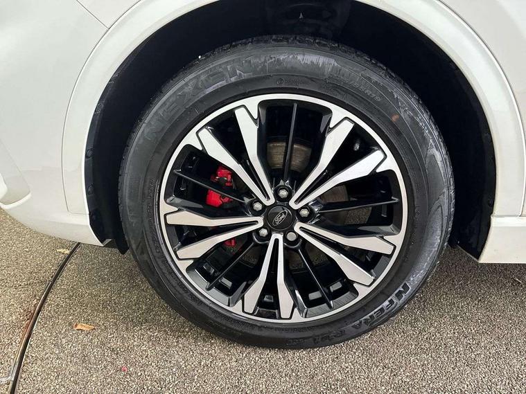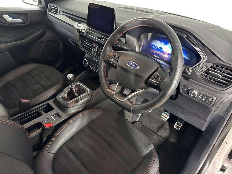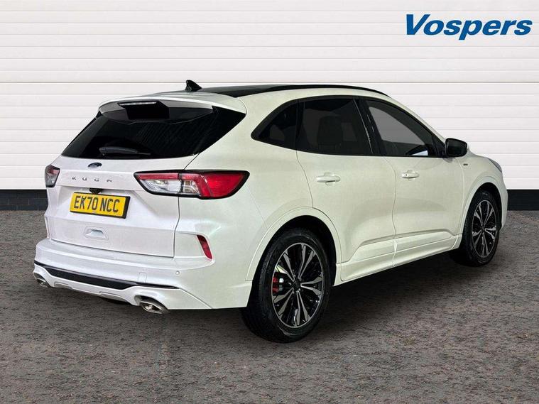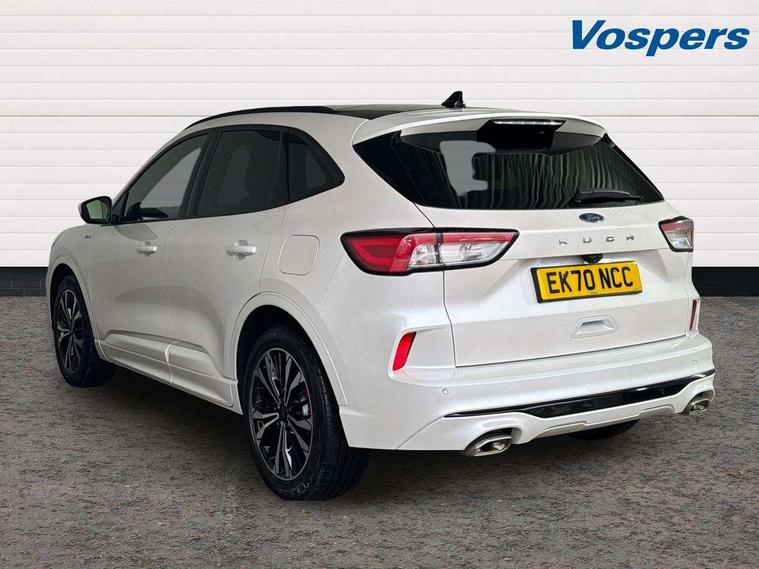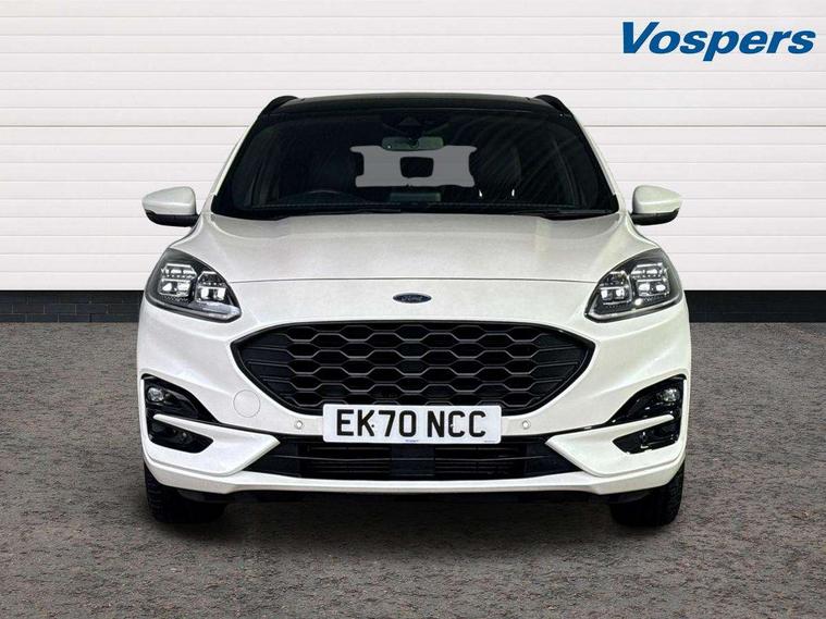 Ford easy fuel, Front and rear parking sensors, Hands free power tailgate, Lane keeping aid with lane departure warning, Mobile phone wireless charging pad, Power assist steering, Selectable drive modes, Auto headlamps with high and low beam, Day/night rear view mirror, Front LED fog lamps, Halogen Projector Headlamps, Large rear spoiler, LED daytime running lights, LED rear lights, Power front/rear windows with global close, Power opening panoramic roof, Privacy glass, Quickclear heated windscreen, ST Line body styling kit with unique front and rear fascia and bumper, rear painted diffuser, front painted skid plates, dark mesh upper grille, ST Line front scuff plates, Twin exhausts, 10 way power adjustable drivers seat, 2nd row sliding seats with 60:40 split, Alloy pedals, Centre console with electronic parking brake, Dark headlining and pillars, Dual electronic automatic temperature control, Flat bottomed leather steering wheel in sensico with red stitching, Front and rear head restraints, Heated passenger and driver seats, Heated rear seats, Rear charging point, Sensico partial premium leather upholstery, Sports seats, ST Line front and rear floor mats, ST Line gear knob, B&O with large instrument cluster pack - Kuga, 3x3 point rear seatbelts, Airbags - front driver/passenger, front and rear curtain, Drivers knee airbag, Electronic stability control (ESC) and ABS, Ford MyKey Gen 2 safety system, Manual child proof rear door locks, Post collision braking, Pre collision assist with autonomous emergency braking, Red brake calipers, Tyre pressure monitoring system, Engine immobiliser, Keyless start with 'Ford Power' starter button, Locking wheel nuts, Remote powered central double locking doors, Thatcham category 1 alarm,