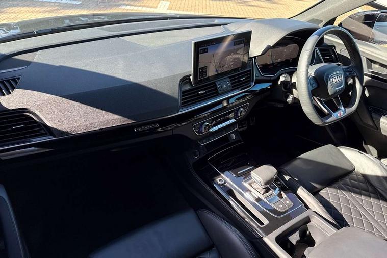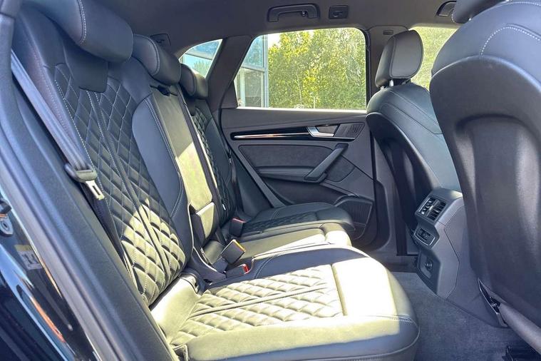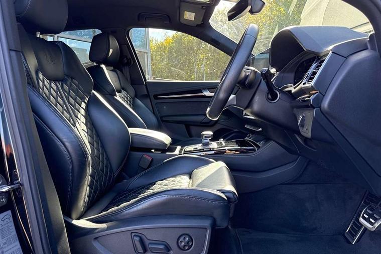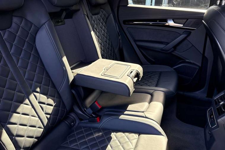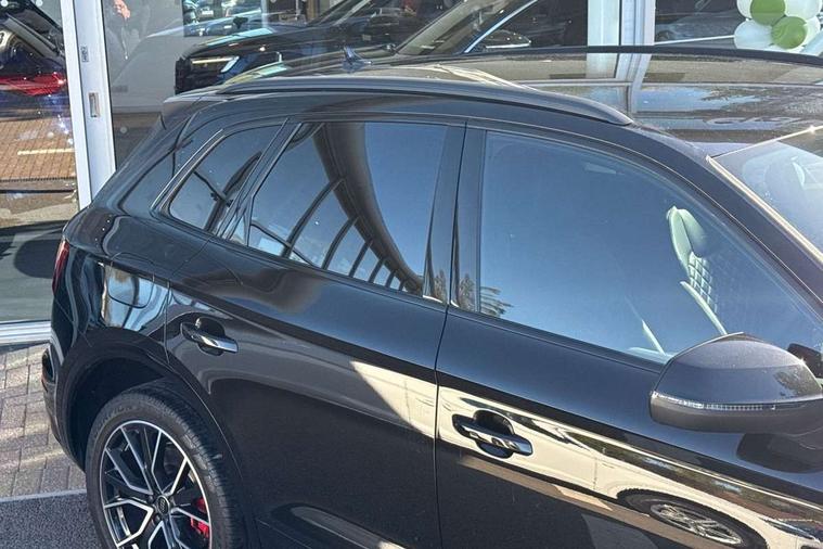 Acoustic front and rear parking sensor, Audi connect safety and service (e-call), Audi connect with Amazon Alexa Integration, Audi drive select, Audi virtual cockpit plus with 12.3" screen and three different layout designs, Audi wireless smartphone interface, Automatic start-stop system with coasting functionality and efficiency programme, Bluetooth interface, Electro - mechanical power assisted steering, MMI navigation plus with 10.1" touch screen, Power tailgate, Reversing camera, Service interval indicator, Voice control system with Audi hotword activation "Hey Audi", Diesel particulate filter, Quattro on demand, S line sports suspension, 8 loudspeakers, DAB Digital radio, Acoustic windscreen, Audi matrix LED headlights with dynamic front and rear indicators, Audi rings at front and rear in black, Audi rings decal on rear doors, Auto dimming door mirrors, Auto dimming frameless rear view mirror, Automatic headlight adjustment, Automatic headlights and windscreen wipers, Black roof rails, Body colour bumpers, Body colour underbody protection, Chrome plated exhaust trims, Daytime running lights, Door sills in Selenite silver, Electric adjustable/heated/folding door mirrors, Front air inlet surrounds in anthracite black, Front and rear electric windows, Headlight washers, High gloss black B pillar trims and triangular rear door trim, High level LED brake light, Rear chrome trim strip below lights, Rear privacy glass and rear side windows, Rear side wing doors, Rear wiper, Roof bars, S Line rear spoiler, 2 x USB charging port with aux input socket, 3 rear headrests, 4 way electric lumbar support for driver and front passenger, 40:20:40 split folding 3 rear bench seat in 2nd row with rear centre armrest, Black cloth headlining, Comfort front centre armrest, Contrast stitching on seats, steering wheel and gear lever gaiter, Deluxe 3 zone electronic climate control, Electrically adjustable front seats, Fine Nappa leather upholstery with diamond pattern contrast stitching + front sport seats with S embossed logo, Front/rear floor mats, Gear lever in black leather, Heated front seats, Height adjustable front head restraints, Height/reach adjustable steering column, Illuminated door sill trims with S logo, Luggage compartment cover, Rear seat bench plus-adjust for forwards/backwards position/backrest angle, cupholders in the armrest, load through hatch and remote backrest release, Removable luggage compartment floor, Single front passenger seat, Stainless steel pedals, Sunvisors with vanity mirrors, Black styling package - Q5 Edition 1, Extended interior upholstery pack - Q5, Extended LED Interior multi coloured Lighting Pack - Q5, 3 point seatbelts on all seats, 6 airbags - Driver, front passenger, curtain and side airbags, Electrically operated child locks on rear doors, Electromechanical parking brake, Electronic stabilisation control including ABS, ASR and EDL, First aid kit with warning triangle and vests, Front and rear brake calipers painted in red, Front passenger airbag deactivation, Hill descent control, Hill hold assist, ISOFIX child seat mounting for front passenger seat and ISOFIX child seat mounting with Top Tether for outer rear seats, Multi collision brake assist, Pop-up bonnet for pedestrian protection, Pre sense city, Seat belt force limiter, Seatbelt monitoring, Tyre pressure warning, Anti theft alarm, Anti-theft wheel bolts, Keyless Go access/ignition system, Remote central locking, Air vents inserts and centre console in gloss black, Piano black finish inlay,