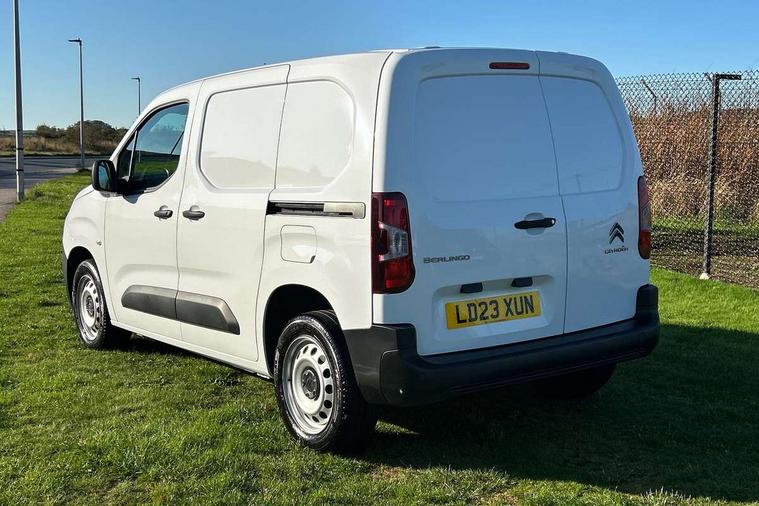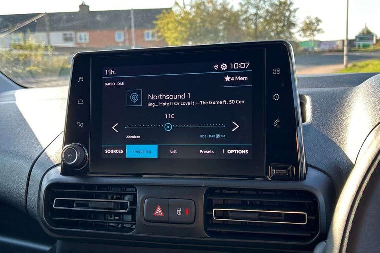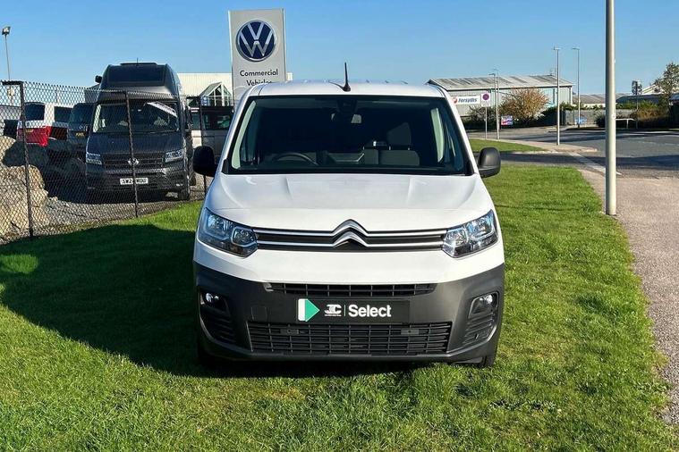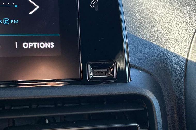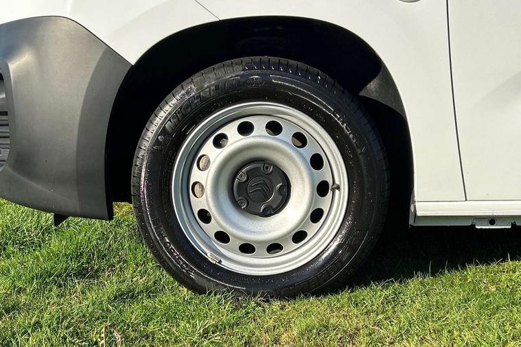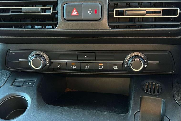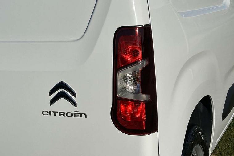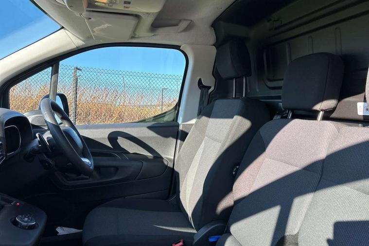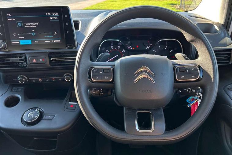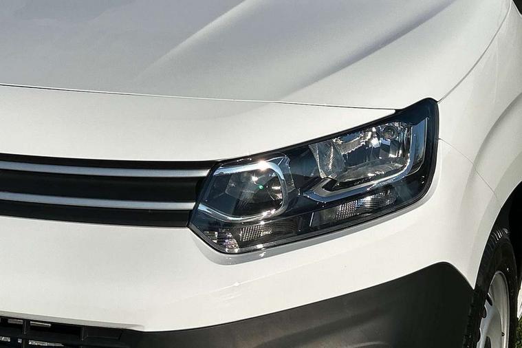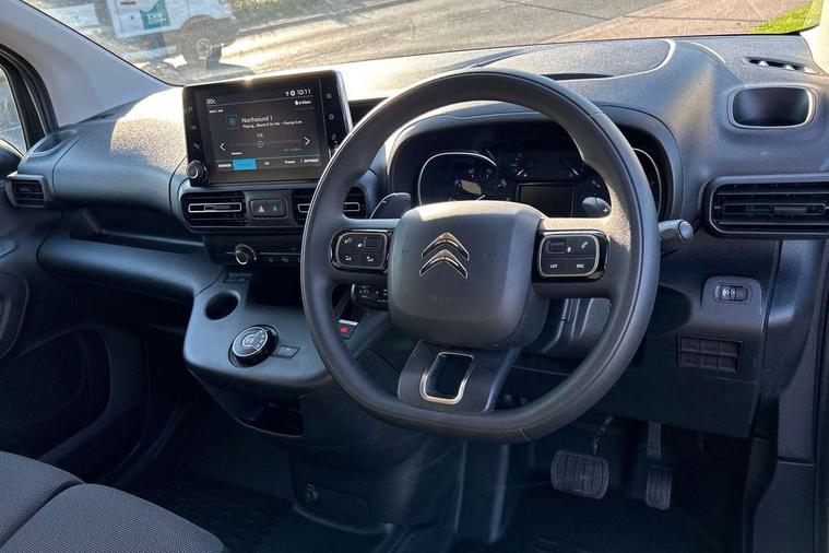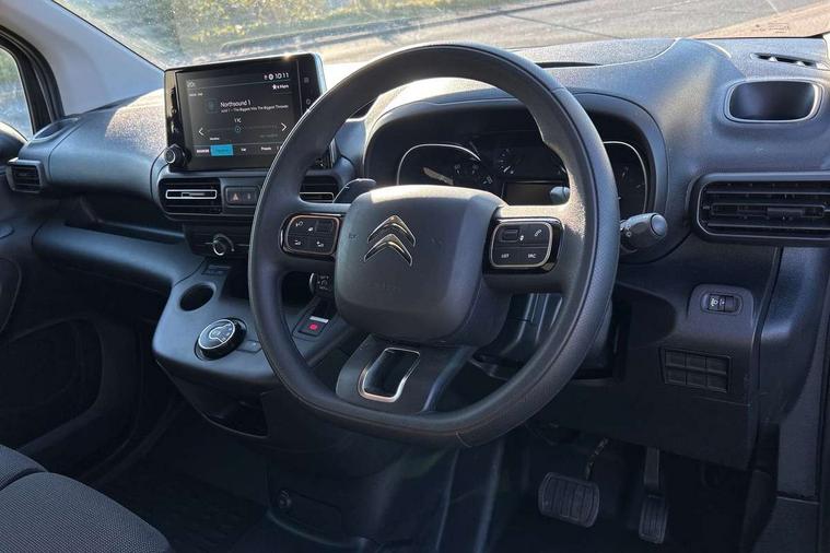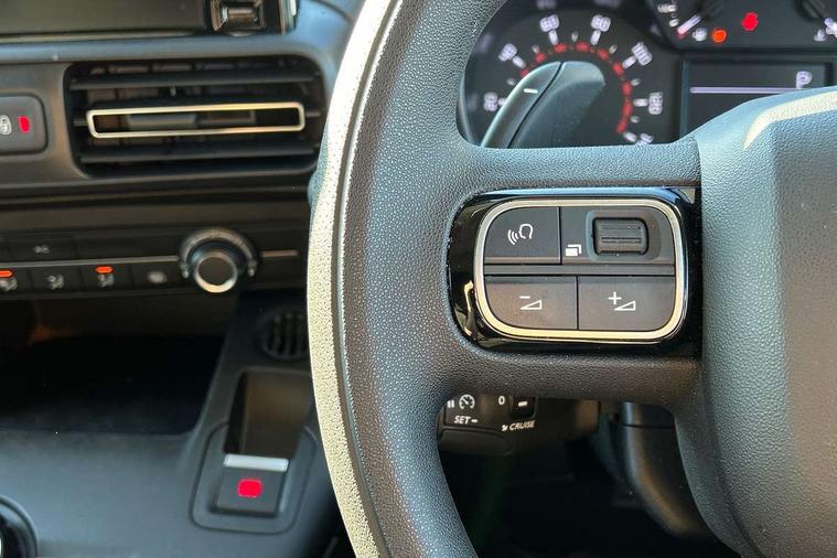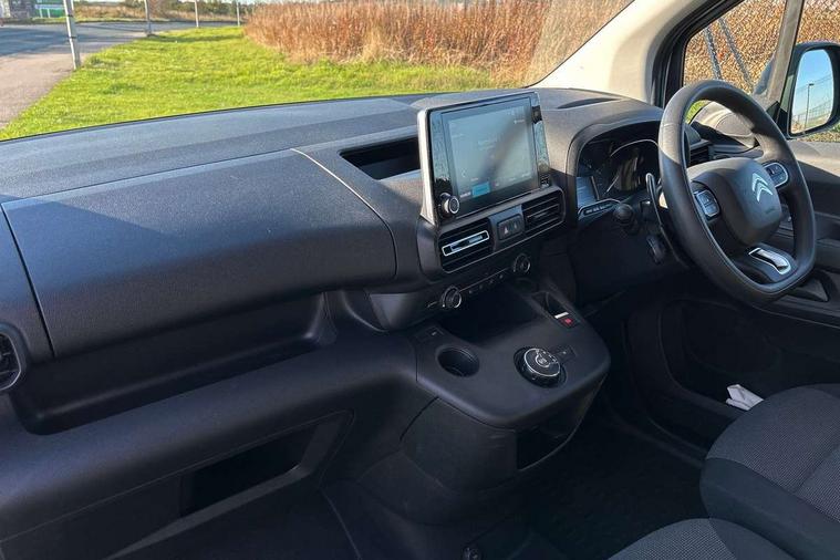 Citroen connect box with emergency and assistance system, Cruise control with programmable speed limiter, Electric power assisted steering with height and reach adjustable steering wheel, Lockable fuel cap, Multi-function trip computer, Rev counter with maintenance and gear efficiency indicators (GEI), Tyre pressure monitor, Apple Carplay/Android Auto, Automatic lights, Electric front windows with one touch operation, Electrically adjustable door mirrors with temperature sensor, Height adjustable halogen headlights with automatic illumination and integrated daytime running lights (DRLs), High level third brake light, Nearside side sliding door, Side protection rubbing strips, Two speed intermittent front wipers, Visible VIN at windscreen base, 12 volt socket in dashboard, 6 floor mounted load securing rings, 6 load tie-down hooks in cargo area, Air conditioning, Cup holders for driver and passenger on either side of the dashboard, Curitiba cloth upholstery, Front door pockets with 1.5L bottle holder, Hard plastic floor protection in cabin, Overhead storage shelf in cabin, Remote temperature pre-conditioning, Topbox storage compartment, Automatic activation of hazard warning lights on major deceleration, Door opening warning and audible lights on warning, Driver's airbag, Driver/passenger seatbelt unfastened warning, Dashboard mounted central locking push button and auto locking above 7mph, Perimetric and volumetric thatcham category 1 approved alarm with tilt sensor, Remote central locking with deadlocking, selective cab and load area locking via 3 button plip remote control key, Thatcham approved rolling code transponder immobiliser, Electronic Stability Control and ABS with hill start assist, EBA and EBFD,