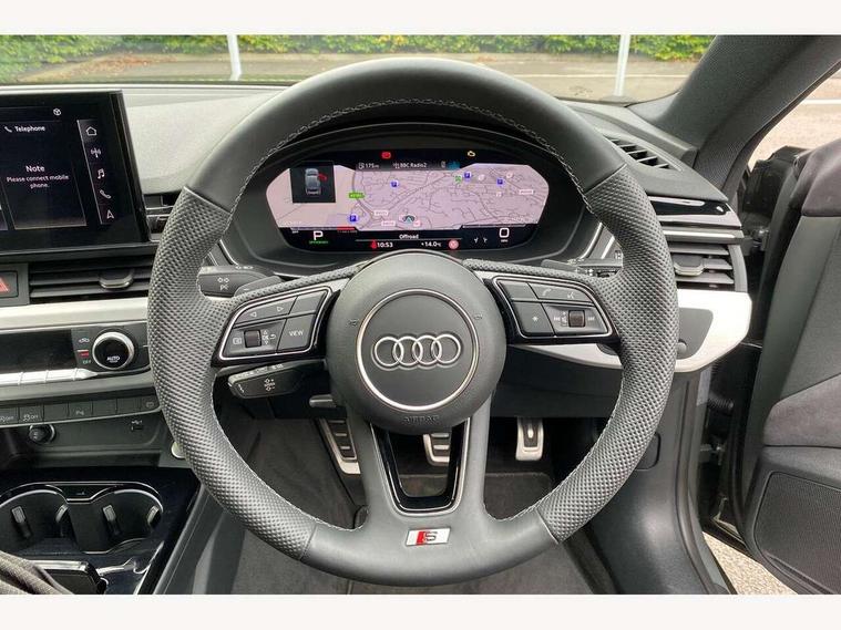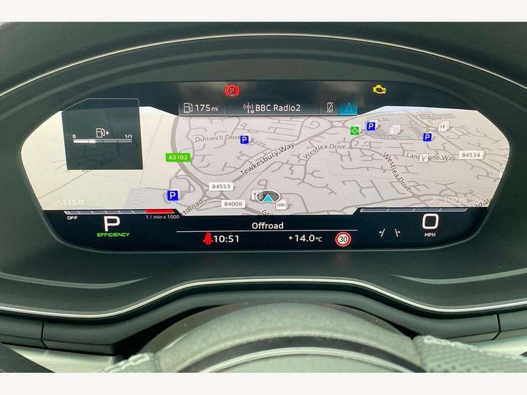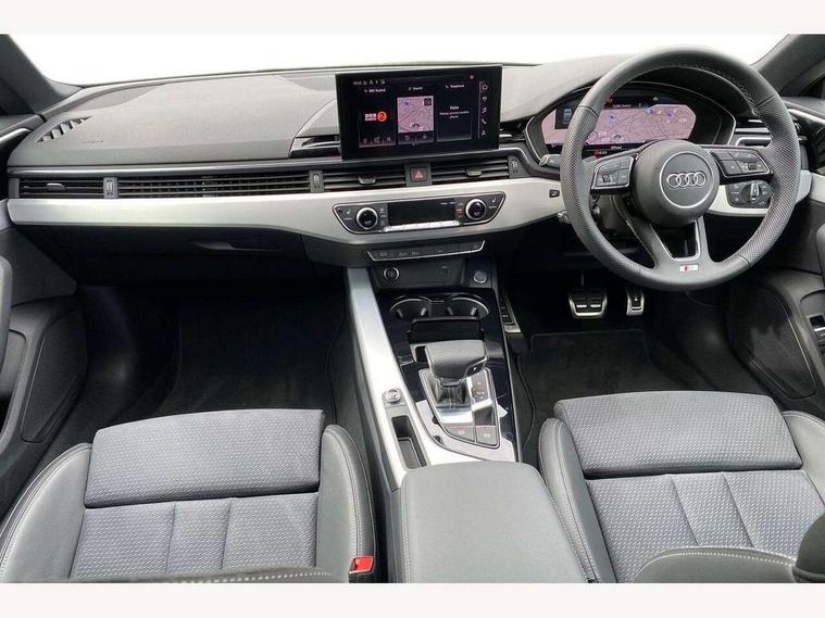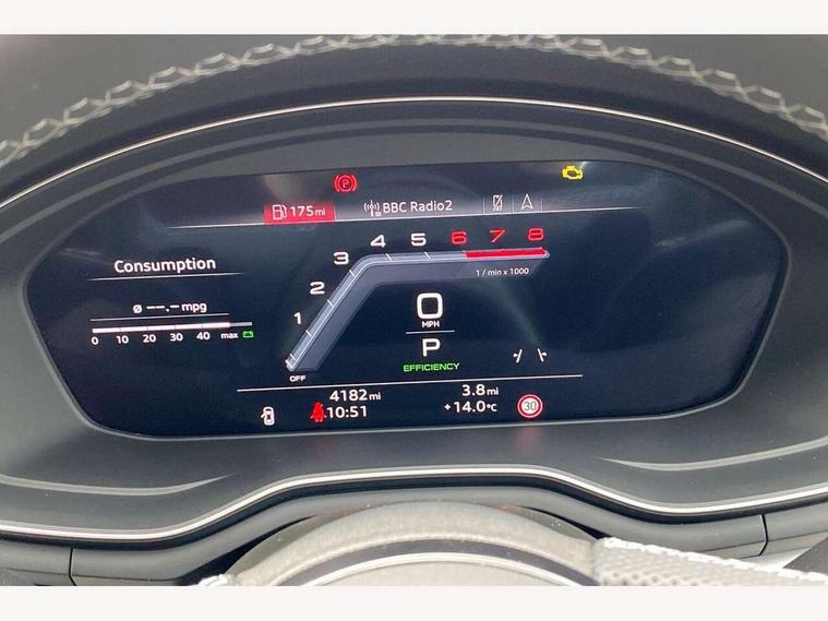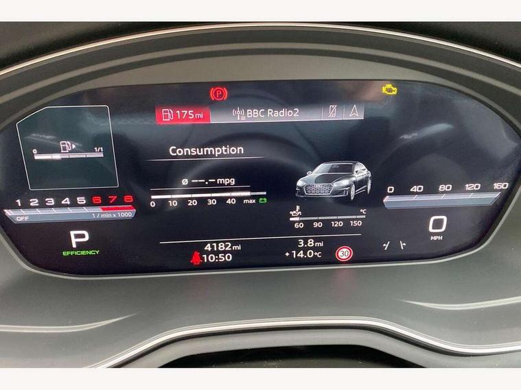 Audi connect safety and service (e-call), Audi drive select (Auto, Comfort, Dynamic, Efficiency and Individual), Audi smartphone interface, Audi virtual cockpit - 12.3" full colour digital instrument cluster, vehicle/engine speed, Radio/media information+Driver assistance systems, Automatic start-stop system with coasting functionality and efficiency programme, Bluetooth interface, Camera based traffic sign recognition, Electro-mechanical power steering, Email, calendar and text messages displayed via MMI, Front and rear parking sensors, Lane departure warning, MMI nav+ with MMI touch - 10.1" high resolution MMI display, touch sensitive, 3D map, route/country info, dynamic route guide, personal route assist, Power operated tailgate, Rear view camera, Service interval indicator, Voice control system, 54 litre fuel tank, Sports suspension lowered by 23mm, 8 passive loudspeakers, CD player, DAB digital radio reception, Two additional USB ports for rear passenger in rear centre console, Two SDXC card slots, Auto dimming door mirrors, Auto dimming rear view mirror, Body colour bumpers, Body colour door handles, Body colour front spoiler lip, Body colour side sill trim, Body coloured door mirrors, Electric adjustable heated door mirrors, Electric folding door mirrors, Electric front windows, Front fog lights, Honeycomb structure radiator grille in grained matt black, Kerb-view function for passenger side, LED headlights and rear lights with LED daytime running lights, LED side indicator lights integrated into door mirrors, LED third brake light, Matt aluminium silver tailpipe trim, Privacy glass, Rain and light sensors, Rear side wing doors, Rear wiper, S line badges on front wings, S line front and rear bumpers with side skirts, S Line rear diffuser in matt anthracite black with trim strip in matt aluminium silver, Side air inlets in grained matt black with matt aluminium silver inlay, Variable front intermittent wipers, Windscreen with acoustic glazing, 3 seat bench in 2nd row, 3 spoke high multifunction leather sport steering wheel with paddle shfit and S badging perforated leather grips, 4 way electric lumbar support for driver and front passenger, 40/20/40 split folding 3 seater rear bench seat, Adjustable steering column, Black carpets, Black cloth headlining, Black perforated leather gearknob, Contrast stitching on seats, steering wheel and gear lever gaiter, Deluxe 3 zone electronic climate control, Front centre armrest, Front head restraints, Front/rear floor mats, Heated front seats, Illuminated front door sill trim with S logo, ISOFIX child seat mounting and top tether, Luggage compartment mat, Manual seat adjustment, Rear centre armrest, Rear headrests, Single front passenger seat, Stainless steel pedals and footrest, Sunvisors with vanity mirrors, LED interior light pack - A5/RS5, 3x3 point rear seatbelts, 6 airbags - Driver, front passenger, curtain and side airbags, Attention and drowsiness assist, Electromechanical parking brake, Electronic Stabilisation Control (ESC) including ABS, ASR and EDL, Front passenger airbag deactivation, Height adjustable front seatbelts, Hill hold assist, Manual child lock in rear doors, Multi collision brake assist, Pop-up bonnet for pedestrian protection, Pre sense city, Seatbelt monitoring, Tyre pressure warning, Variable restraint system, Warning triangle and first aid kit, Anti theft alarm system, Anti theft wheel bolts, Immobiliser, Keyless Go, Remote central locking, Matt brushed aluminium inlays, Tool kit, Tyre repair kit,