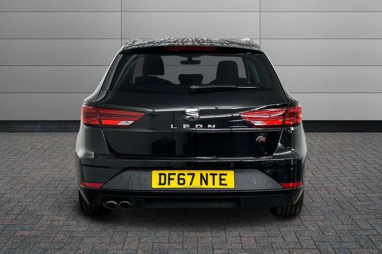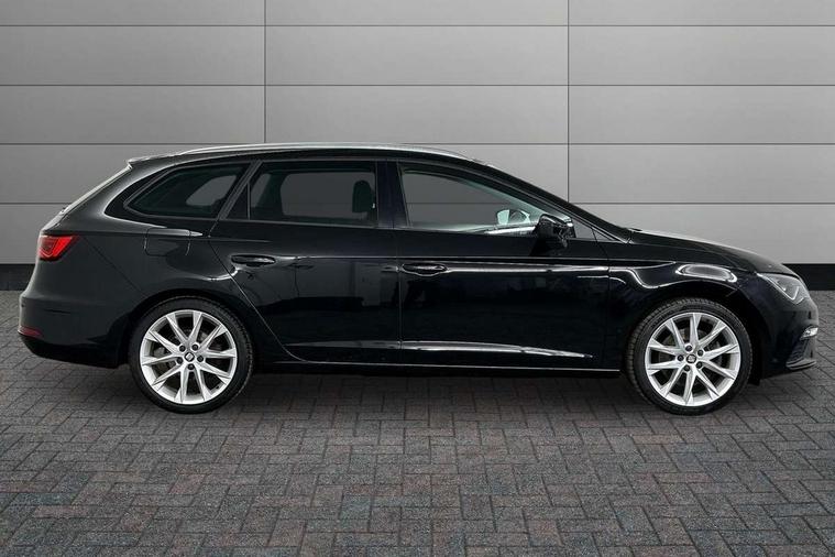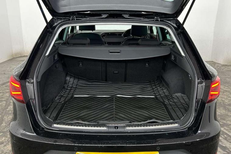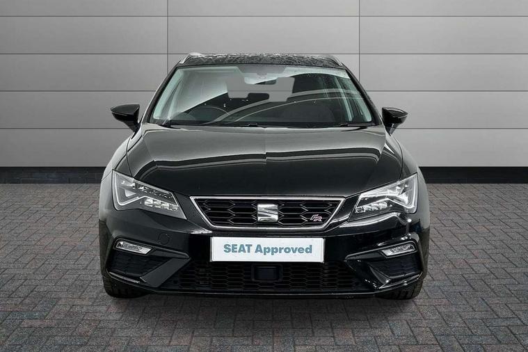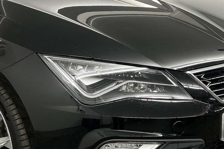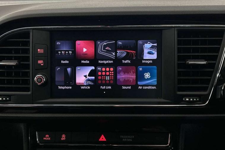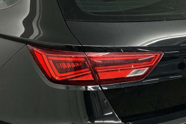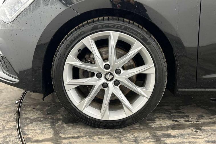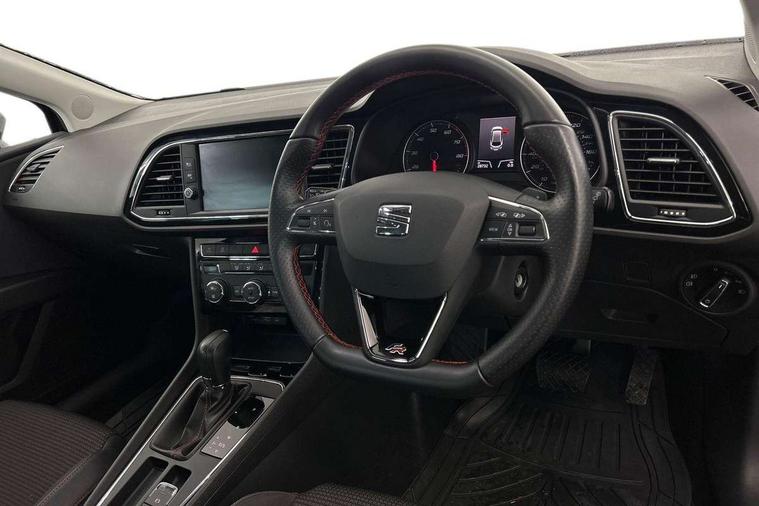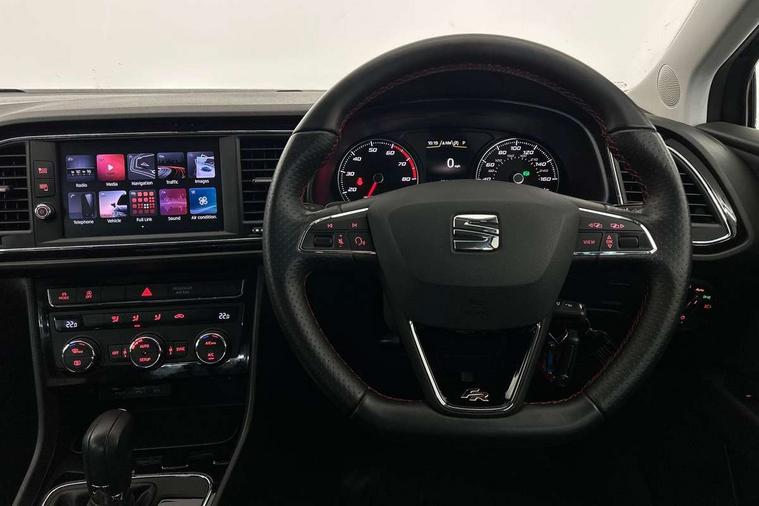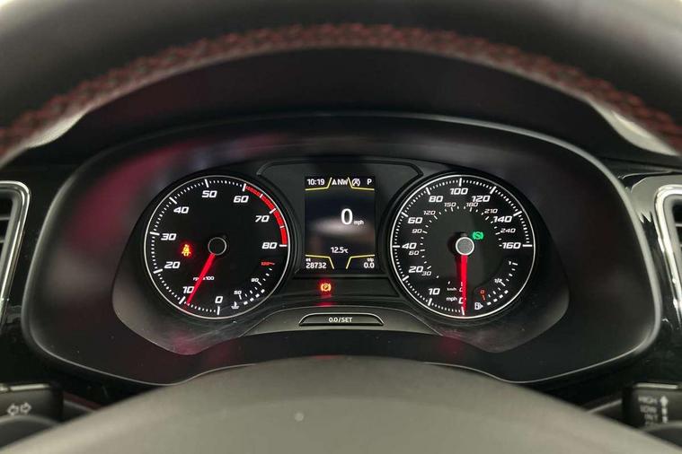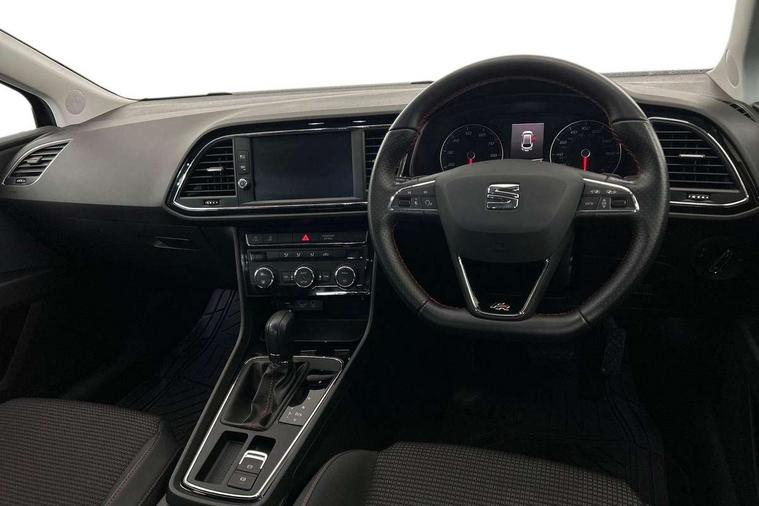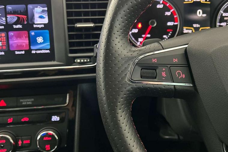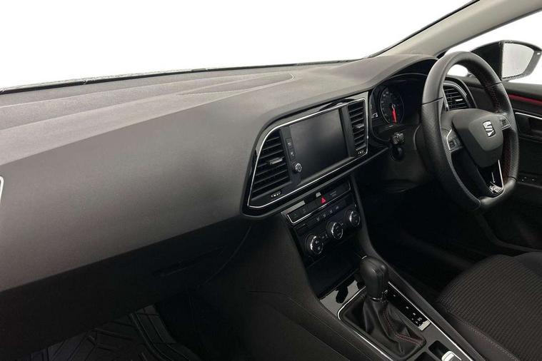'Lights On' Reminder warning buzzer, 8" touch screen, Bluetooth Handsfree Phone Connection, Low fuel warning light, Outside temperature gauge, Rear parking sensors, Remote fuel flap release, SEAT Drive profile, SEAT logo boot release, Service interval indicator, Touch screen display, Trip computer, Voice control system, XDS electronic differential lock, 2 USB ports, 2 USB sockets in rear, 2x SD card slot, Auxiliary input socket, Bluetooth audio streaming, DAB Digital radio, Radio/CD + MP3, Steering wheel mounted audio/phone controls, Aluminium front door sills, Black grille with chrome surround, Body colour door handles, Body coloured bumpers, Body coloured door mirrors, Dark tinted rear windows, Electric adjustable/heated/folding door mirrors, Electric front/rear windows with one touch/auto up/down, Electric headlamp adjustment, High gloss black finish B and C pillars, LED daytime running lights, LED front fog lights, LED Headlights, LED indicators in door mirrors, LED number plate light, LED tail lights, Rear wash/wipe, Reverse activated kerb-view adjustment on passenger's door mirror, Twin exhaust pipes, 12v power point in centre console, 3 height adjustable rear headrests, 60/40 split folding rear seat, Active head restraints, Additional heating and ventilation outlet in rear of centre console, Boot net, Chrome loading sill, Driver seat lumbar adjustment, Driver/passenger sunvisors with illuminated vanity mirrors, Dual zone climate control, Dust/pollen filter, Front adjustable head restraints, Front armrest with storage box, Front cupholders x 2, Front map reading lights, Front seat and rear pockets, Front sports seats, Front/rear floor mats, Height/reach adjust steering wheel, Illuminated door sills, Illuminated glovebox, Instrument lighting with brightness control, Leather handbrake, Luggage compartment cover, Luggage tie-down hooks, Passenger seat height adjuster, Passenger seat lumbar adjust, Perforated leather steering wheel with red stitching + gear knob, Rear reading lights, Rear top tether child seat ISOFIX attachment, Rear window curtains, Steering wheel gearshift paddles, Storage boxes under front seats, 3 point seatbelts on all rear seats, ABS + traction control, Child proof door locks, Collision mitigation braking system, Curtain airbags, Driver/Front Passenger airbags, Drivers knee airbag, Electronic parking brake with auto hold, ESP+EBA, Front assist including city emergency braking, Front seatbelt pretensioners, Front Seatbelt warning, Front side airbags, Hill hold control, Passenger airbag deactivation system, Tyre pressure monitoring system, 2 folding remote keys with window open/close function, Engine immobiliser, Locking wheel bolts, Remote central locking + deadlocks, Volumetric alarm with back up horn, Chrome interior trim,