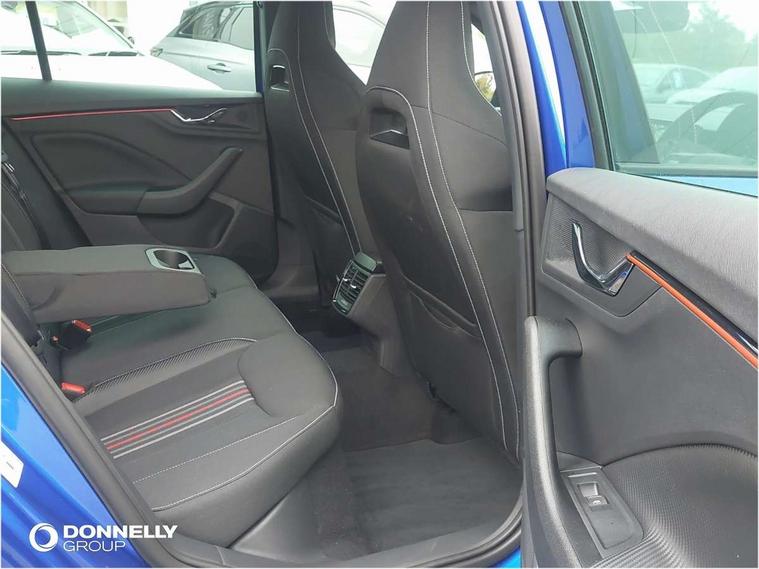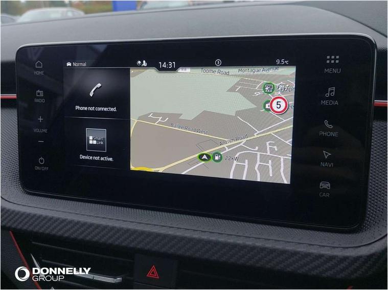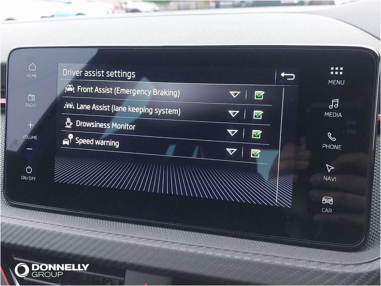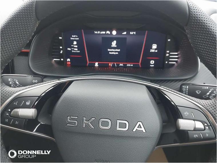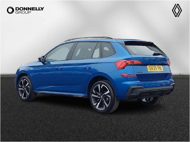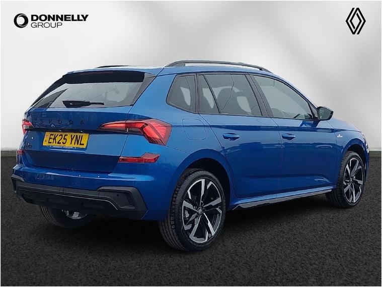 Advanced driver attention and drowsiness monitor, Bluetooth system, E-call, Front assist system, PAS, Rear parking sensors, Rear view camera, Service indicator, Speed limiter, Traffic sign recognition, Virtual cockpit with 10.25" display, Voice control system, Wireless smartlink, 4 USB C ports, 8 Speakers, 9.2" Skoda navigation display, DAB Digital radio, Auto dimming rear view mirror, Automatic headlight control with coming home and leaving home feature, Black door mirrors, Black radiator grille, Black rear diffuser, Black roof spoiler, Body colour bumpers, Body colour door handles, Boot lettering in black, Extended tailgate glass, Front and rear electric windows, Heated rear window, LED daytime running lights, LED high beam, LED low beam, LED third brake light, Light sensors, Monte carlo plaque, Panoramic sunroof with black roof rails, Privacy glass, Rear side wing doors, Rear wiper, Ticket holder inside windscreen, 12V socket in luggage compartment, 3 seat bench in 2nd row, Aluminium pedals, Ambient lighting in white/red, Art leather carbon decor inserts, Art leather carbon door inserts, Black roof lining, Cargo elements, Chrome inner door handles, Driver and passenger sun visors with vanity mirror, Dual zone climate control, Front and rear roof lights, Front centre armrest, Front head restraints, Glove compartment with illumination, Height adjustable driver seat, Height adjustable front passenger seat, Ice scraper, Inner circulation control with pollen filter, ISOFIX on front passenger seat, Isofix preparation for back seats, Leather gearknob and handbrake lever, Manual lumbar support for front seats, Monte Carlo cloth upholstery, Net package and top tether hooks in boot space, Net under rear shelf, Pocket on the back of both front seats include mobile phone pockets, Rake/reach adjustable steering wheel, Reading lights, Rear centre armrests, Red hotstamping, Single front passenger seat, Sports seats, Textile floor mats, Third rear headrest, Top tether for front passenger seat, Umbrella in driver's door, Light and view plus package - Kamiq, 3x3 point rear seatbelts, Airbags - driver and front passenger, Disc brakes, ESP, Extended and predictive pedestrian/cyclist protection, Front passenger airbag deactivation switch, Front side airbags with curtain airbags, Hill hold control, Manual leather parking brake, Manual rear child locks, One tone horn, Seatbelt reminder for driver an co-driver, Traction control, Tyre pressure monitor, Anti-theft alarm system with interior monitoring, backup horn, towing protection and remote central locking with SAFE system, Anti-theft wheel bolts, Electronic engine immobilizer, 18" Ursa black diamond cut alloy wheels,