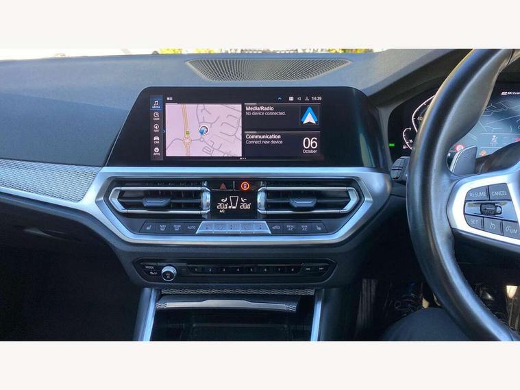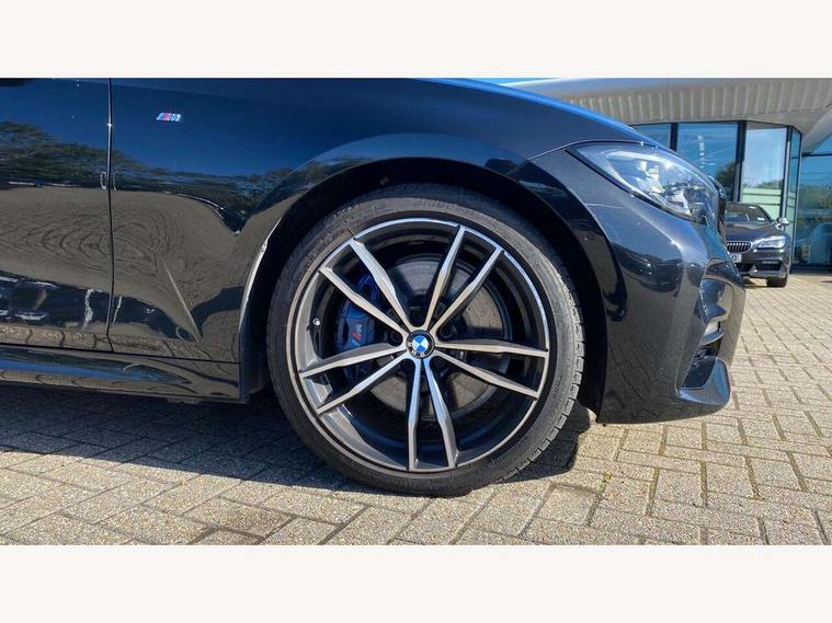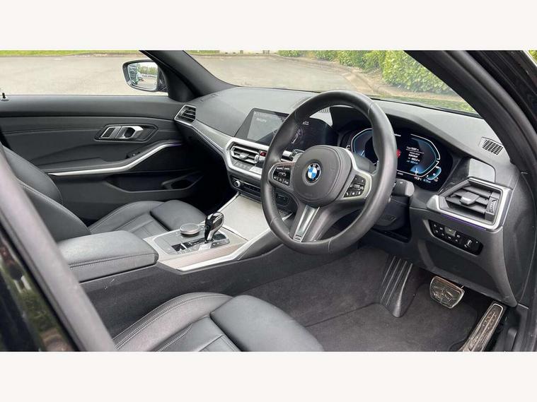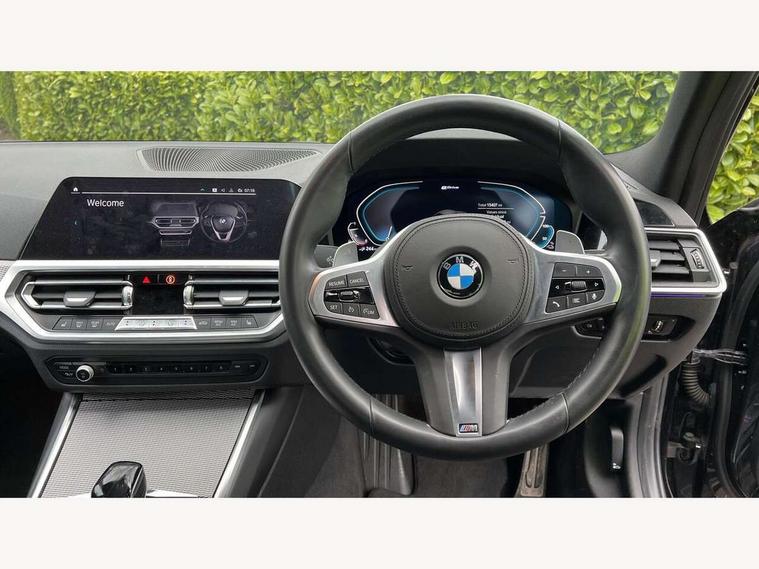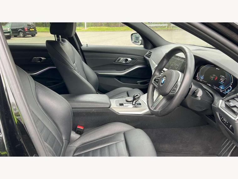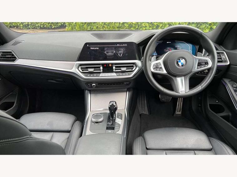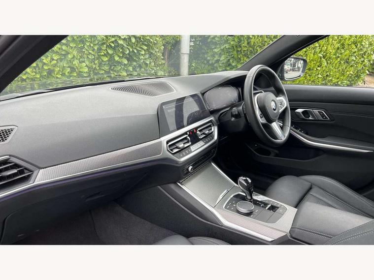 Active guard plus, Attentiveness assist, Auto start-stop, BMW Live Cockpit Professional Nav with 12.3" instrument display + 10.25" display, Intelligent Voice Assist, BMW OS 7, HDD, 2USB, 4G LTE connect, BMW service history, BMW Teleservices, Brake pad wear indicator in front and rear, Check Control warning system for monitoring of lights and door/luggage compartment open warning, Condition based service, Electric power steering with Servotronic steering optimised at all speed ranges, iDrive controller on centre console, Instrument cluster with speedometer with mph readout, tachometer, fuel gauge and oil temperature gauge, Integrated owners handbook, Oil sensor for level and grade, warning by check control system, On board computer - average speed+fuel consumption, service interval, clock/date, odometer/trip meter, outside temperature display and ice warning, Optimum shift indicator, Personal Profile - automatic lock when driving away selectable, Balanced 50/50 weight distribution, Battery cut-out switch, Drive performance control - ECO PRO, comfort and sport modes, Petrol Particulate Filter, Stroke dependent dampers, DAB tuner, Electronic service booklet, Acoustic glazing, Active airstream chrome frame kidney grille with 8 high gloss black vertical slats, Automatic headlight beam throw control with load dependent regulating reaction, dynamic compensation of braking dive and acceleration squat, Black roof mouldings, Body colour door handles, Body colour front and rear bumpers, Body colour fuel filler flap, Body colour mirror caps with bottom segment in matt black, Dynamic brake lights, Electric windows - front and rear, with open/close fingertip control, anti-trap facility and comfort closing, Exhaust tailpipe - split left and right, Exterior mirrors - electrically folding with anti-dazzle, Fading support, Front and rear bumper system with replaceable deformation elements, Front black door sill finishers with BMW designation, Green tinted heat protection glazing, High gloss shadow line exterior trim, Interior rear view electrochromatic mirror with automatic anti dazzle function, LED daytime running lights, LED front fog lights, Lightweight engineering, M designation on front side panels, left and right, Matt black exterior B pillar, Model designation on right side of tailgate, Rain sensor with automatic headlight activation, Shark fin antenna, Two part LED tailights in L-shape with components in smoked glass, brake light, LED turn indicator and rear fog light, Visible VIN plate, Welcome lights in interior and door handle area, Windscreen wipers with integrated washing jets, 12V power socket in front storage compartment, 2 front cupholder in centre console with clamping elements and matt black inlay, 3 rear seats with non folding headrests with 3 point seat belts, 3 zone automatic air conditioning, 4 pieces lashing eyelets in luggage compartment, 40:20:40 split folding rear seat with loading system, Ambient lighting with welcome carpet light, Anthracite headlining, Armrest integrated in front and rear door trim + front centre console armrest, Centred top Luggage compartment lights, Four grab handles integrated in roof lining, Front and rear door exit lighting (left / right), Front and rear door pockets, Front and rear reading lights, Front and rear velour floor mats, Front head restraints, Front sport seats, Heated driver and front passenger seats, Height adjustable mechanically and infinitely variable steering column, Illuminated armrest storage compartment, Illuminated glove compartment with separate small compartment, Interior lighting - front centre over interior mirror with soft light, rear centre and front and rear footwell lighting, M sport leather steering wheel, Make-up mirror lights, Rear centre armrest with 2 cupholders, Rear centre console with storage compartment and ventilation grille, Sunvisors with vanity mirrors and ticket pocket, Toolkit located in luggage compartment, Connected pack professional - 3 Series Saloon/Touring, M sport exterior styling pack - 3 Series Saloon/Touring, 2 tone horn, BMW emergency call, Brake energy regeneration, Braking pre-tensioning, Child proof locking system in rear door, Child seat ISOFIX attachment rear outer seats, Coasting in idle in ECO PRO mode, Crash sensor activating of airbags, Unlocking doors, hazard warning lights, fuel cut off, interior lighting+activation of safety battery terminal clamp, Driver and front passenger side airbags, integrated in the door side seat backrest bolsters for all seat variants, Driver/Front Passenger airbags, Dry braking, Dynamic brake control, Dynamic stability control + (DSC+) - Anti-lock Braking System (ABS) with brake assist and cornering brake control + Automatic Stability Control (ASC), Dynamic Traction Control - DTC, Electromechanical parking brake including automatic hold function and automatic release of the parking brake when pulling away, Electronic differential lock control (EDLC), Front passenger manual airbag deactivation, Head airbags for all 4 outer seats, Hill start assist, Seat belt security check for driver and front passenger, Side impact protection, Three 3 point seat belts on all seats including front belt stopper, pyrotechnic belt tensioners and belt force limiters, Tyre pressure monitoring with three level warning strategy, Ventilated front and rear disc brakes, Warning triangle and first aid kit, Alarm system (Thatcham 1) with remote control and electronic engine immobiliser, Central locking switch for all doors, fuel filler cap and luggage compartment, Remote control with integrated key one button open/close vehicle and windows, sole opening of the luggage compartment lid and panic mode, Start/stop button with Comfort Go keyless engine start and auto Start/stop deactivation button, Vehicle key with M specific designation, Reduced rolling resistance tyres,