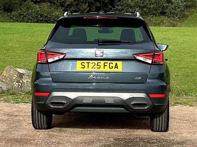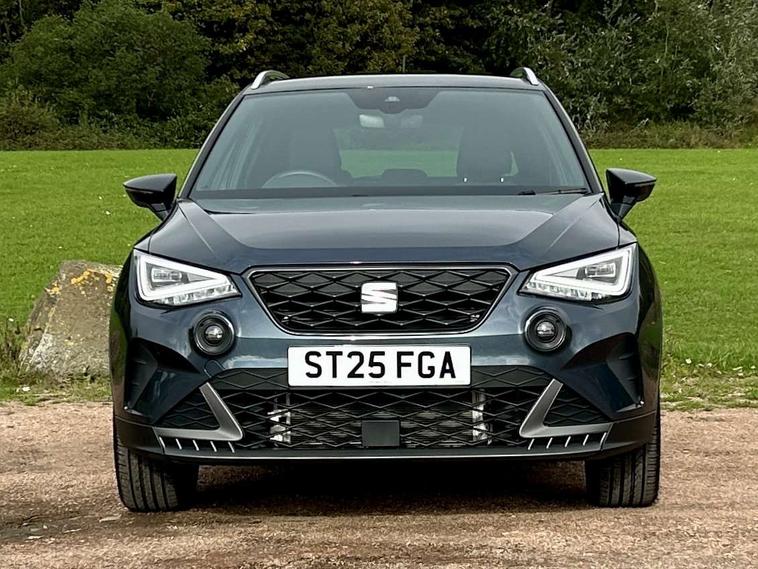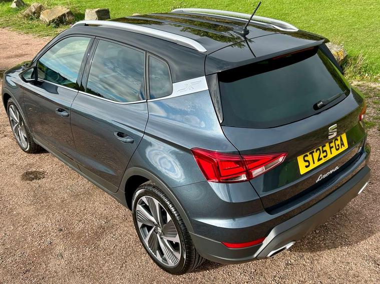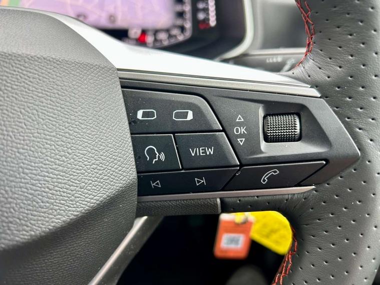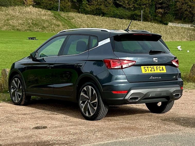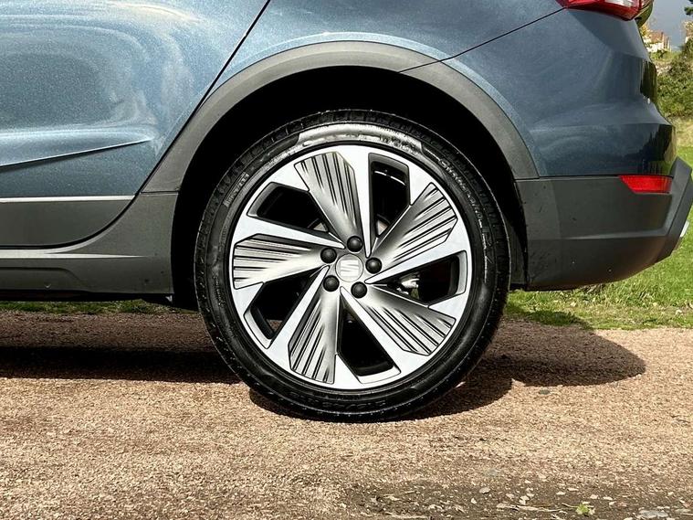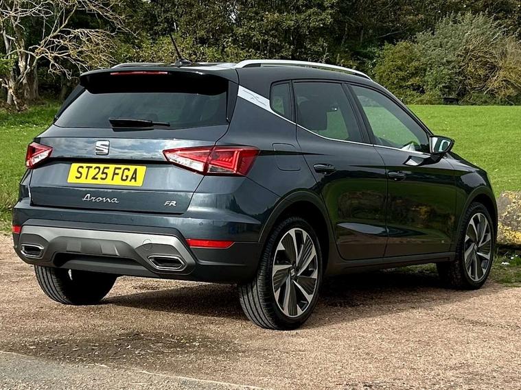 'Lights On' Reminder warning buzzer, 10" Digital cockpit, Digital clock, E-call, Electric speed sensitive power steering, Full link smartphone integration with mirror link, wireless apple carplay, Google android auto + USB Type C cable for apple and android devices, Lane keeping system, Low fuel warning light, Outside temperature display, RPM counter, SEAT Drive profile - Four different models normal-sport-eco-individual, steering response, throttle response, Trip computer, Wireless phone charger, 6 speakers, 9.2" colour touchscreen with navigation system, voice control and USB port (type c), Bluetooth interface for hands free and audio streaming, DAB digital radio and AM/FM radio, Steering wheel mounted audio controls, Anti theft roof antenna, Auto dimming interior rear view mirror, Automatic activation of hazard warning lights, Body coloured bumpers, Body coloured door handle inserts, Chrome roof rails and window surrounds, Dark tinted rear windows, Electric front/rear windows, Electrically adjustable, heated and folding door mirrors, Front fog lights with cornering function and rear fog light, FULL LED automatic headlights with dynamic headlight range control, coming and leaving home, LED daytime running lights, LED rear tail lights and licence plate lights, Protective side mouldings, Rain sensing wipers, Rear side wing doors, Rear spoiler, Rear window wash/wipe, Roof colour door mirrors, Third brake light, Twin exhaust pipe styling hidden exhaust pipe, Visible VIN plate, 2 cupholders, 3 seat bench in 2nd row, 60/40 split folding rear seat, Aircare filter, Black interior roof, Double boot floor, Driver sunvisor with covered mirror + card holder, Dual zone climate control, Front comfort seats, Front courtesy light with front reading lights, Front seat back storage pockets, Gear shift indicator, Heated front seats, Height adjustable front seats, Height/reach adjustable steering column, Illuminated air vent surrounds, Illuminated boot, Instrument lighting with brightness control, Interior ambient lighting, Interior light in footwell, central console and door panel, ISOFIX points in outer rear seats with top tether anchorage points, Microsuede cloth upholstery, Passenger sunvisor with vanity mirror, Perforated flat bottomed leather steering wheel/gear knob/handbrake with red stitching and FR logo, Potentiometer, Single front passenger seat, Two front and three rear height adjustable headrests, Interior chrome pack - Arona, Safe and driving pack (S) - Arona, 3 point seatbelts on all rear seats, ABS, Active front headrests, Child locks on rear doors, Driver and front passenger airbags with front passenger airbag de activation, front side and curtain airbags, Emergency Brake Assist (EBA) and front assist, Front and rear seatbelt reminder, Hill hold control, Multi-Collision braking, Tiredness recognition system, Traction control, Tyre pressure monitoring system, Alarm with back up horn with tow away protection, Deadlock, Electronic engine immobiliser, Locking wheel bolts, Remote central locking, Titan black dashboard, 18" Performance Cosmo grey matt alloy wheels,