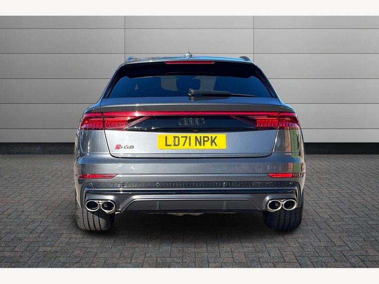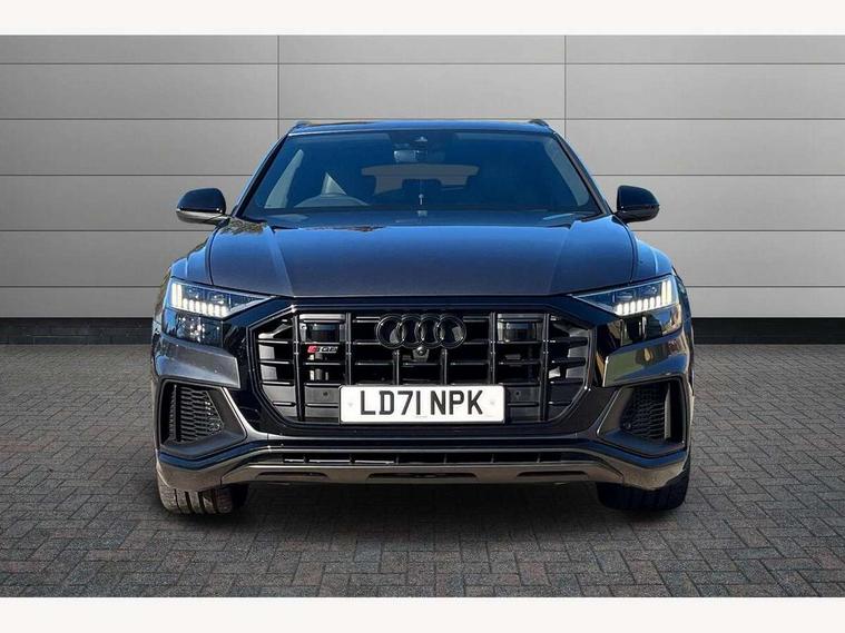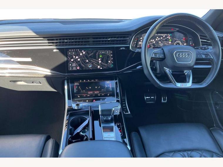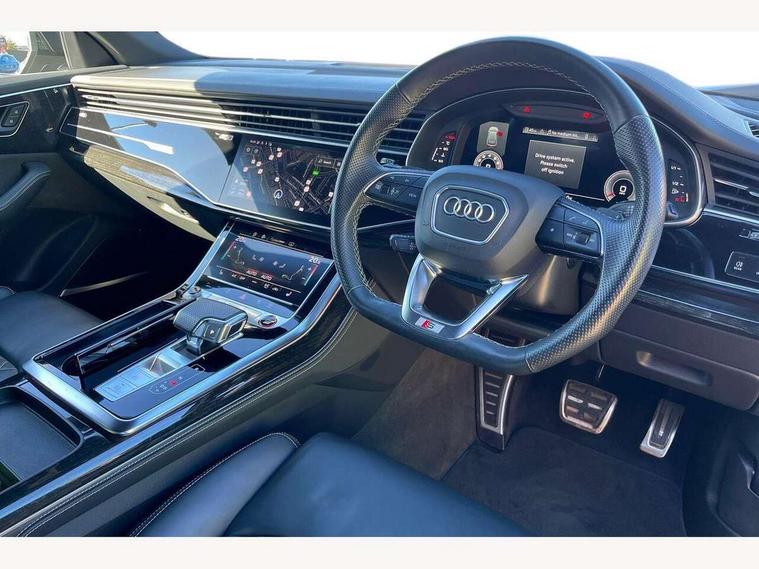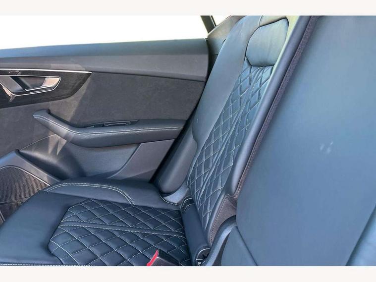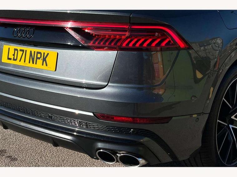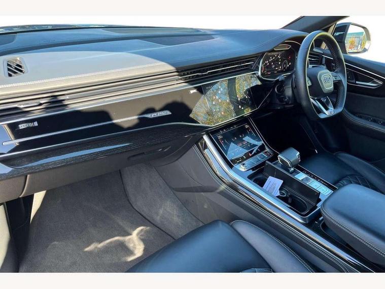 10.1" and 8.6" Dual colour touchscreens, All wheel steering, Audi connect safety and service (e-call), Audi connect with Amazon Alexa Integration, Audi drive select, Audi parking system plus includes 360 degree display with front and rear sensors, Audi virtual cockpit - 12.3" high resolution LCD display with fully customisable instrument cluster, Automatic start/stop system, Electro-mechanical PAS, Low washer fluid indicator, MMI - Multi Media Interface control system, MMI navigation plus with MMI touch, Natural voice recognition, On board computer, Operating buttons in black, glass look with haptic feedback, Power operated tailgate, Rear view camera, Service interval indicator, Smartphone interface includes wireless Apple carplay/Android Auto, 48V Mild hybrid technology, 85 litre fuel tank, Quattro all wheel drive with self locking centre differential, S specific Adaptive air suspension, Audi music interface with 2 USB ports with charge and data functions, Audi sound system with 6 channel amplifier, 180 watt amplifying capacity and 10 loudspeakers including subwoofer, Aux-in socket, DAB Digital radio, Acoustic windscreen, Audi Beam uses LEDs to project the Audi logo, Audi HD Matrix LED headlights with dynamic front and rear indicators, Auto dimming frameless rear view mirror, Body coloured bumpers, Coming/leaving home lighting function, Electric front+rear windows, Electrically folding auto dimming/adjustable/heated door mirrors with memory function, LED side indicators and kerb view function for passenger side, Gloss black finish for exterior Audi rings and SQ8 logo, Headlight washers, Heat insulating glass in windshield, LED signature daytime running lights, Platinum grey front spoiler lip and diffuser insert, Privacy glass - dark tinted rear and rear side windows from B-pillar backwards, Rain and light sensors, Rear wiper, S specific dual brach chrome tailpipes on both the left and right, S specific front and rear bumpers, S specific side skirts in matt selenite silver, Side air inlet grilles in matt titanium black, Trim and underbody protection in matt selenite silver, 4 zone deluxe automatic climate control, 4-way lumbar support for front seats, 40:20:40 split folding rear bench seat, Black cloth headlining, Comfort front centre armrest, Driver seat memory function, Electrically adjustable front seats, Front head restraints, Front/rear floor mats, Heated front seats, Illuminated door sill trims, ISOFIX child seat mounting for front passenger seat and 2 outer rear seats with top tether child seat mounting for all 3 rear seats, LED interior ambient lighting, Luggage compartment sill protection in stainless steel, Rear centre armrest with 2 cupholders, Rear headrests, Rear seat bench plus, Stainless steel pedals, Sunvisors with illuminated vanity mirrors, Upper and lower interior elements in leather, leather door armrests, Titanium Black Styling Pack - Q8, 3 point seatbelts on all seats, Audi pre sense front, Driver and front passenger, front side and curtain airbags, Electromechanical parking brake, Electronic Stability Control (ESC) including ABS, ASR and EDL, Front passenger airbag deactivation, Hill descent control, Hill hold assist, Predictive pedestrian protection, Seatbelt monitoring, Traction control, Tyre pressure loss indicator, Warning triangle and first aid kit, Anti theft alarm with tow away protection, Anti-theft wheel bolts and wheel loosening detection, Immobiliser, Keyless go with remote central locking, Polished oak trim with grey finish inlay, Tool kit, Tyre repair kit,