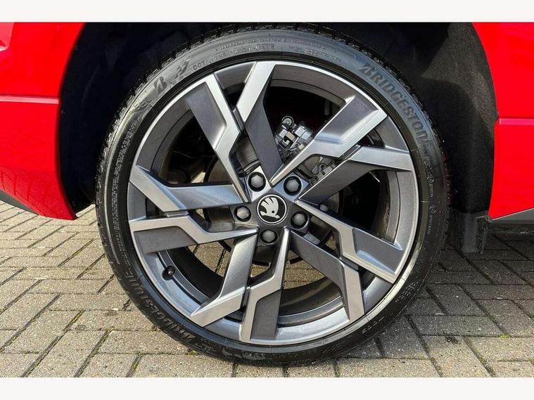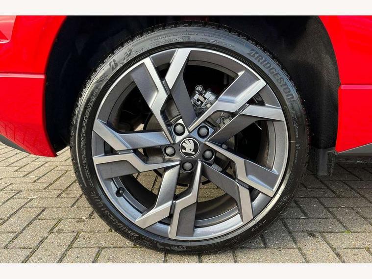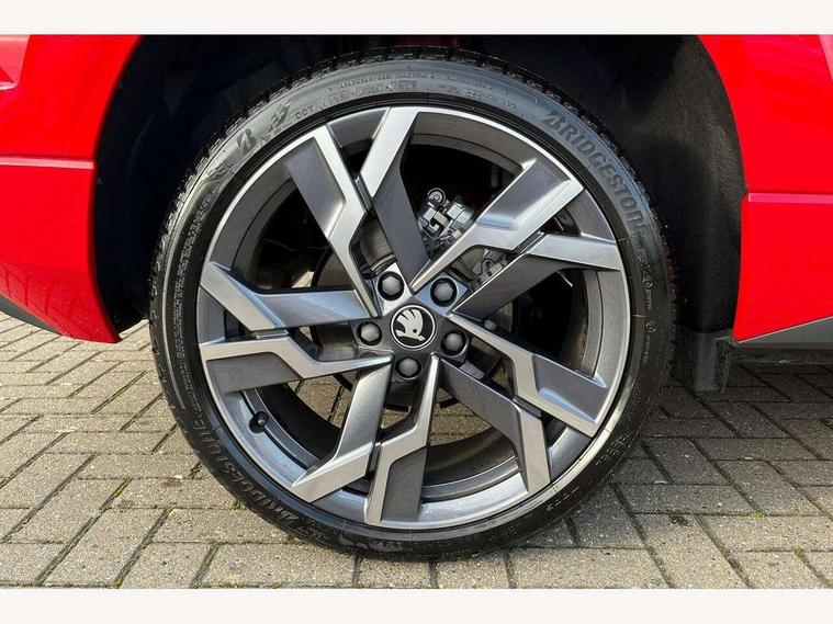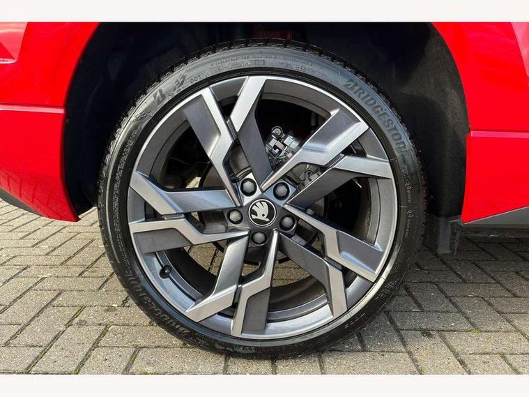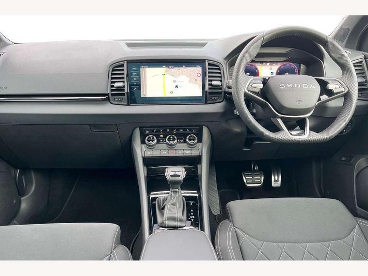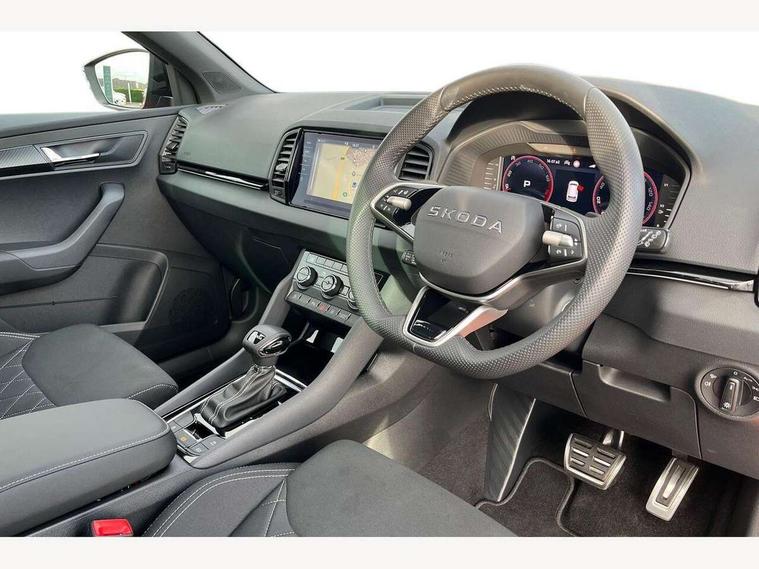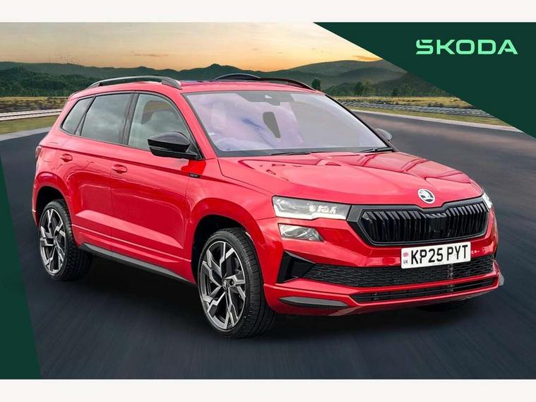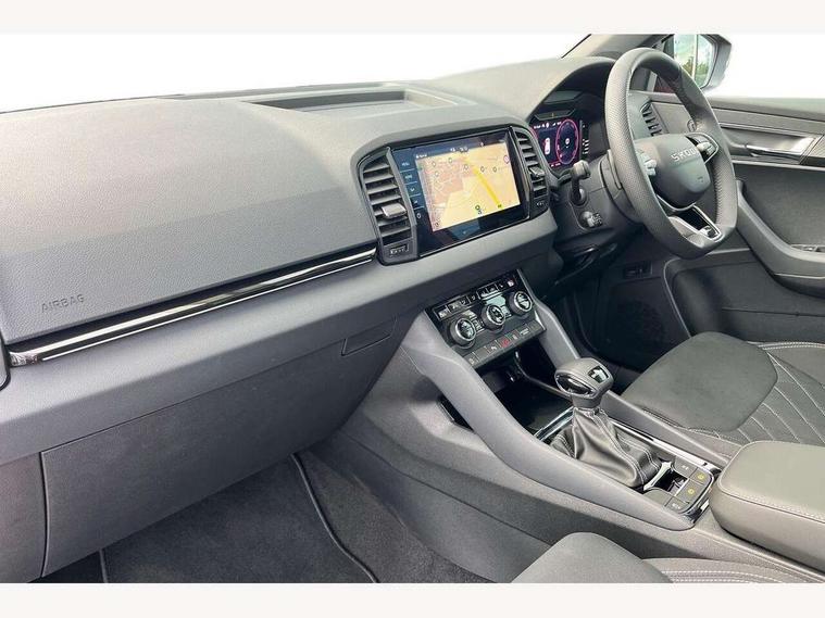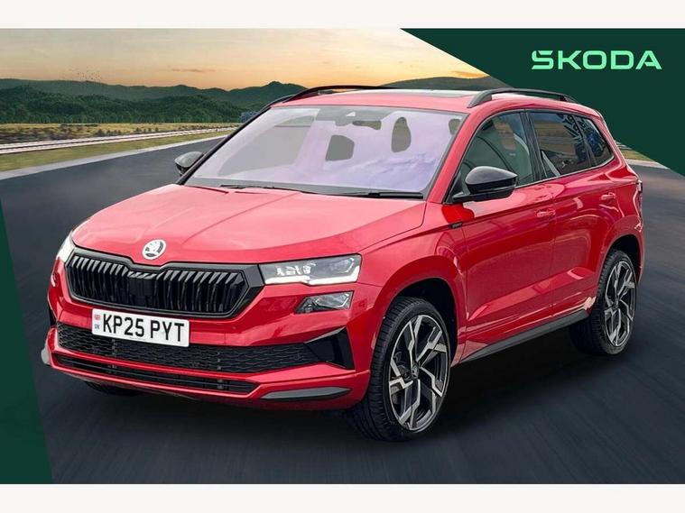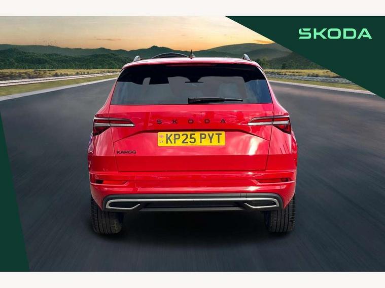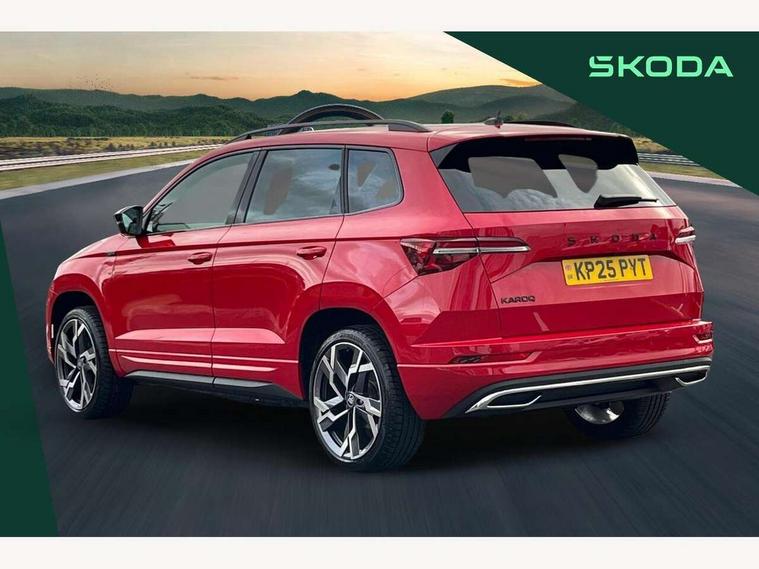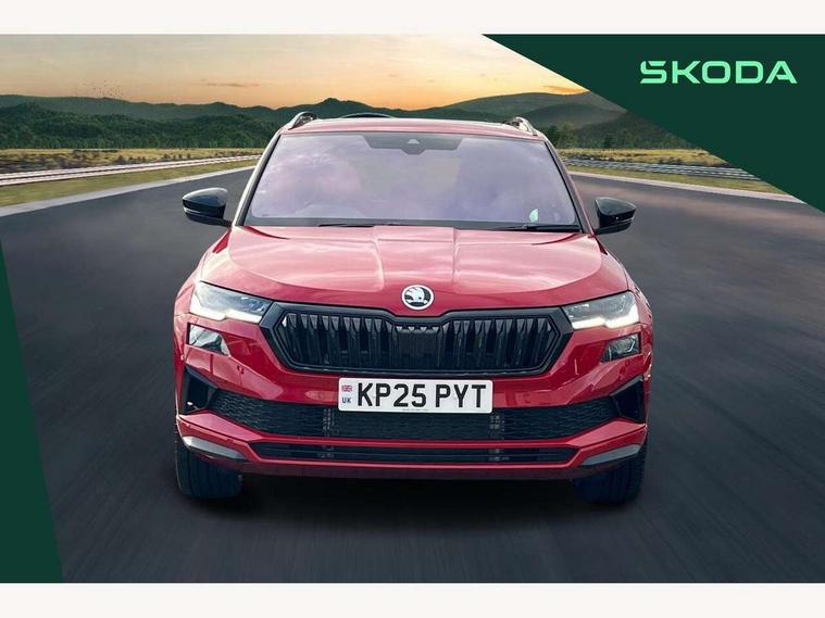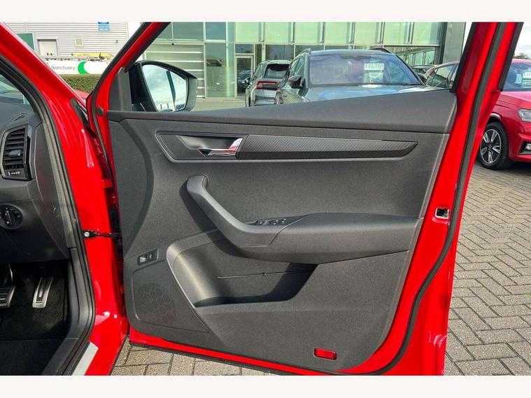 Advanced driver attention and drowsiness monitor, Emergency services call system, Outside temperature gauge, Sensor for driver assistance systems, Service interval indicator, SmartLink wireless for Apple and wired for Android, Start/stop system with regenerative braking, Traffic sign recognition, USB C Port x 2 in front centre console, Virtual Cockpit - 10.25" digital display, Virtual pedal with electrically operated boot door, Wireless smartphone charging, DAB radio with Bluetooth, USB connection, Acoustic glass, Aero front windscreen wipers with intermittent function, Auto dimming rear view mirror with light and rain sensors, Black door mirrors, Black electric window control buttons, Black radiator grille, Black roof rails, Body colour door handles, Electric front and rear windows with child proof lock, Extended rear roof spoiler, Front door steps with SportLine logo, Heated rear windscreen, LED daytime running lights, LED rear lights with high functionality welcome effect and dynamic indicators, Light assistant (coming/leaving home/tunnel light), Panoramic sliding sunroof, Plastic scuff plates in door apertures, Privacy glass, Protective door side sills in body colour, Rear diffuser, Rear side wing doors, Rear window wiper with washer system and intermittent control, Safety reflectors on front doors, Skoda lettering on tailgate in black, Sportline badge on front fender, Sports front and rear bumpers, Third brake light, Unique dark chrome design logo on alloy wheels, 1.5 litre bottle holders in driver and front passenger door panels, 12V socket in boot, 12v socket in front centre armrest with storage compartment and rear air vents, 2 x Tablet holder, 3 rear height adjustable headrests, 3 seat bench in 2nd row, 3 spoke sports leather heated multifunction steering wheel with DSG paddles, 4 foldable roof handles with rear coat hooks, Black floor carpet, Cargo elements in boot, Chrome inner door handles, Foldable hooks in the boot, Front head restraints, Height adjustable front three point seats belts with tensioners, Height/reach adjust steering wheel, Ice scraper, Illuminated glovebox, Illuminated luggage compartment, Isofix child seat preparation for front passenger seat, Isofix child seat preparation outer rear, Manual lumbar support for front seats, Pen holder, Pollen filter, Rear backrest release from boot, Rear boot cover, Rear package tray, Rear reading lights, Rear seats fixed folding and divided 60:40, Rubbish bin door, Safety vest holder, Single front passenger seat, Skoda lettering on steering wheel, Sportline decorative inserts, Storage box in upper central dashboard closed, Sunvisors with illuminated vanity mirrors, Textile floor mats, Ticket holder, Titan black interior ceiling, Umbrella under passenger seat, Under passenger seat storage compartment, Columbus pack - Karoq, LED Interior lighting pack with Skoda welcome logo - Karoq, Light Pack - Karoq, Non Smokers pack, Performance pack - Karoq, Winter plus pack with heated front and rear seats - Karoq, Automatic door unlocking in case of crash, Automatic fuel cut off in case of crash, Driver airbag, Electronic parking brake with auto hold function, Emergency rear braking signal, ESC (incl. ABS+MSR+ASR+EDS+HBA+DSR+RBS+MKB), Front side airbags, Head airbags, Hill hold control, Knee airbags, Passenger airbag with switch-off function, Pedestrian monitor, Seatbelt reminder signalisation and pretensioner for all seats, Three point seatbelts rear, Two tone horn, Tyre pressure monitor, Alarm with interior monitoring, back up horn and tilt sensor with safe function, Electronic engine immobiliser, Keyless entry and start/stop, Remote central locking with 2 remote folding keys, Black air vent surround, Black centre console, carbon door decor, Satin black dashboard, Satin black door trim, 19" Sagittarius anthracite alloy wheels, Anti-theft wheel bolts protection, Breakdown and tool kit,